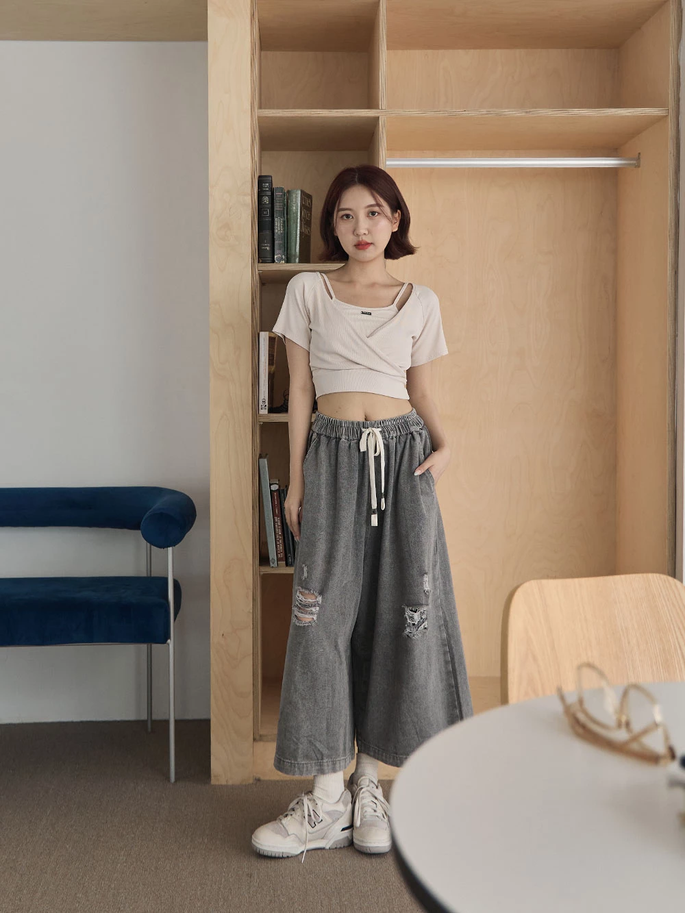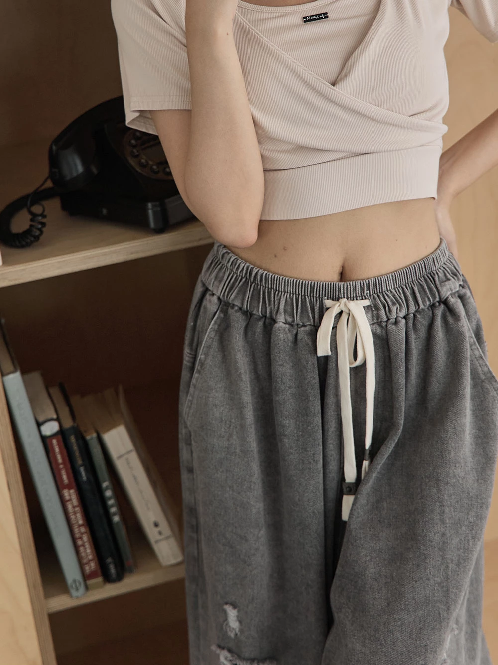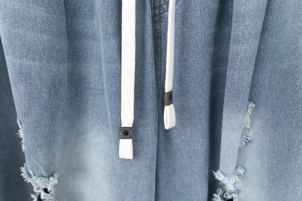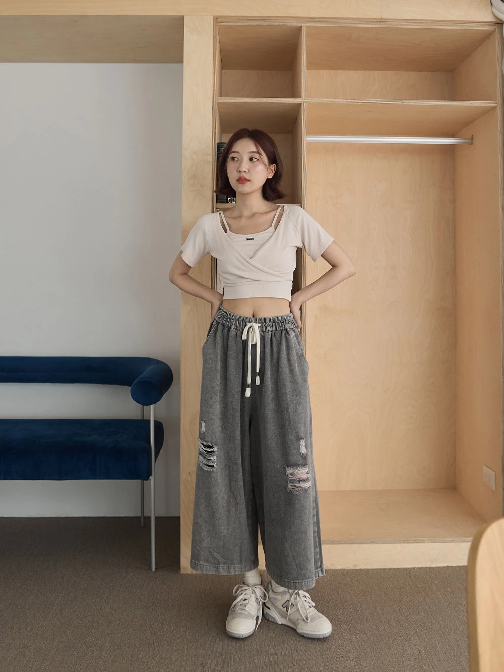 抓破造型八分牛仔褲