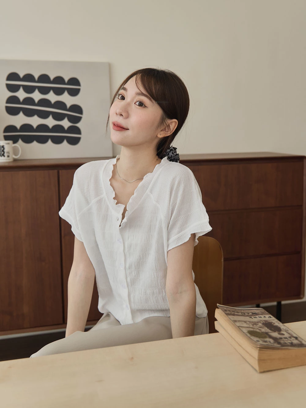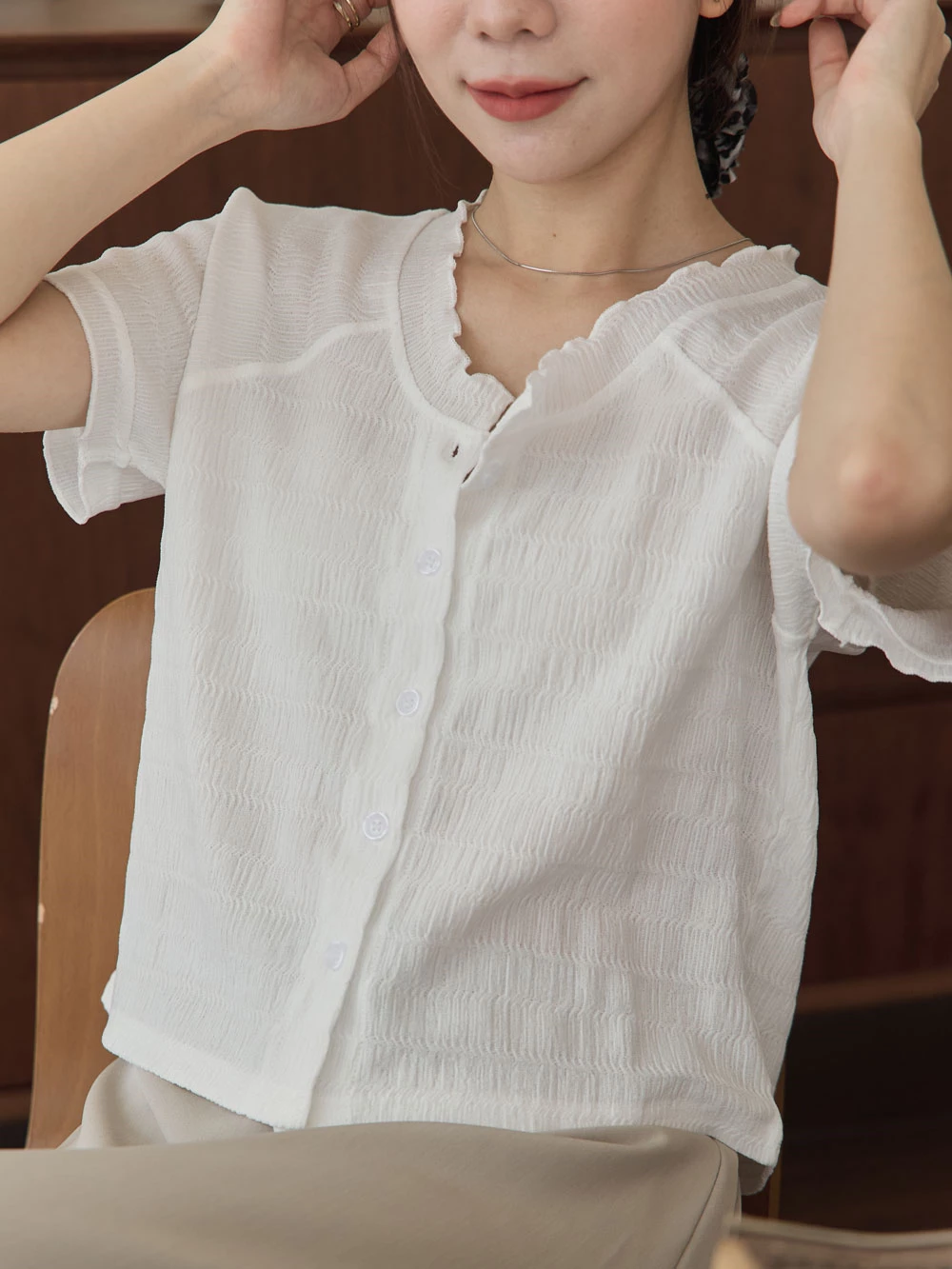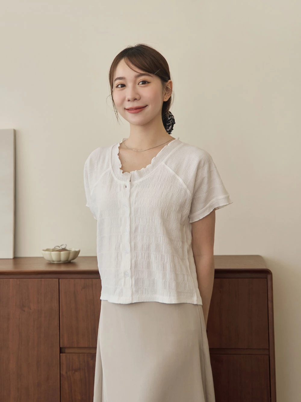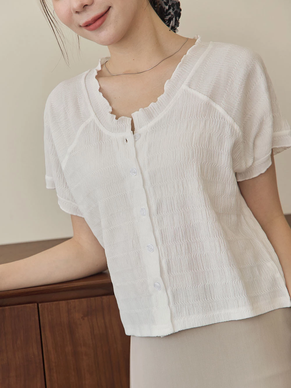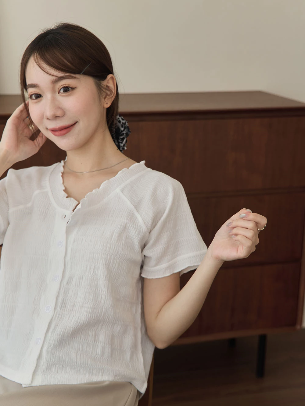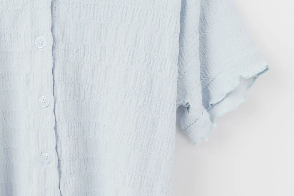 木耳邊圓領排釦上衣
