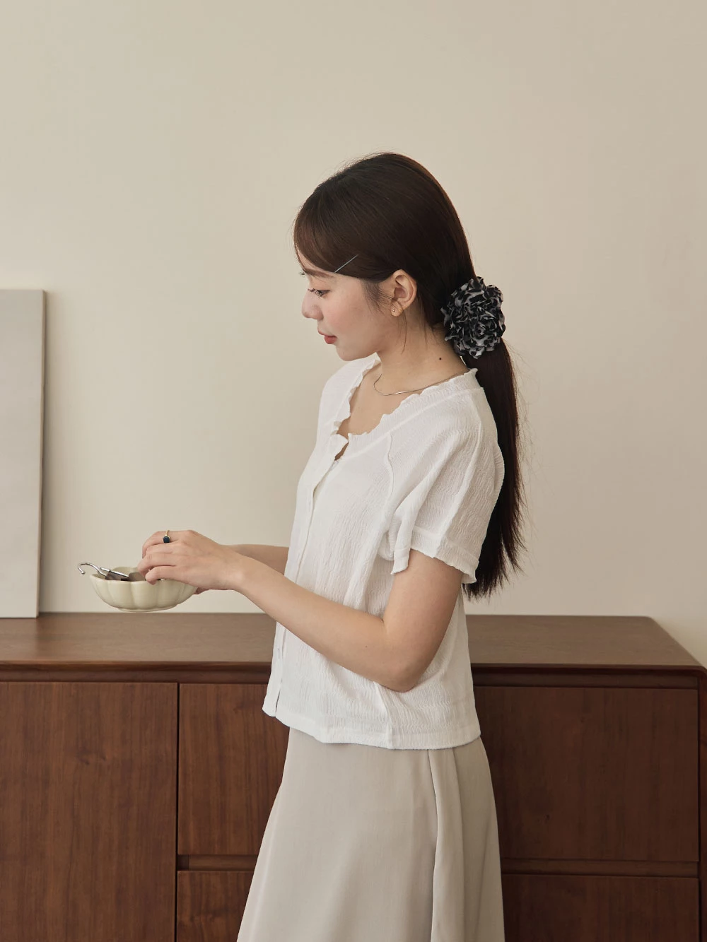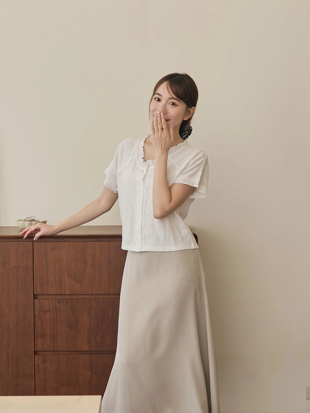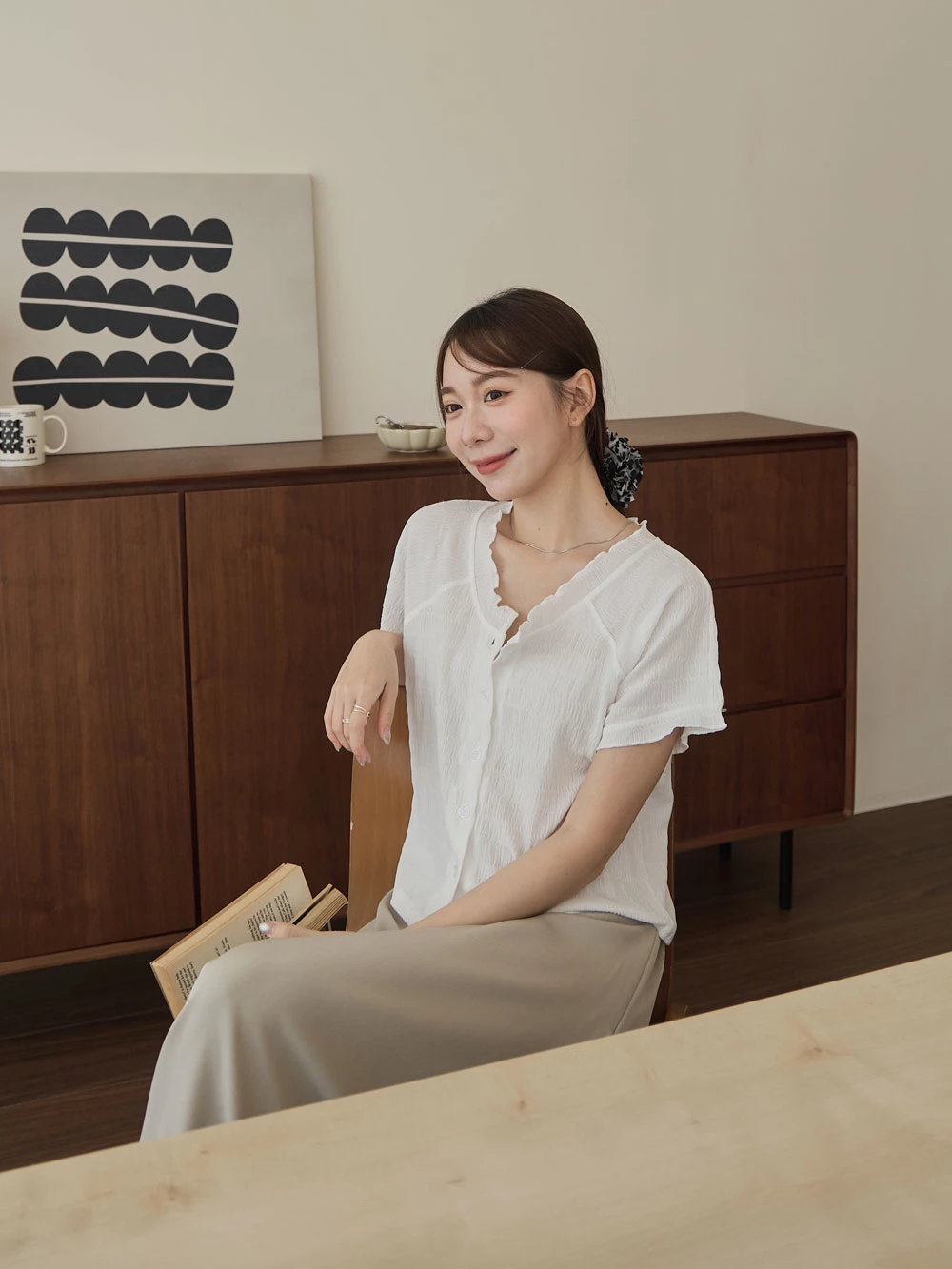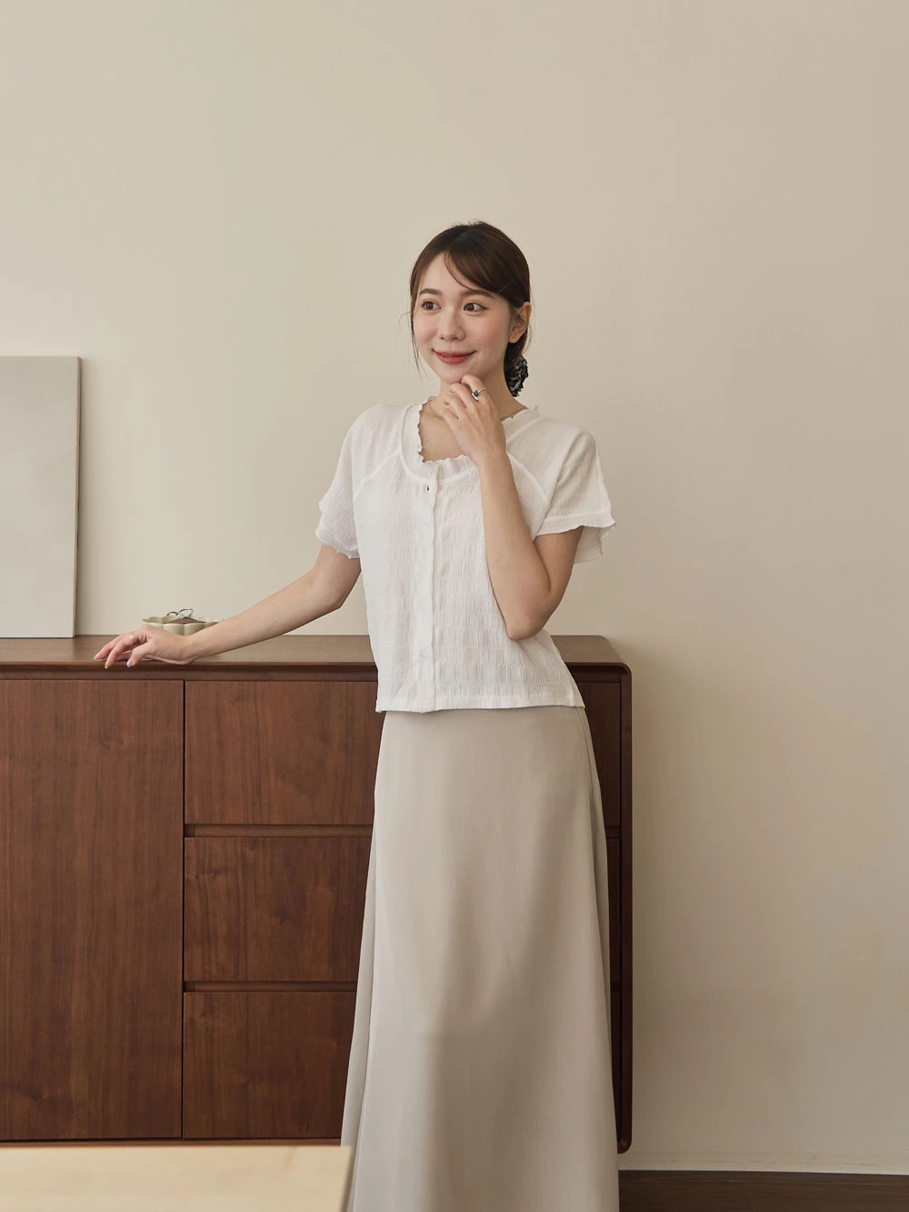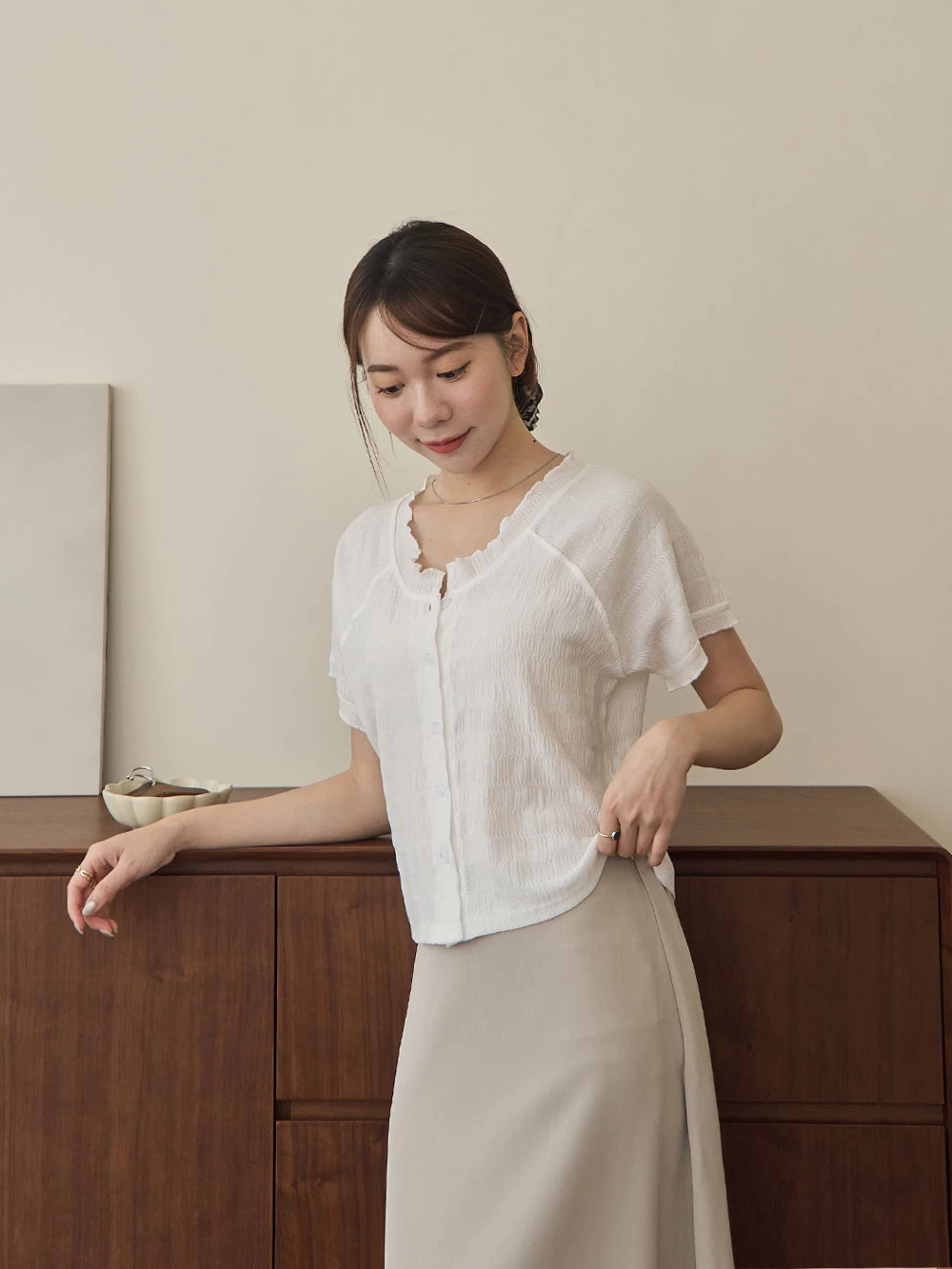 木耳邊圓領排釦上衣