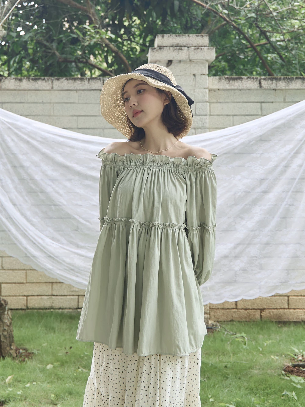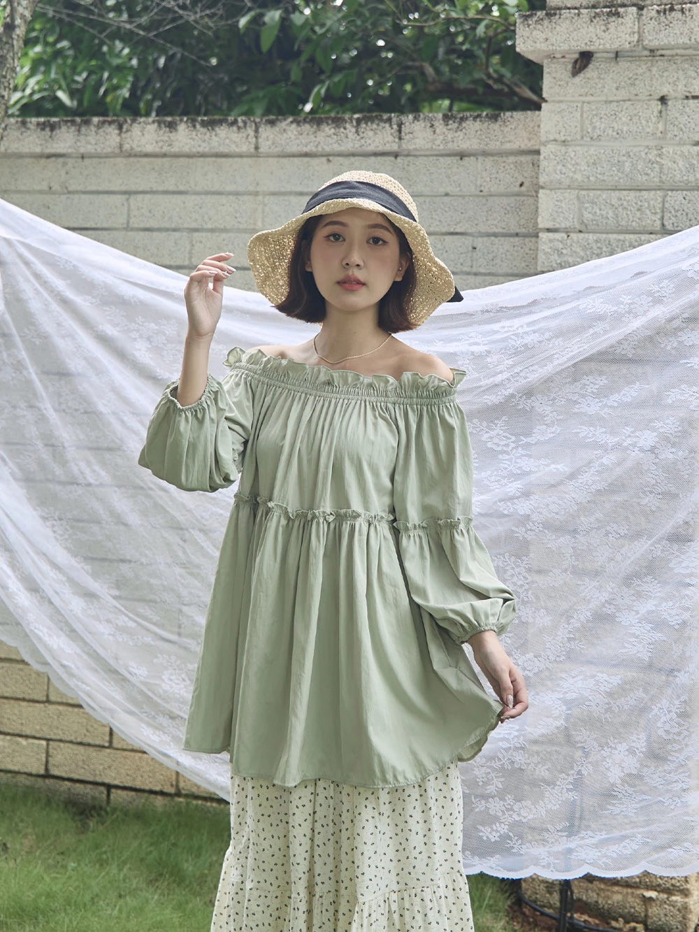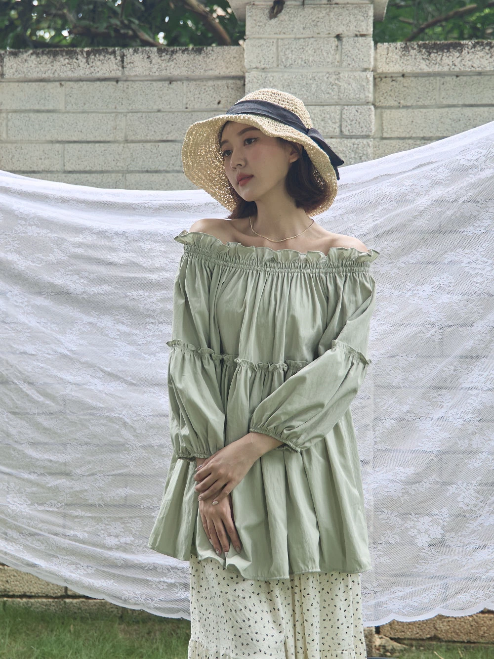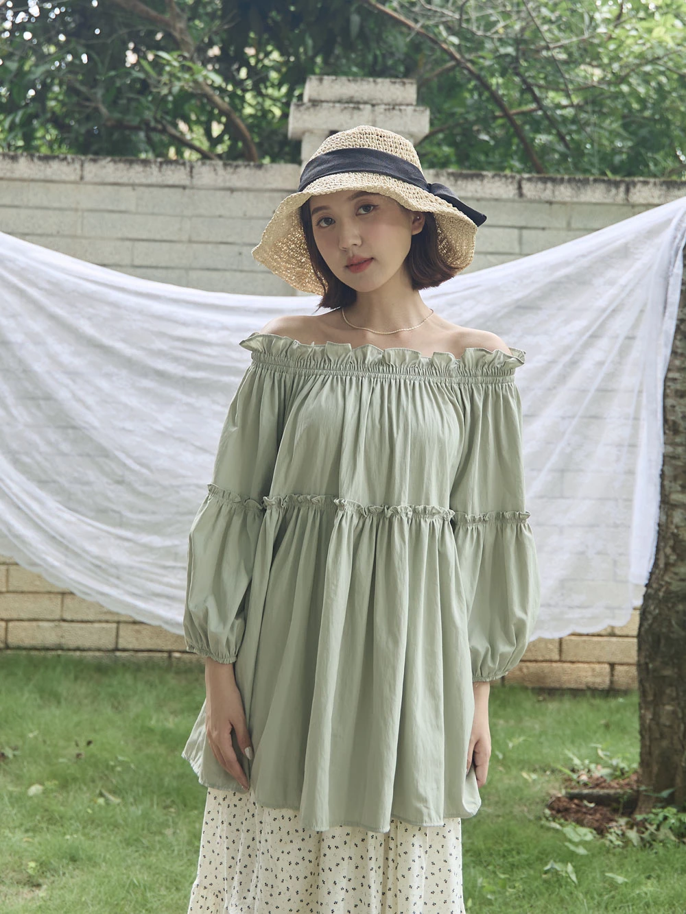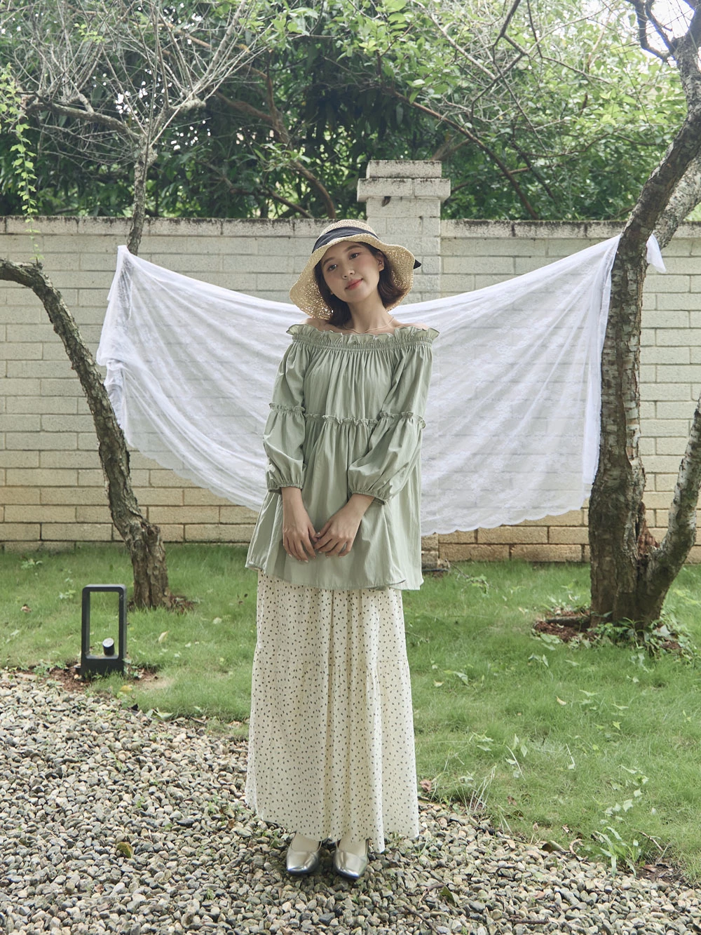 鬆緊一字領荷葉邊上衣 | Space Picnic