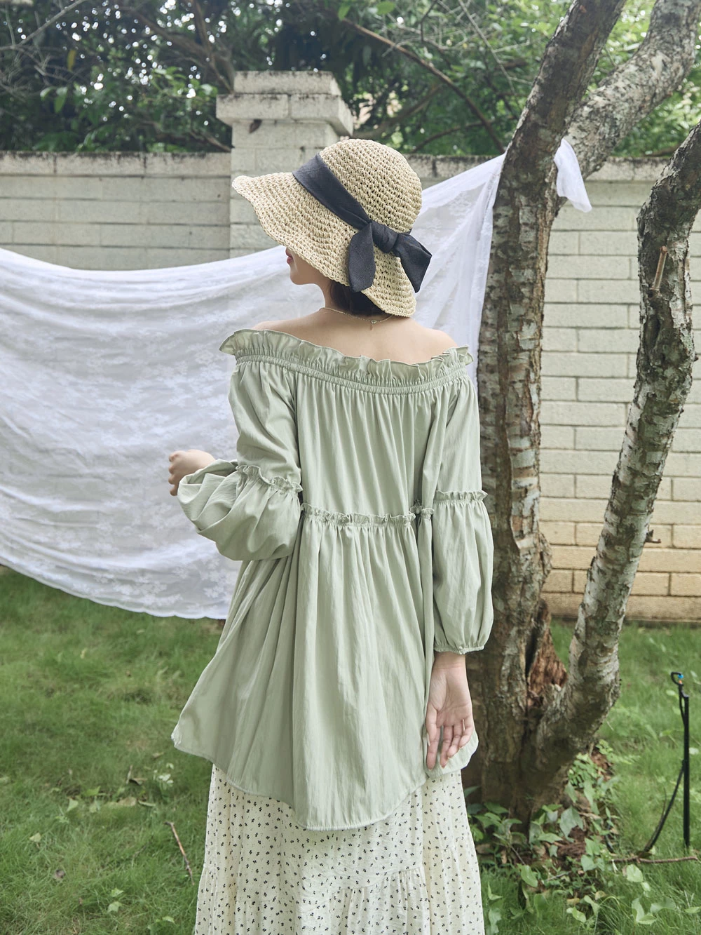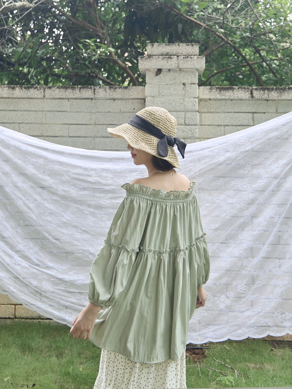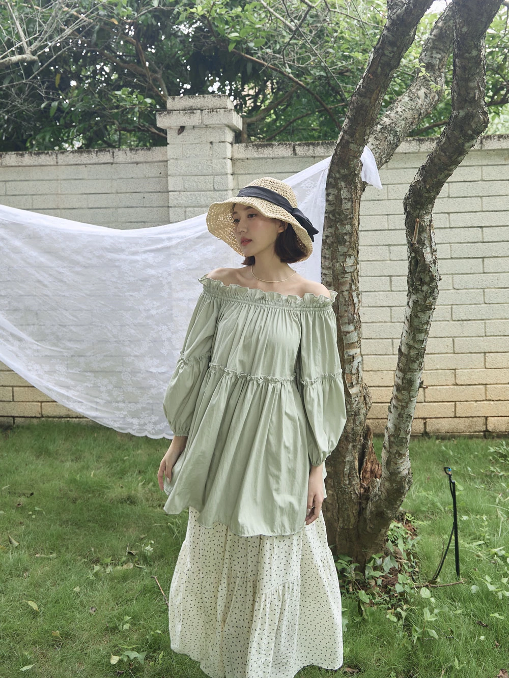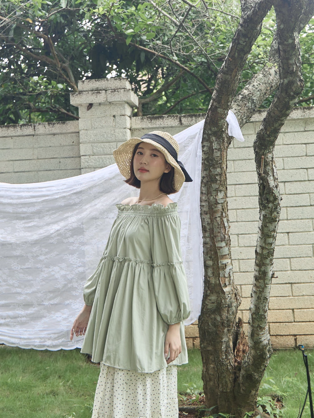 鬆緊一字領荷葉邊上衣 | Space Picnic