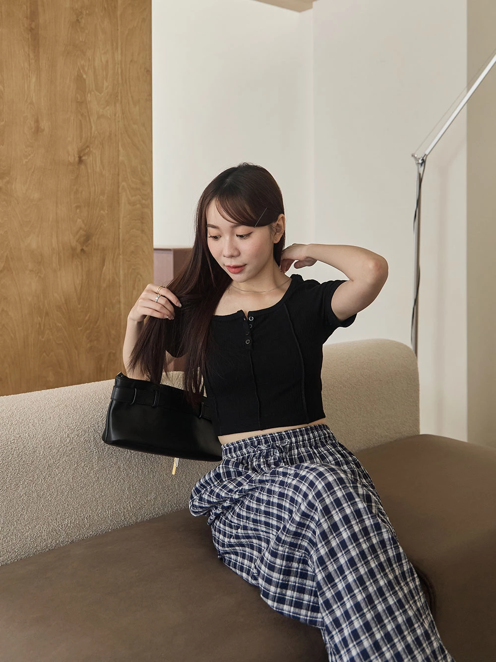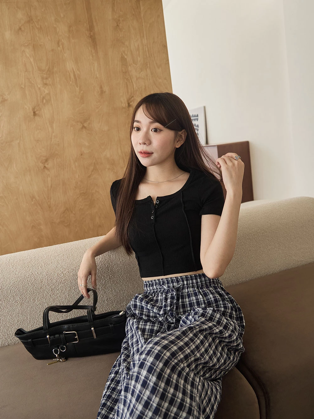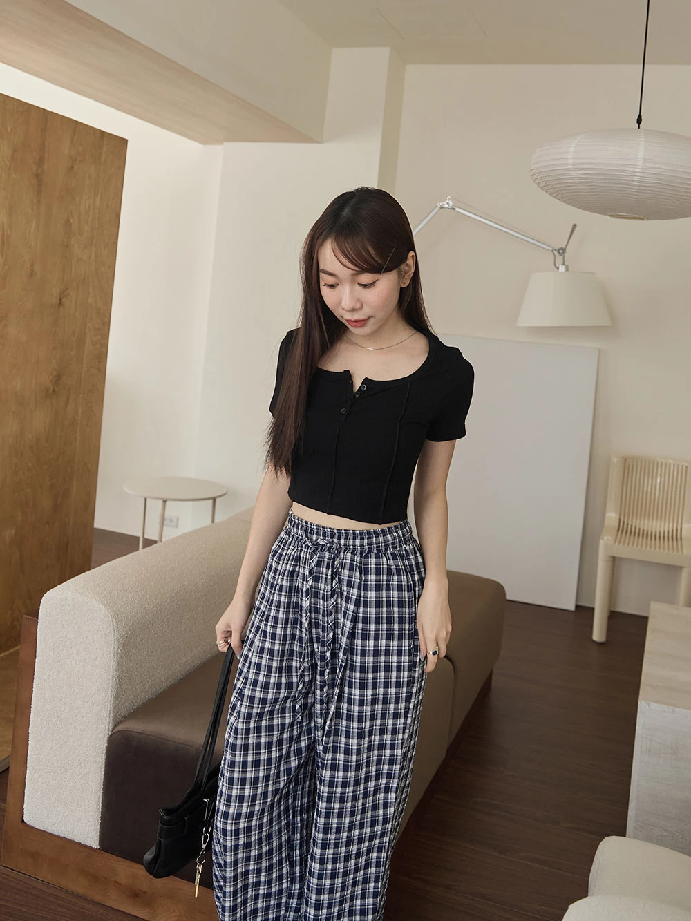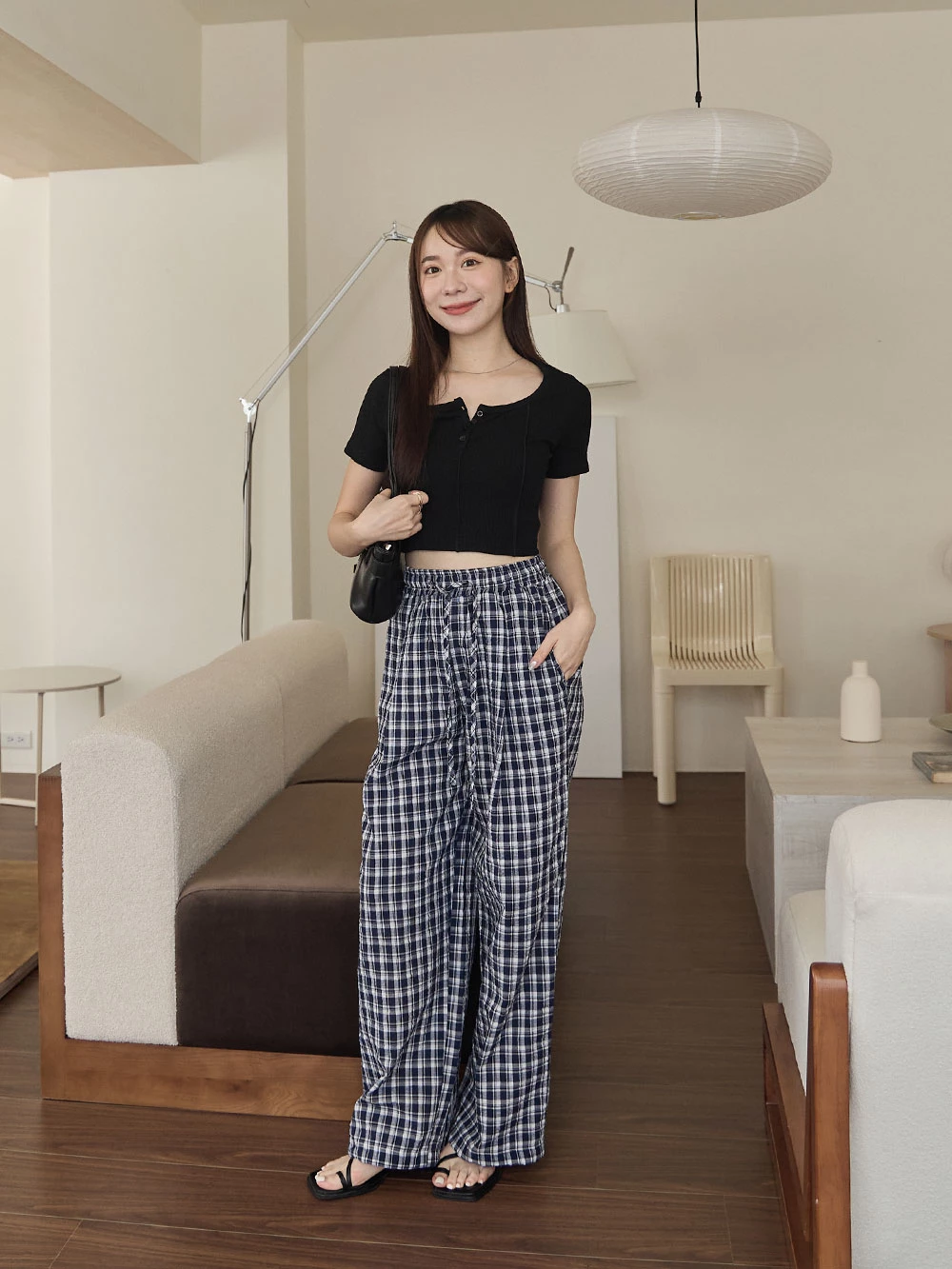 抽繩格紋寬褲 | Space Picnic