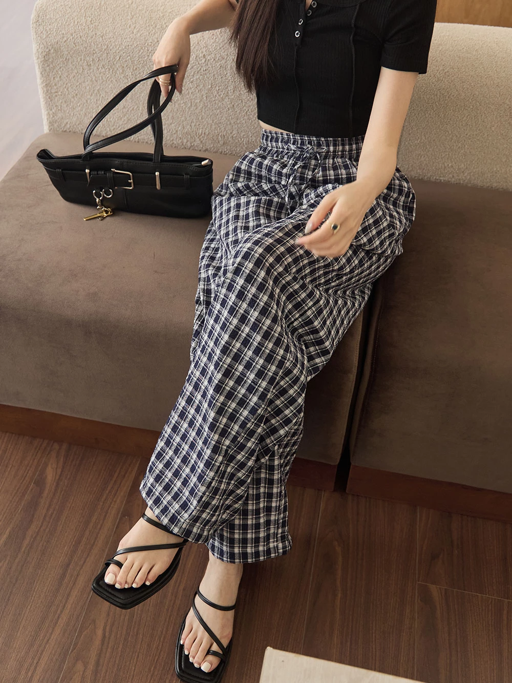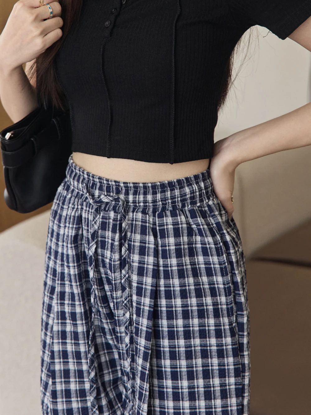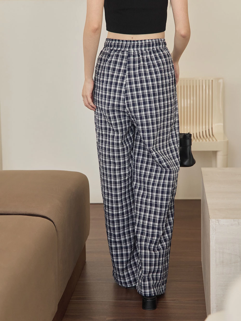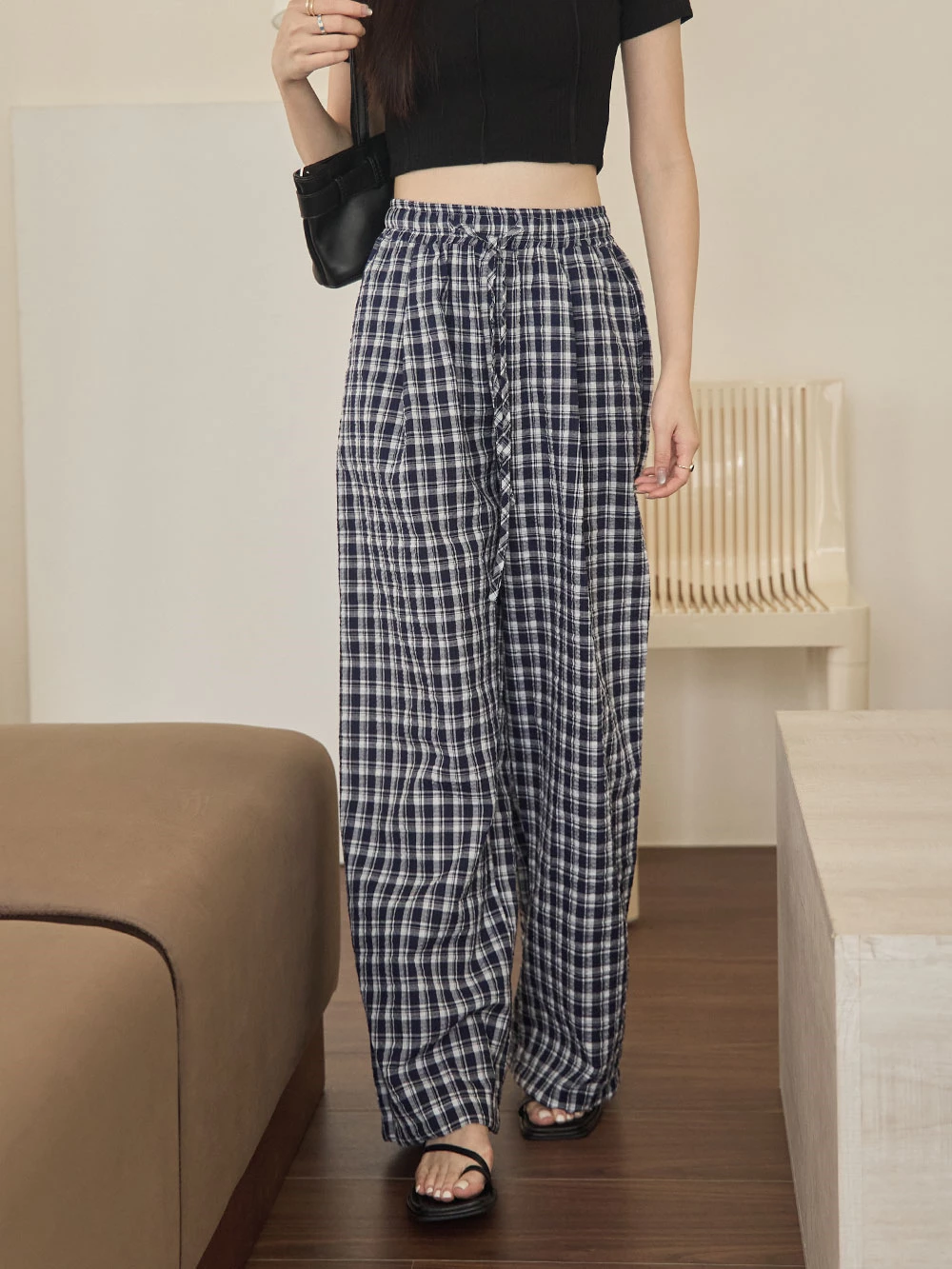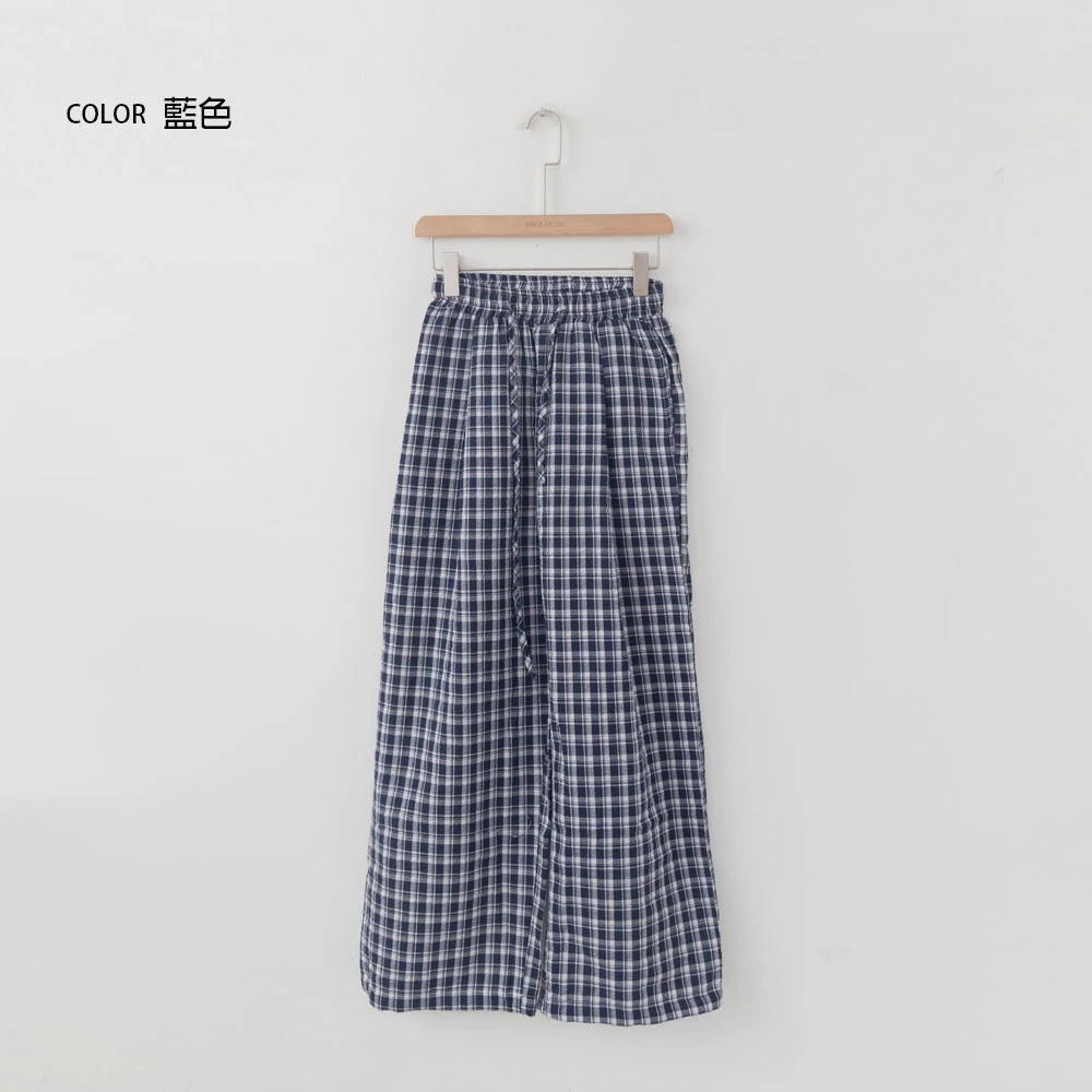 抽繩格紋寬褲