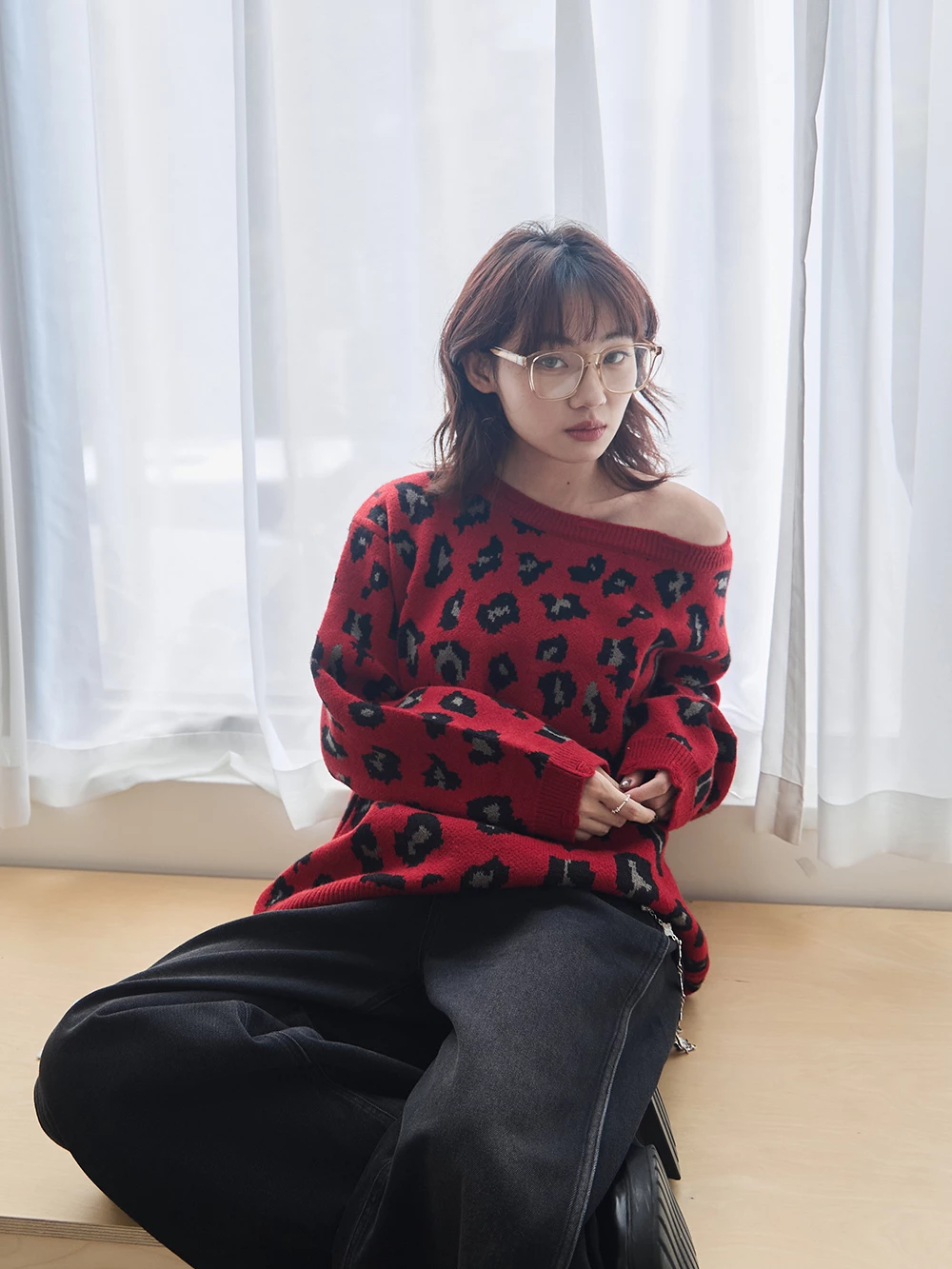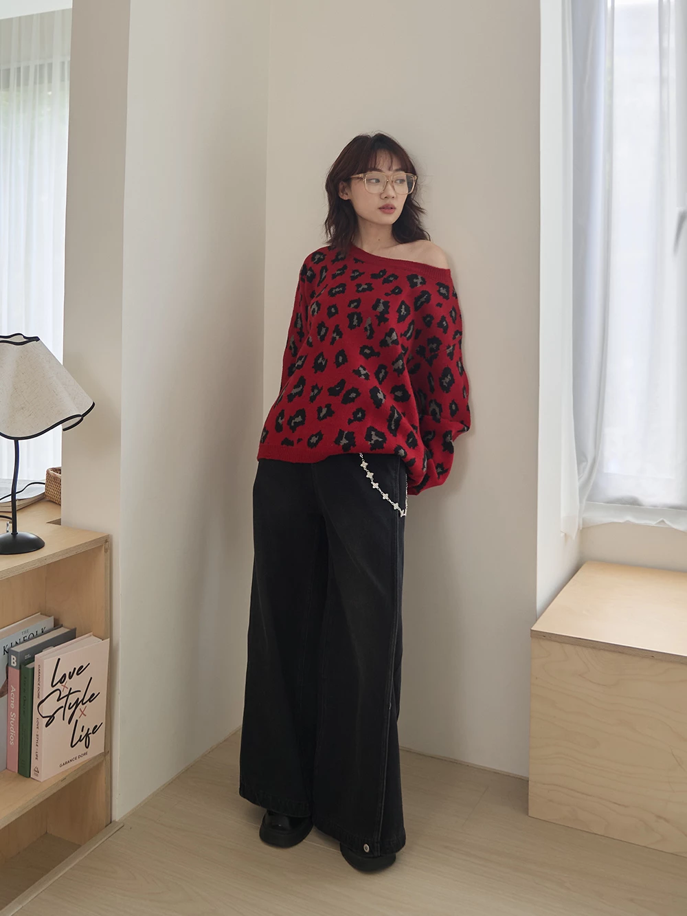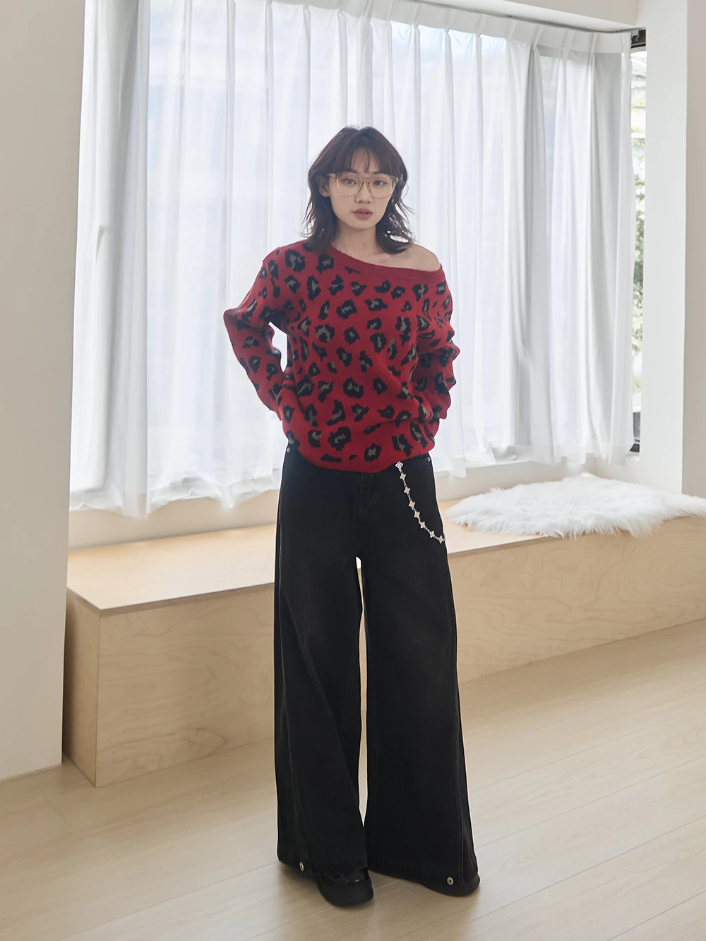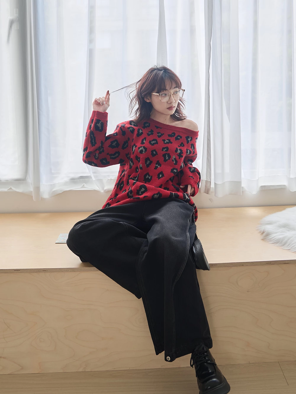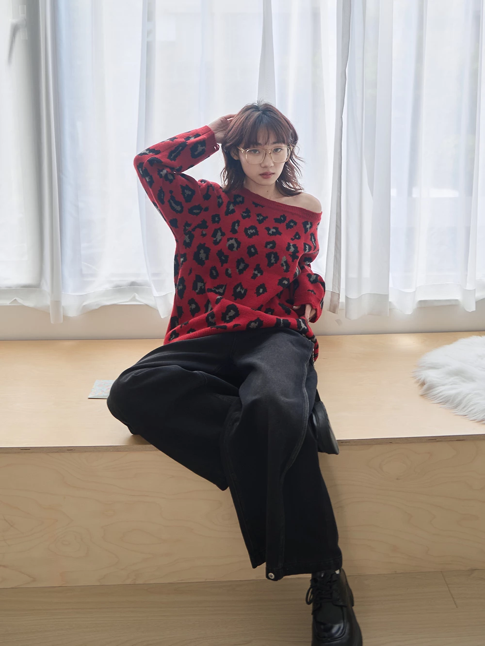 寬領豹紋針織上衣