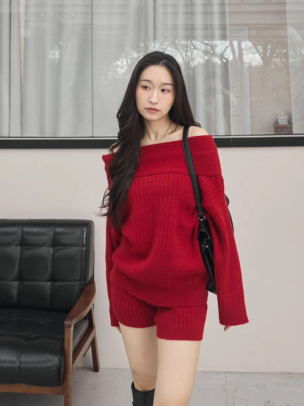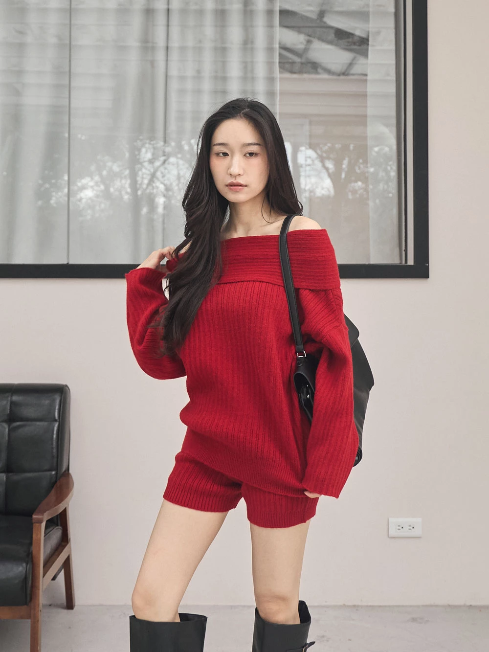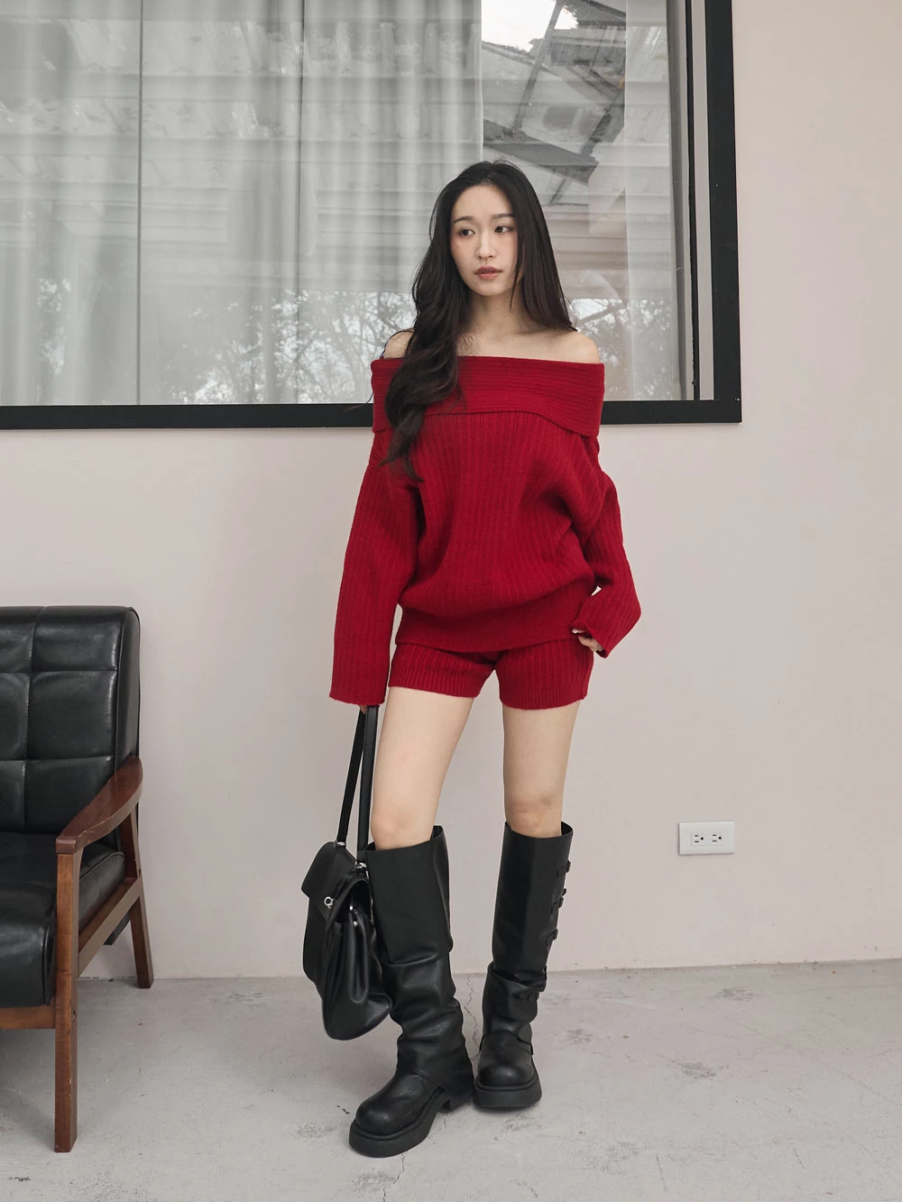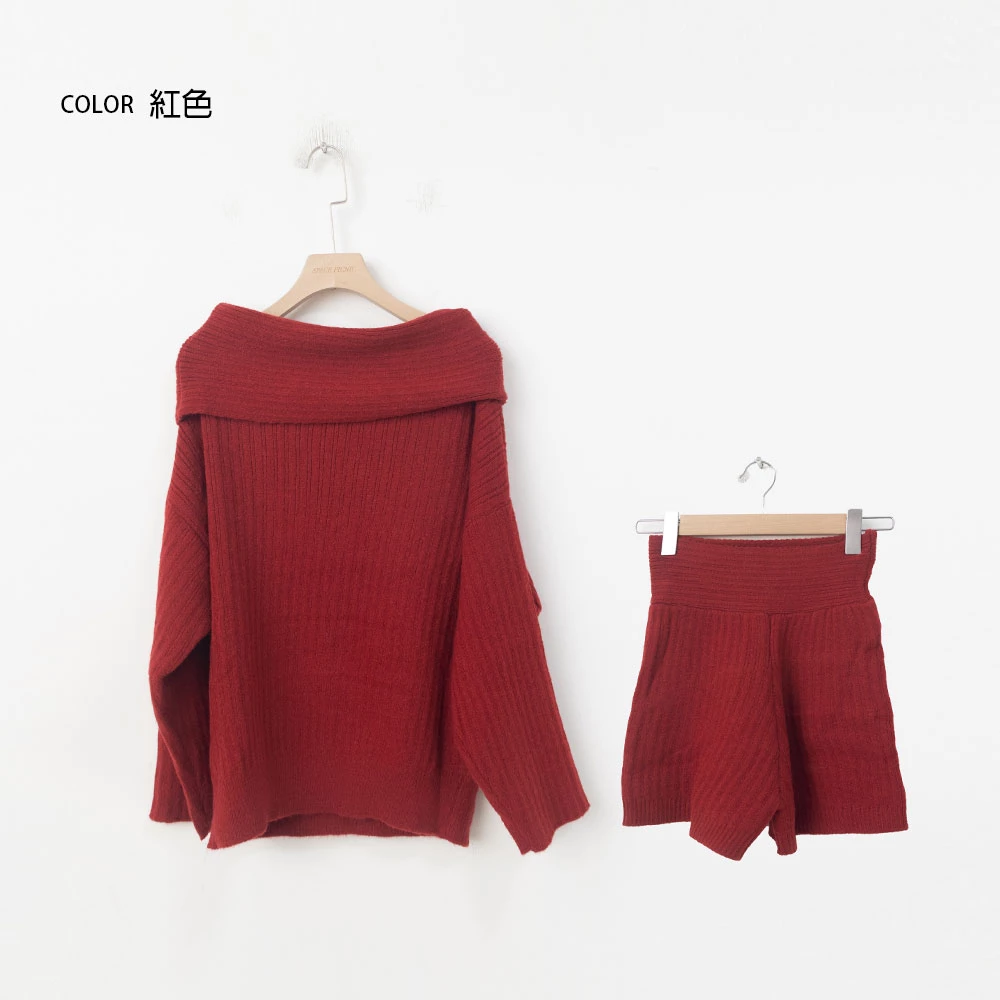 兩件式-一字領針織上衣+短褲