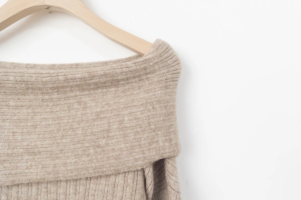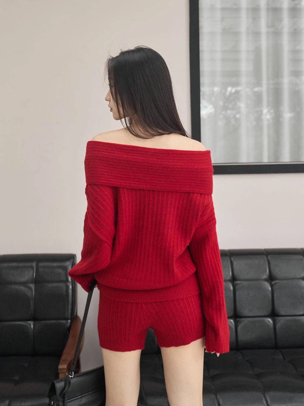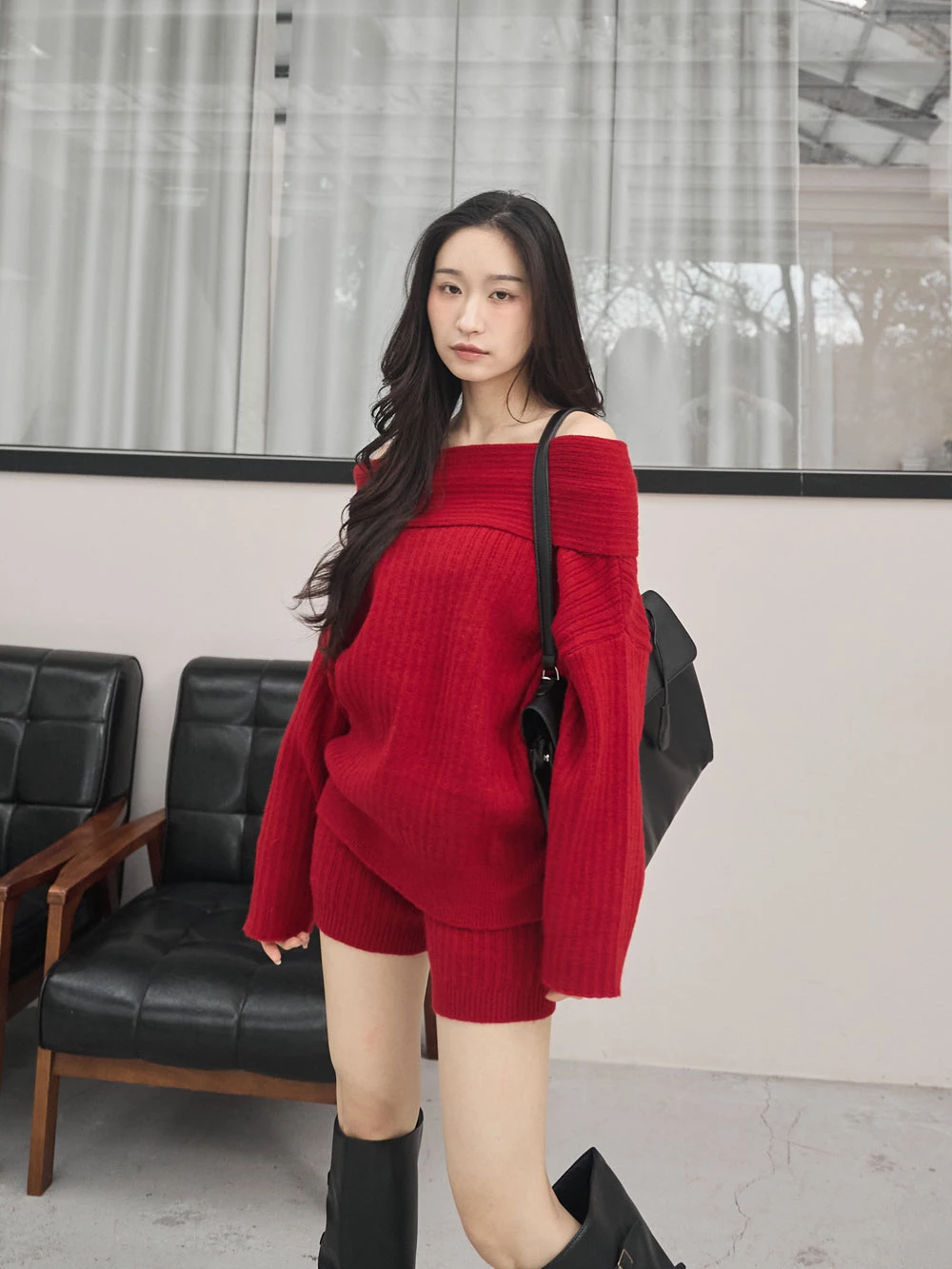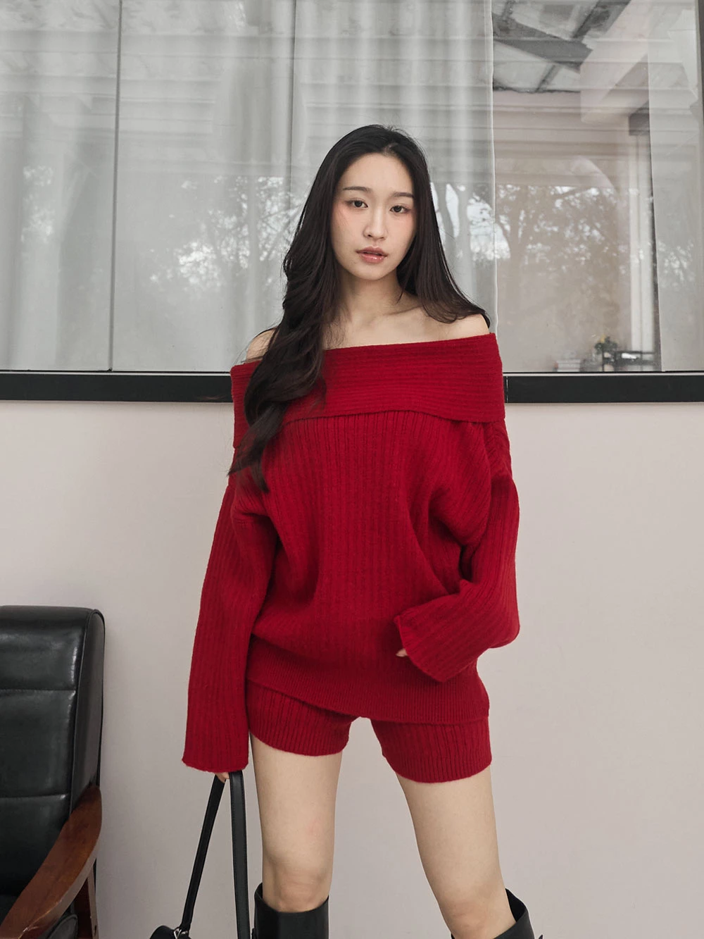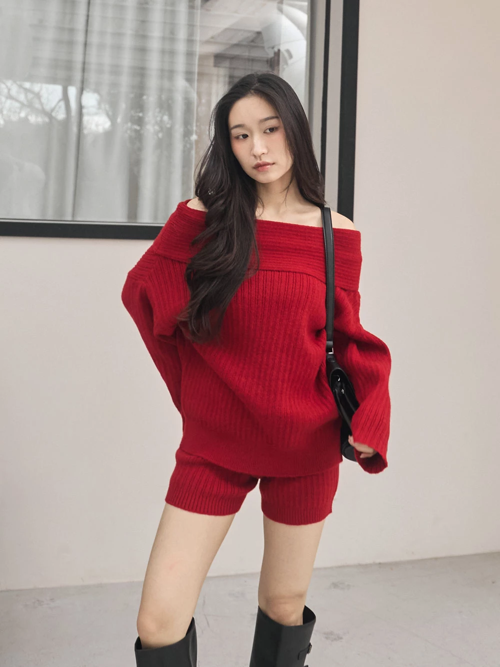 兩件式-一字領針織上衣+短褲