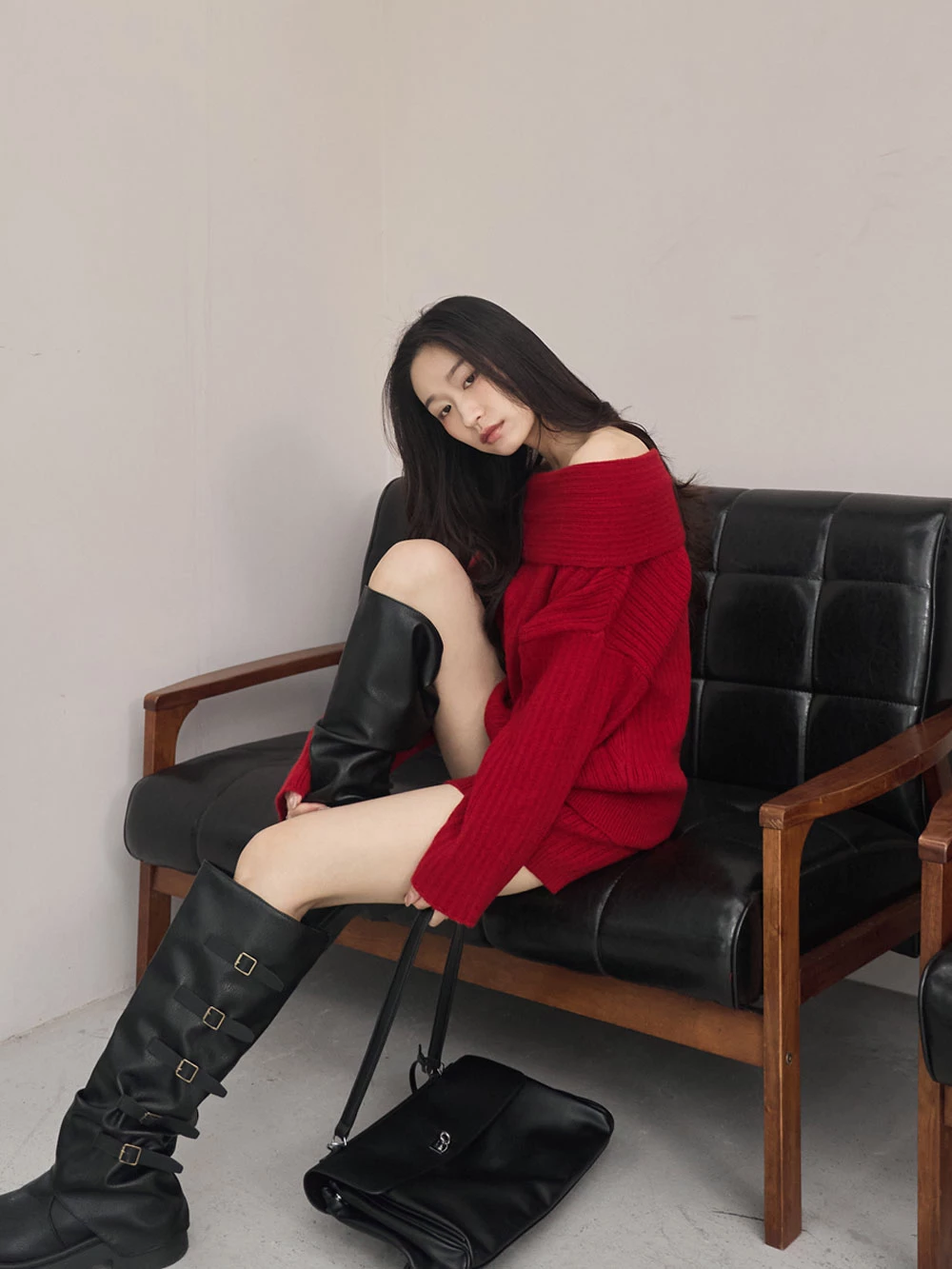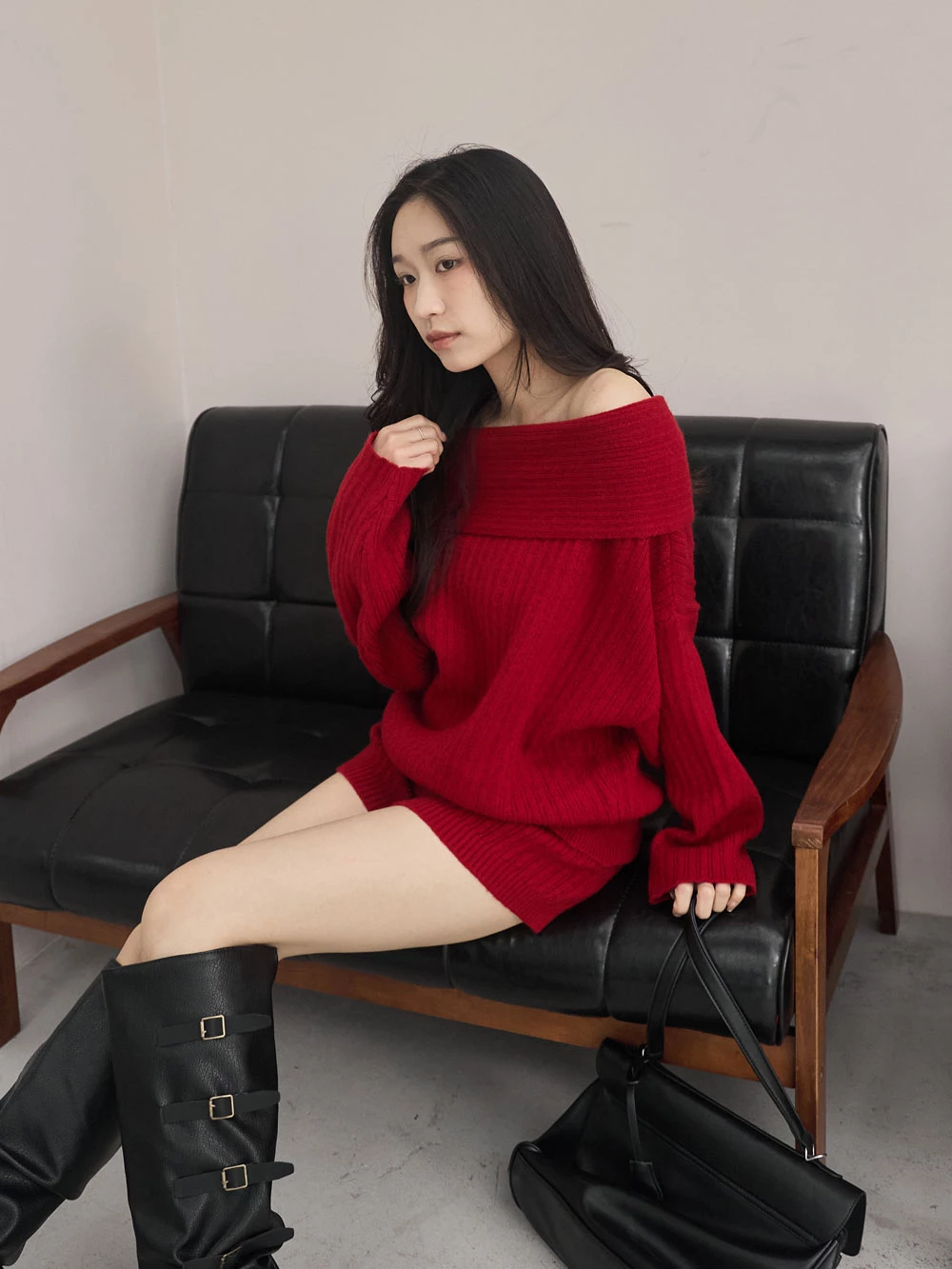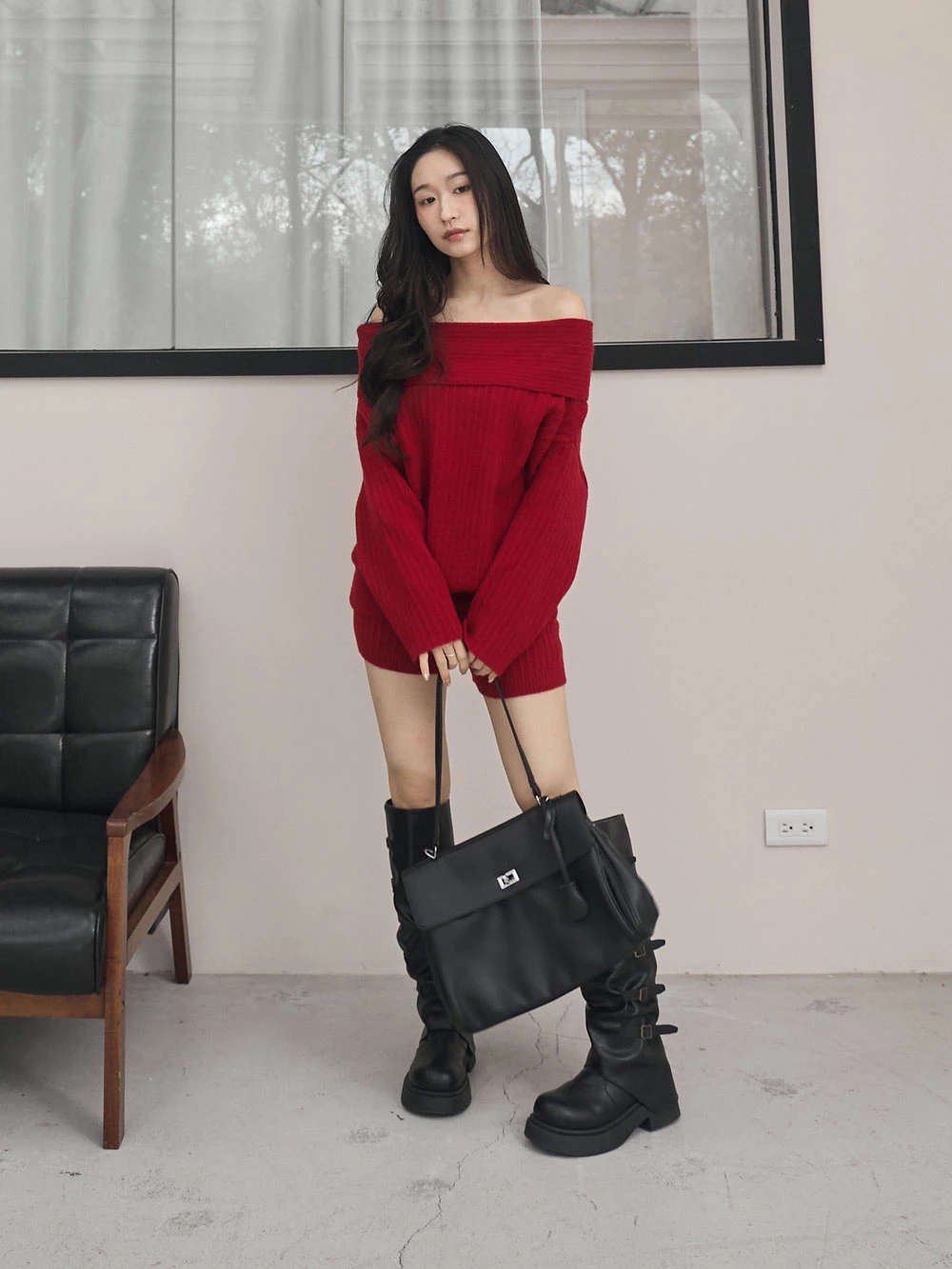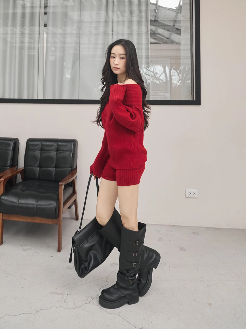 兩件式-一字領針織上衣+短褲