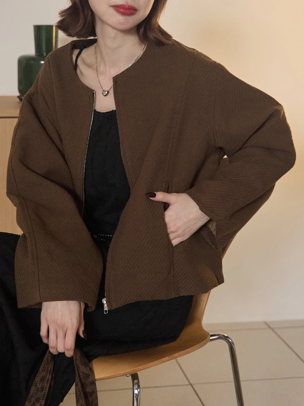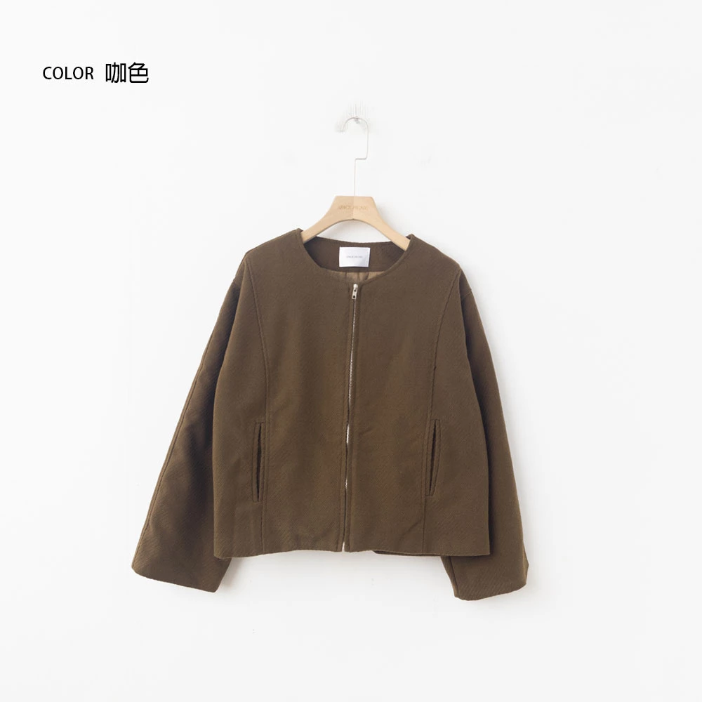坑條無領拉鍊外套