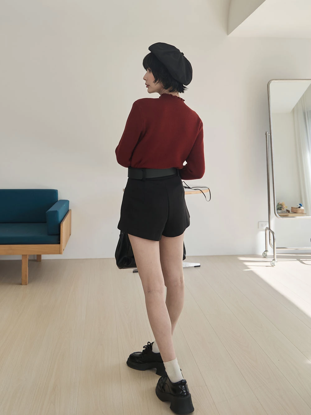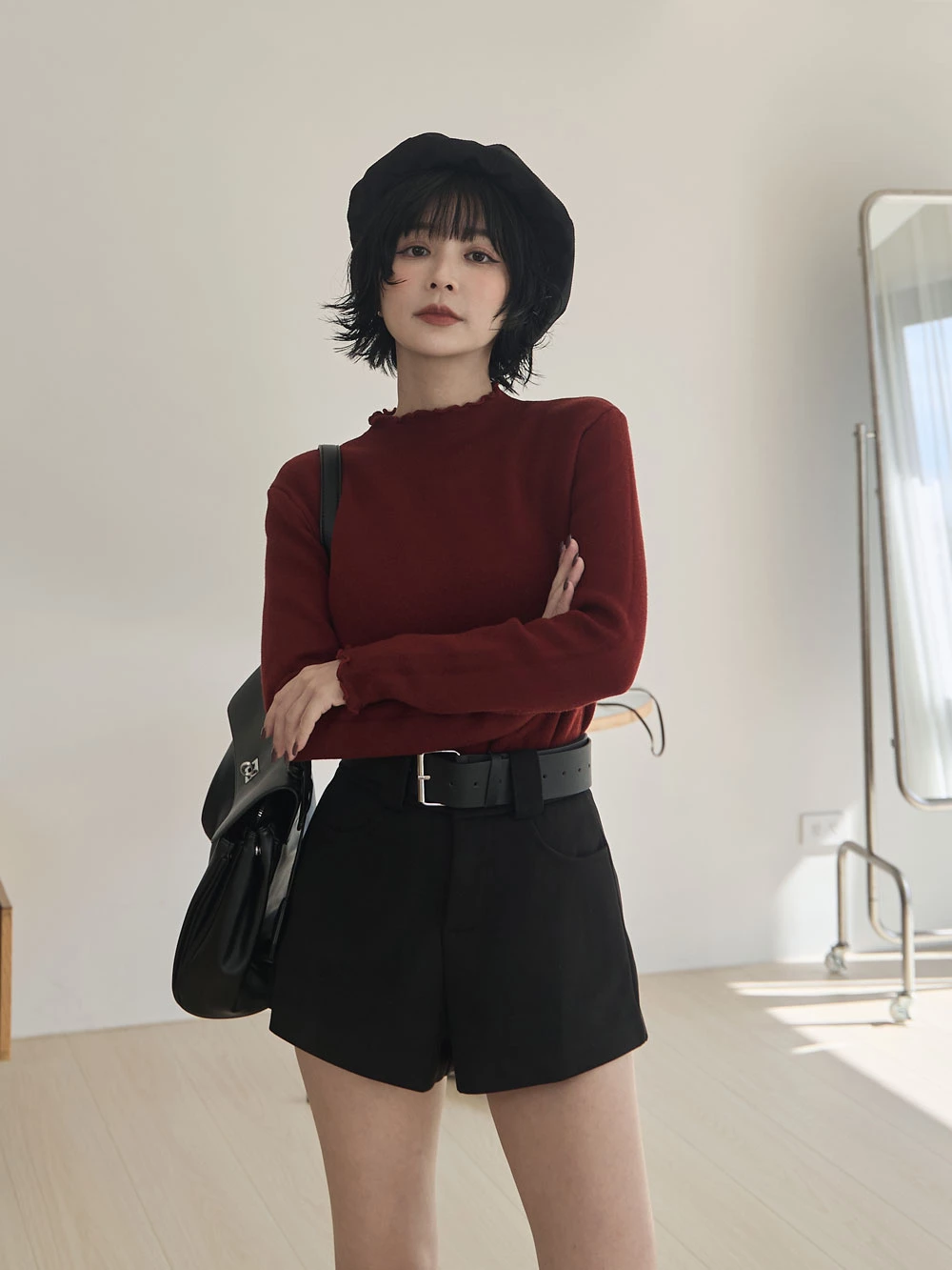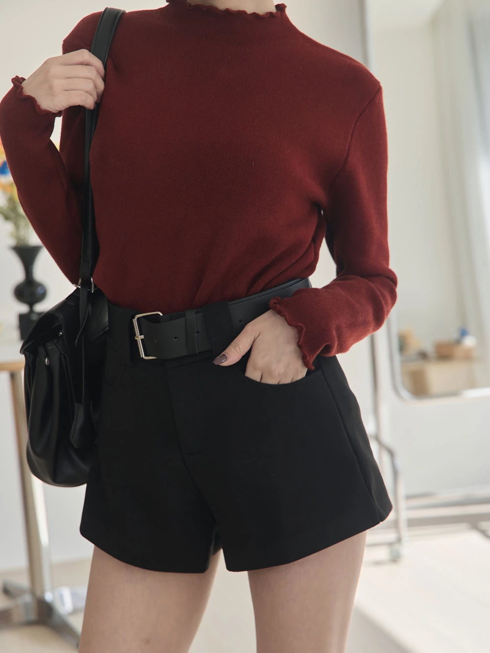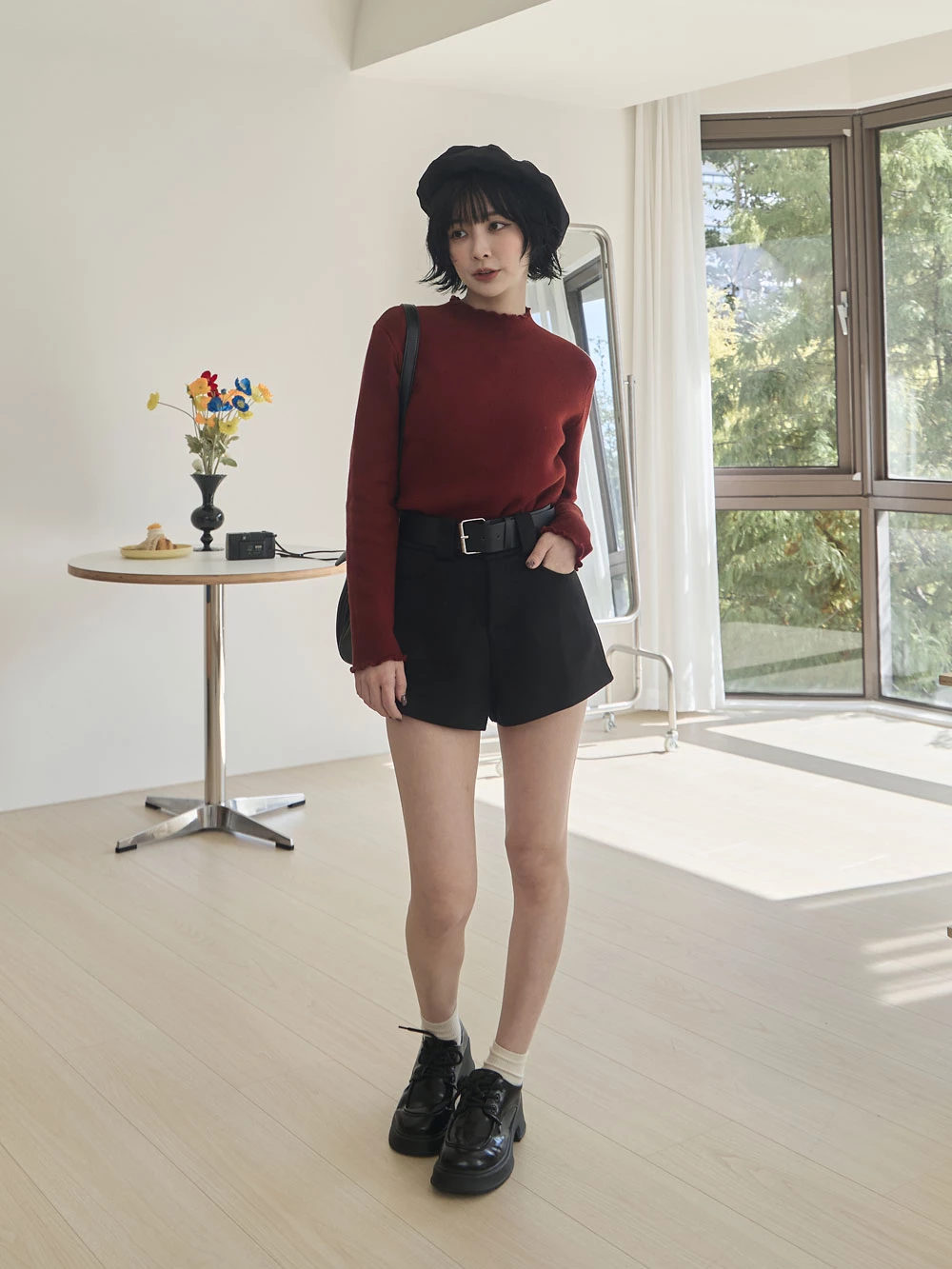 高腰毛呢短褲-附寬皮帶