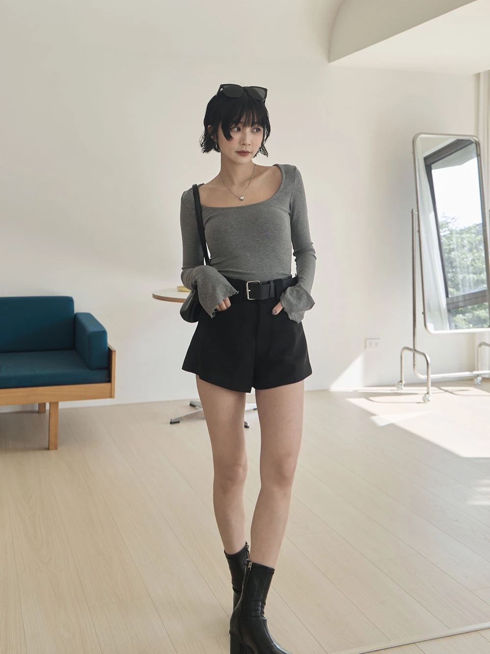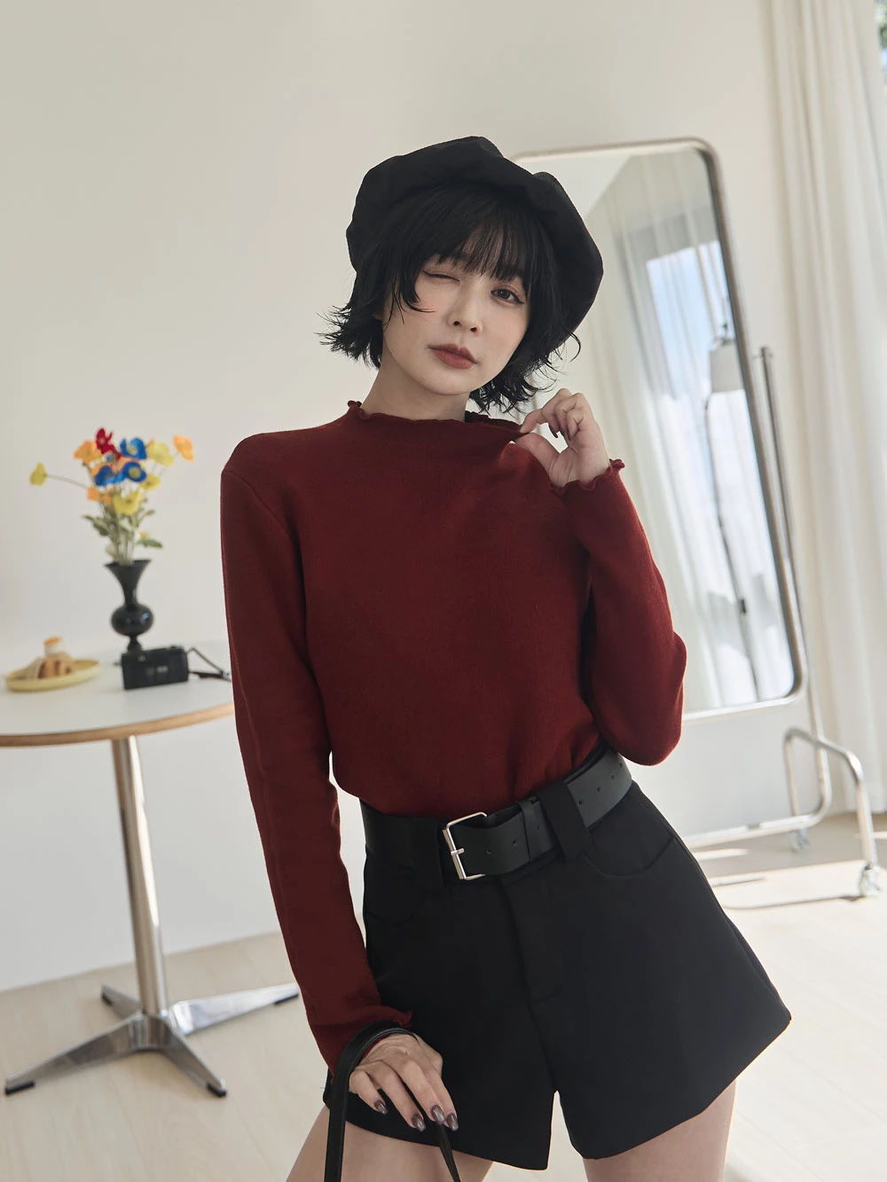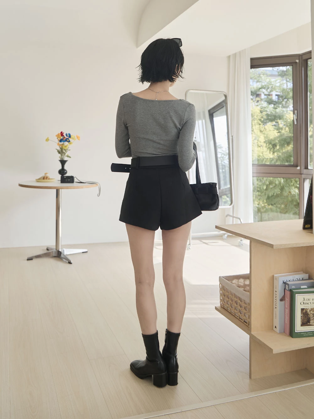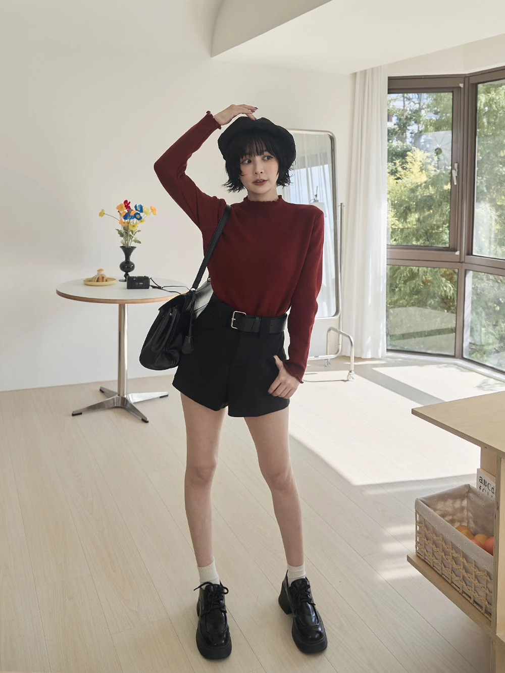 高腰毛呢短褲-附寬皮帶