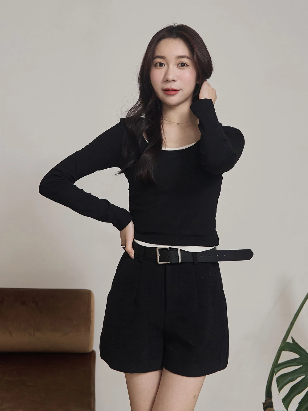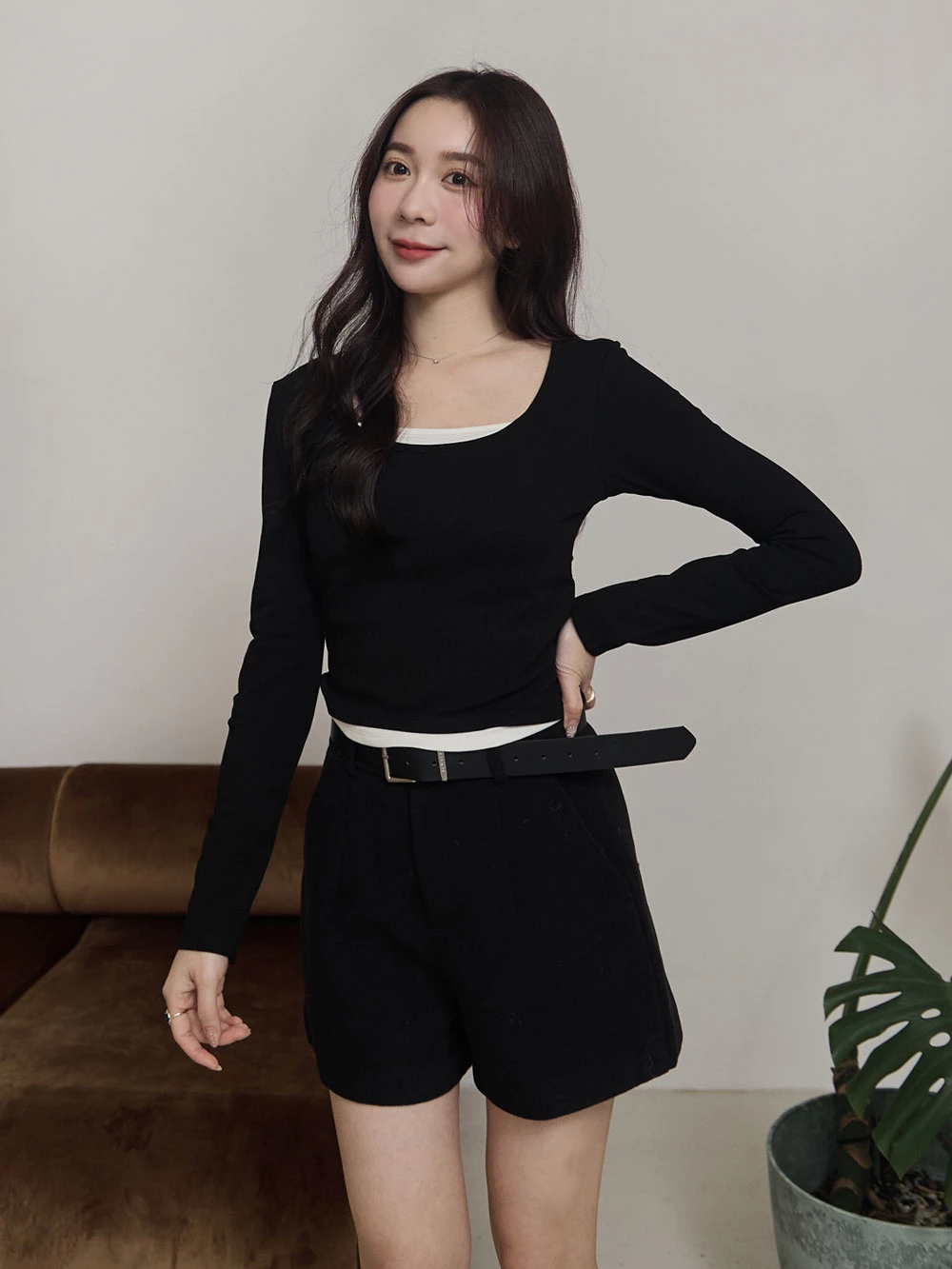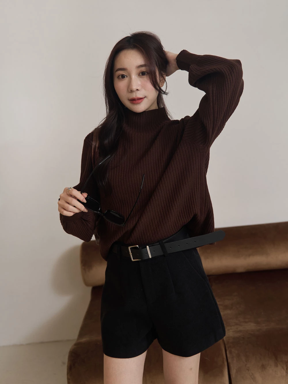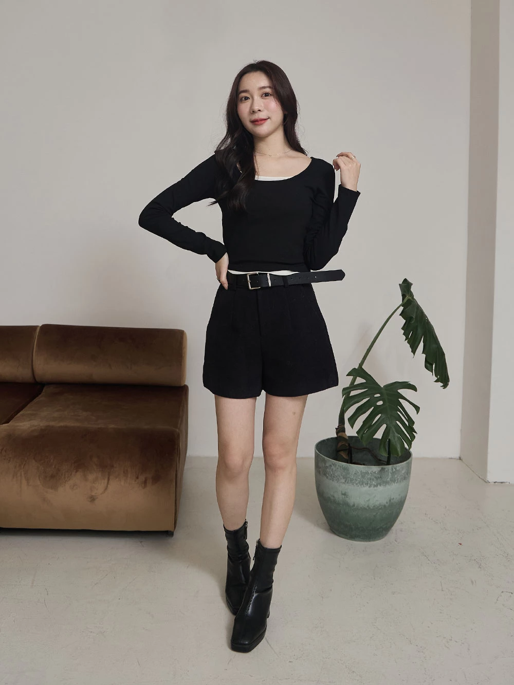 高腰毛呢短褲-附皮帶