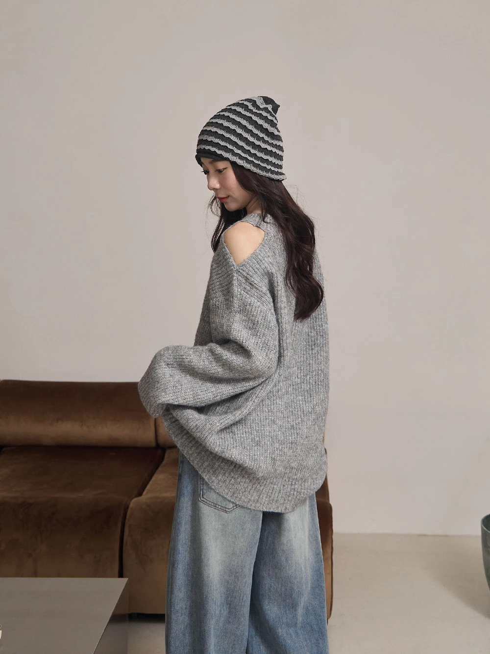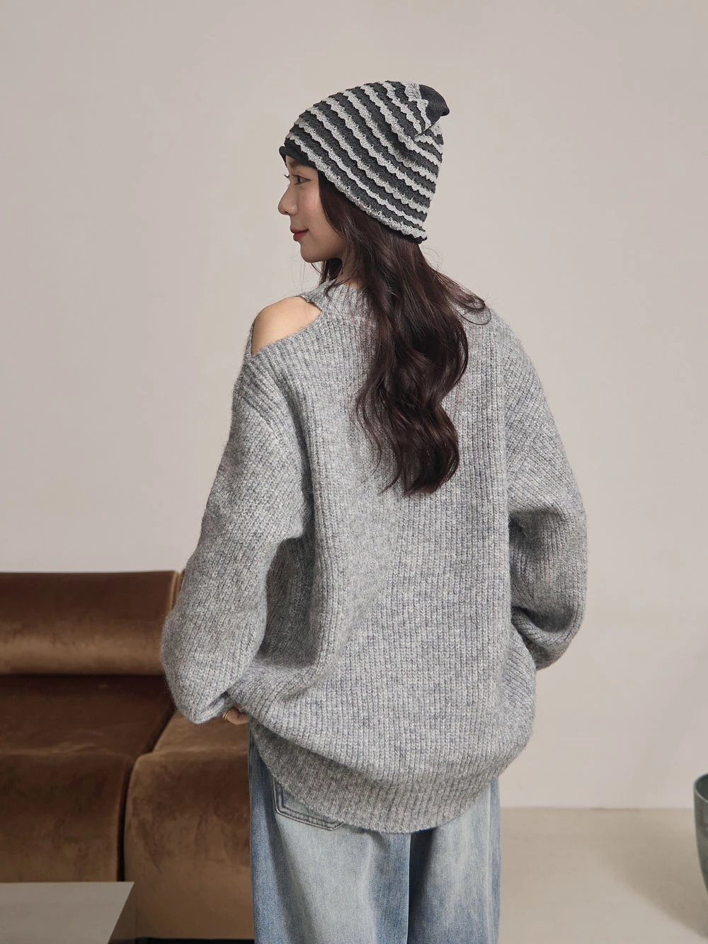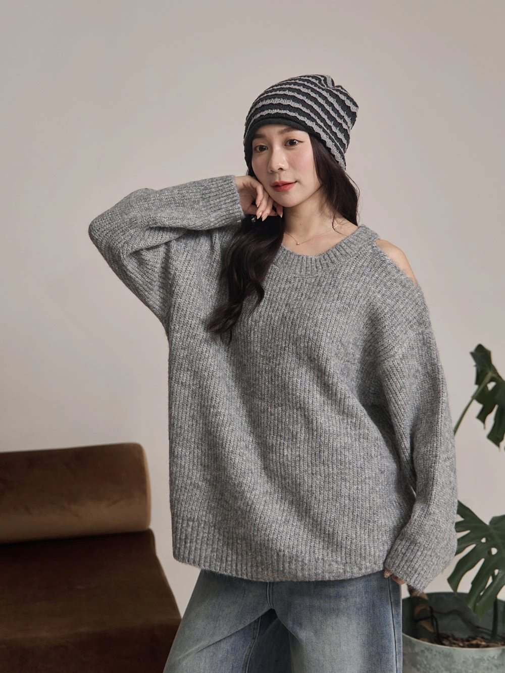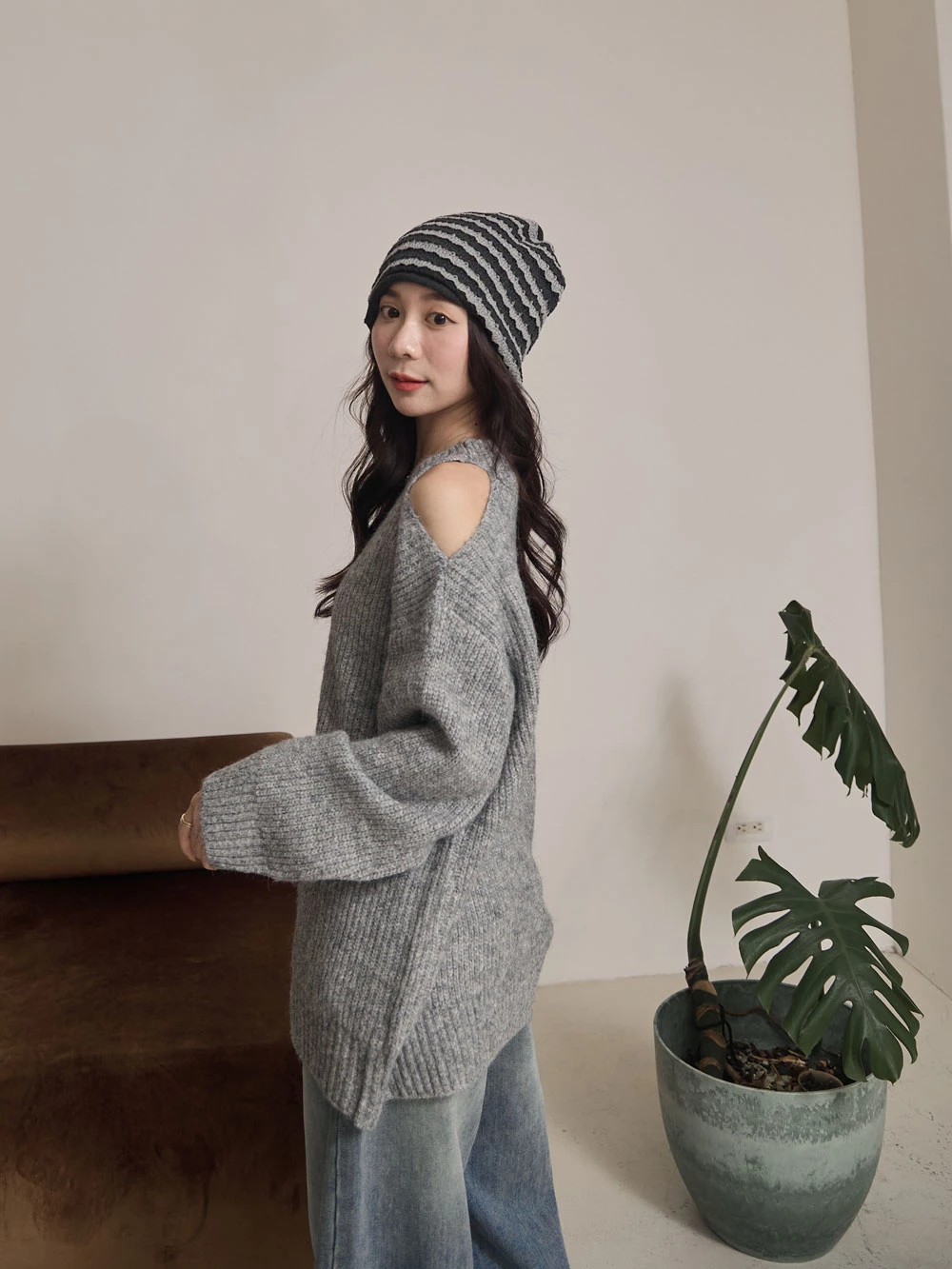 露肩圓領針織上衣