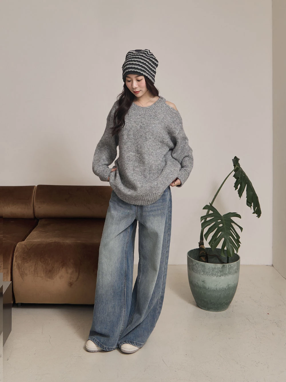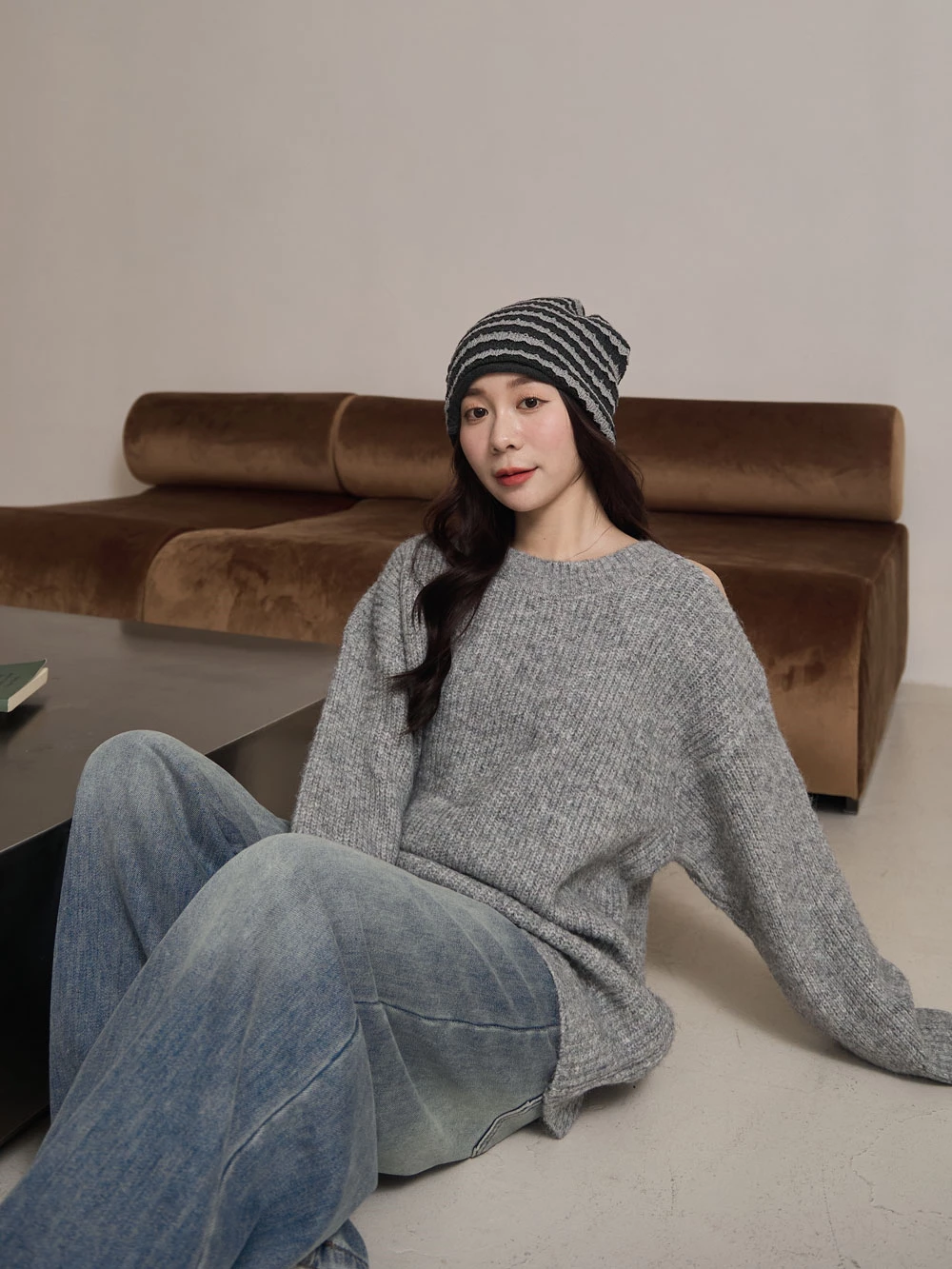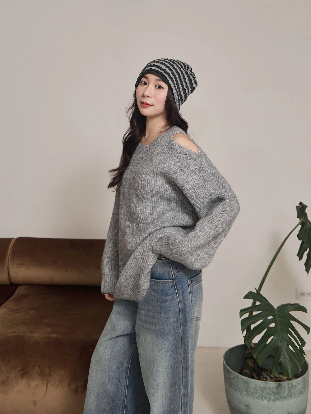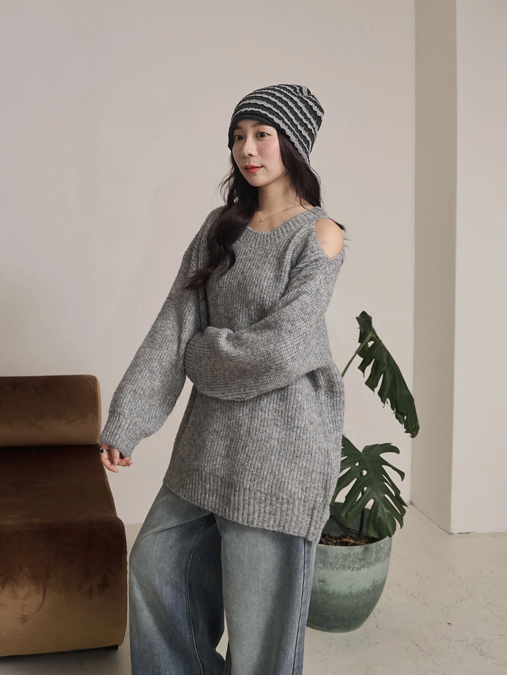 露肩圓領針織上衣