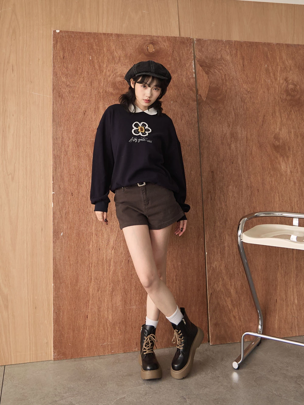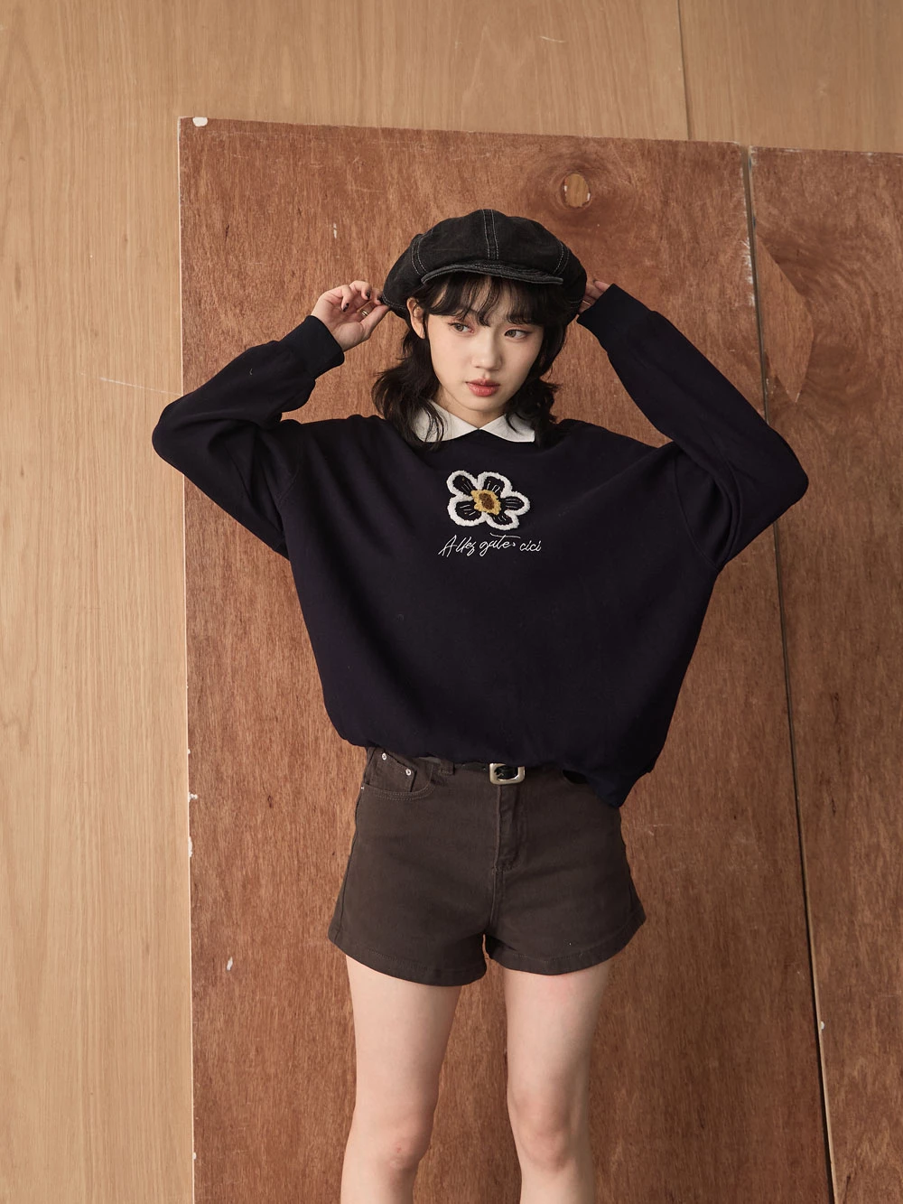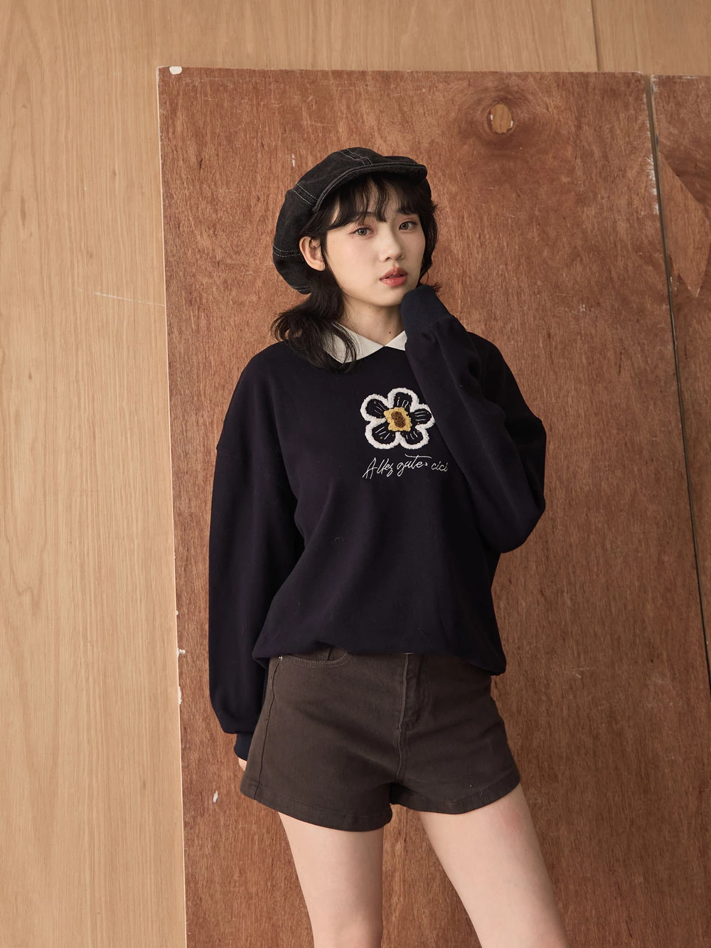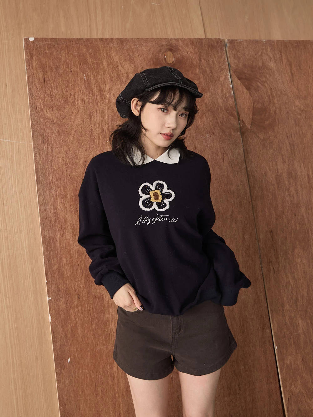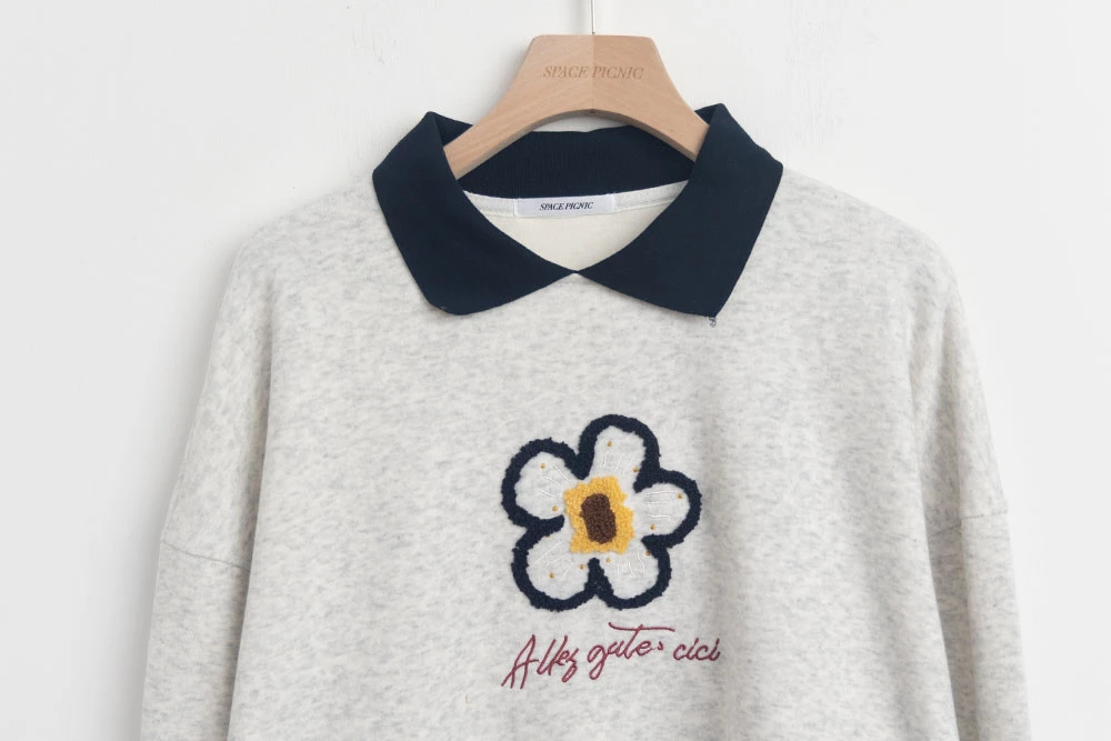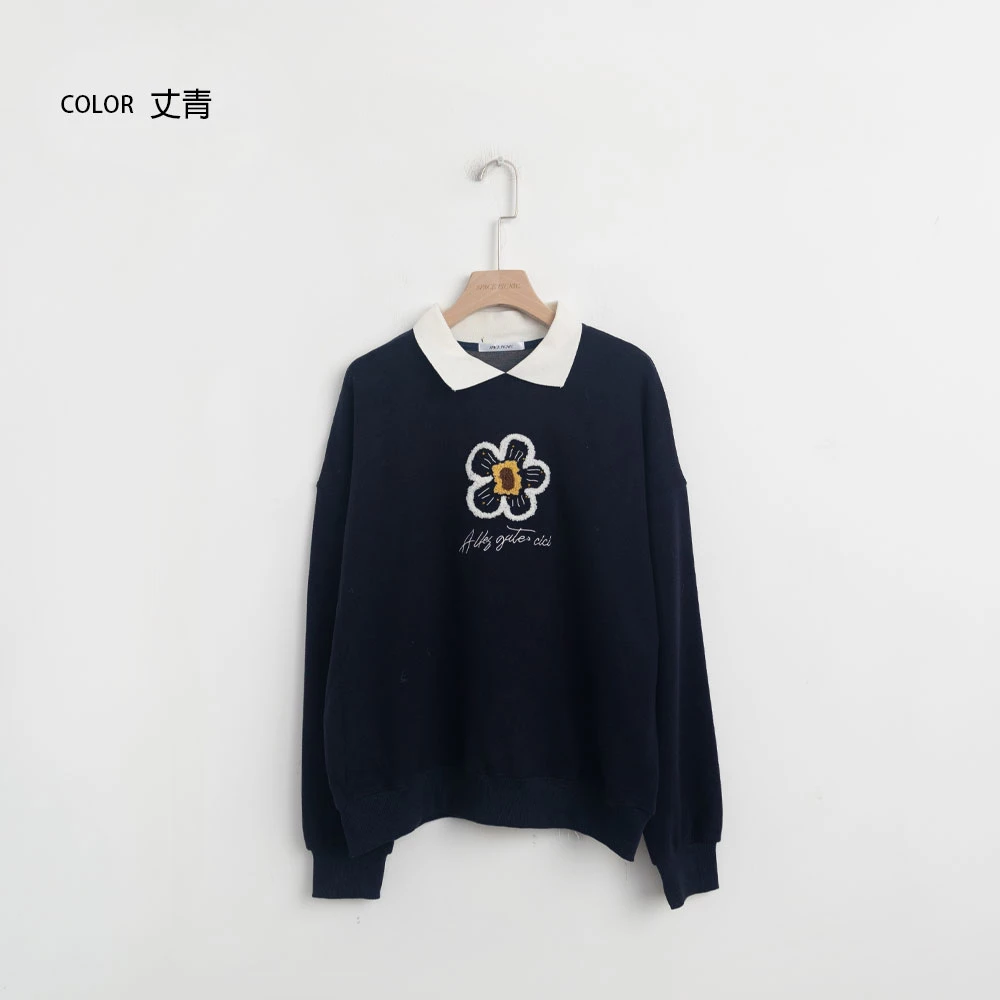 撞色翻領磨毛花朵大學T