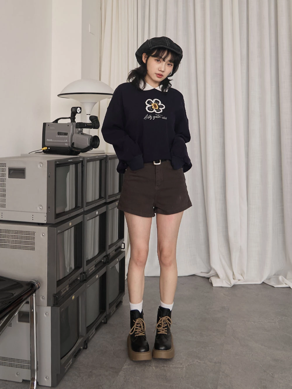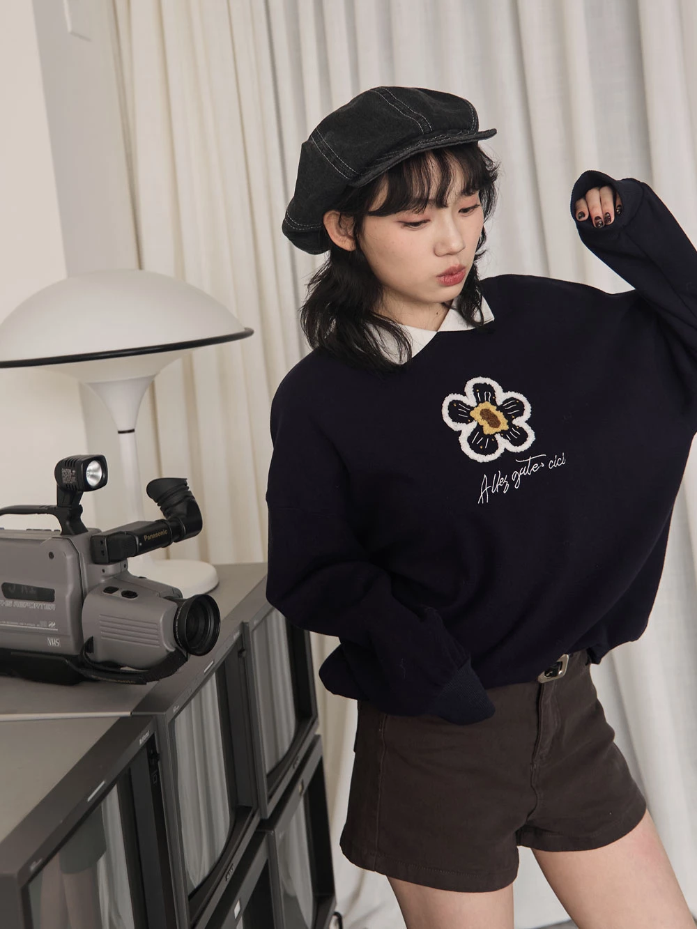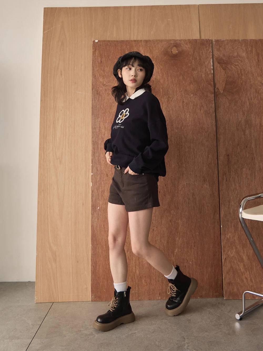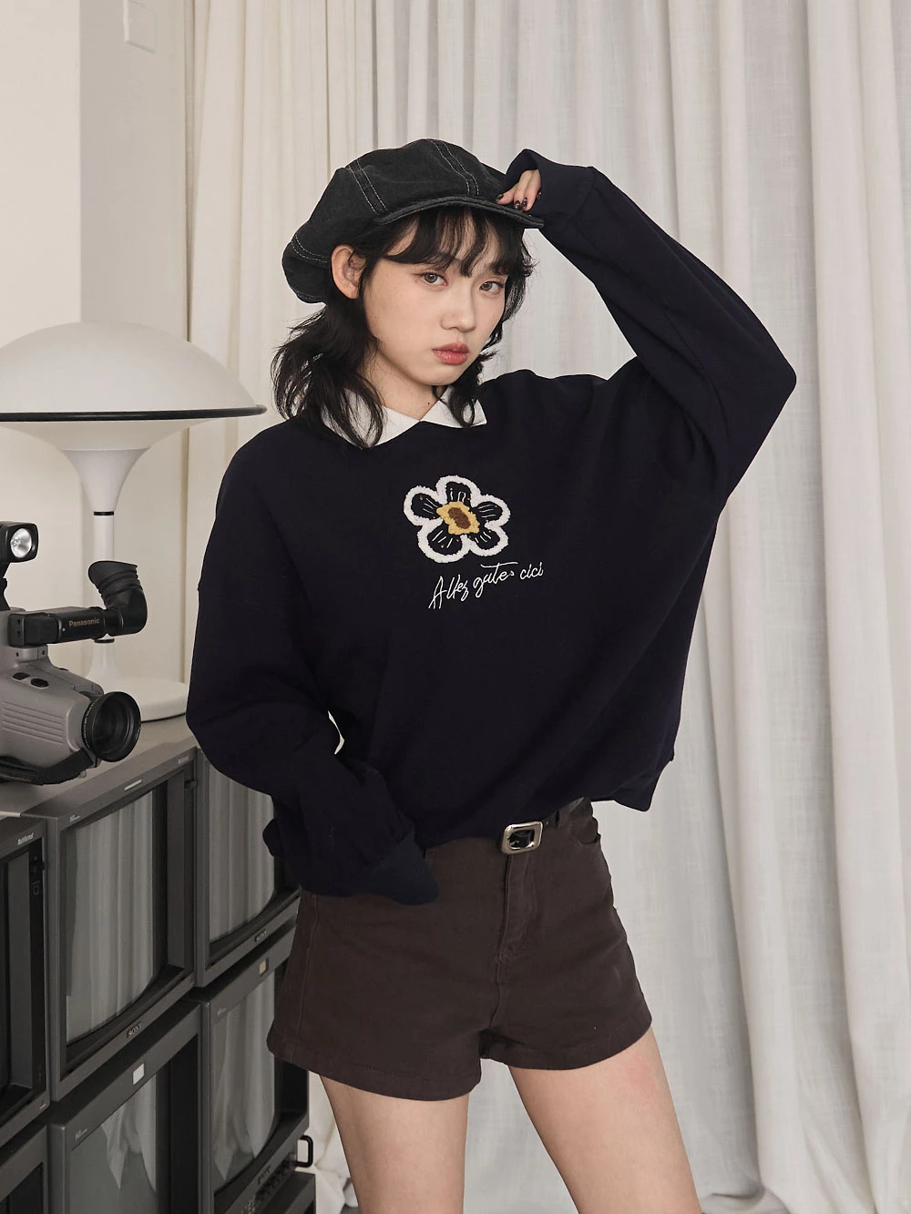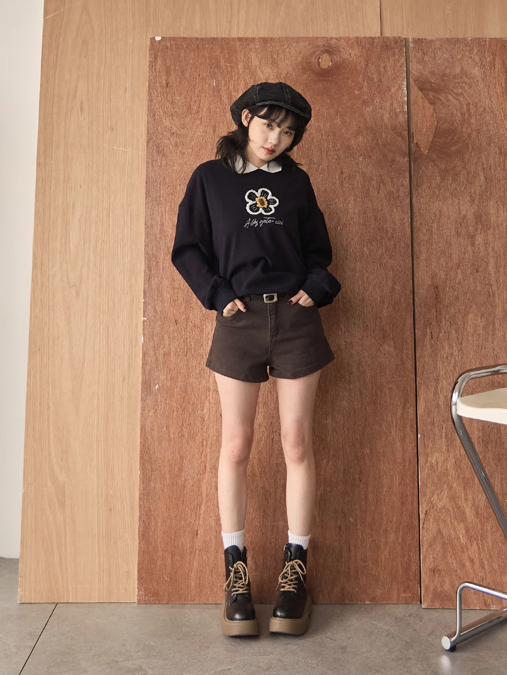 撞色翻領磨毛花朵大學T