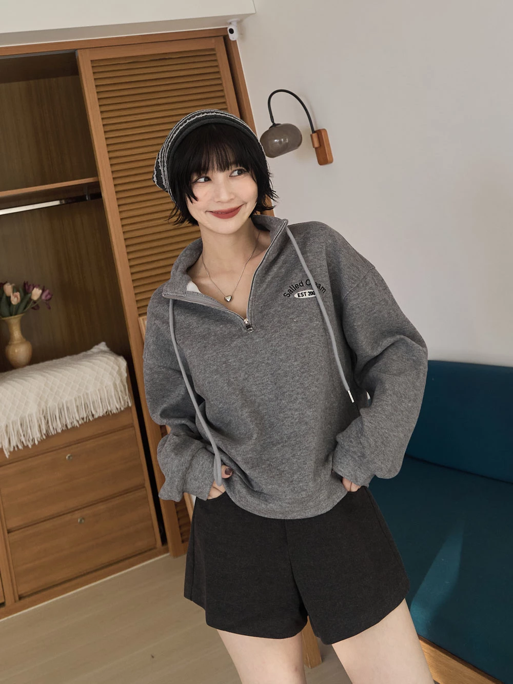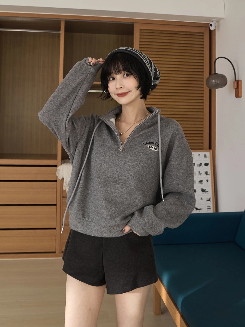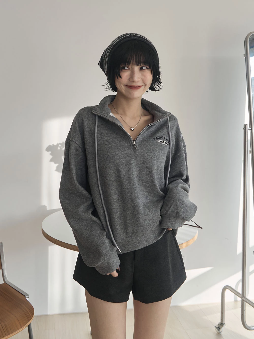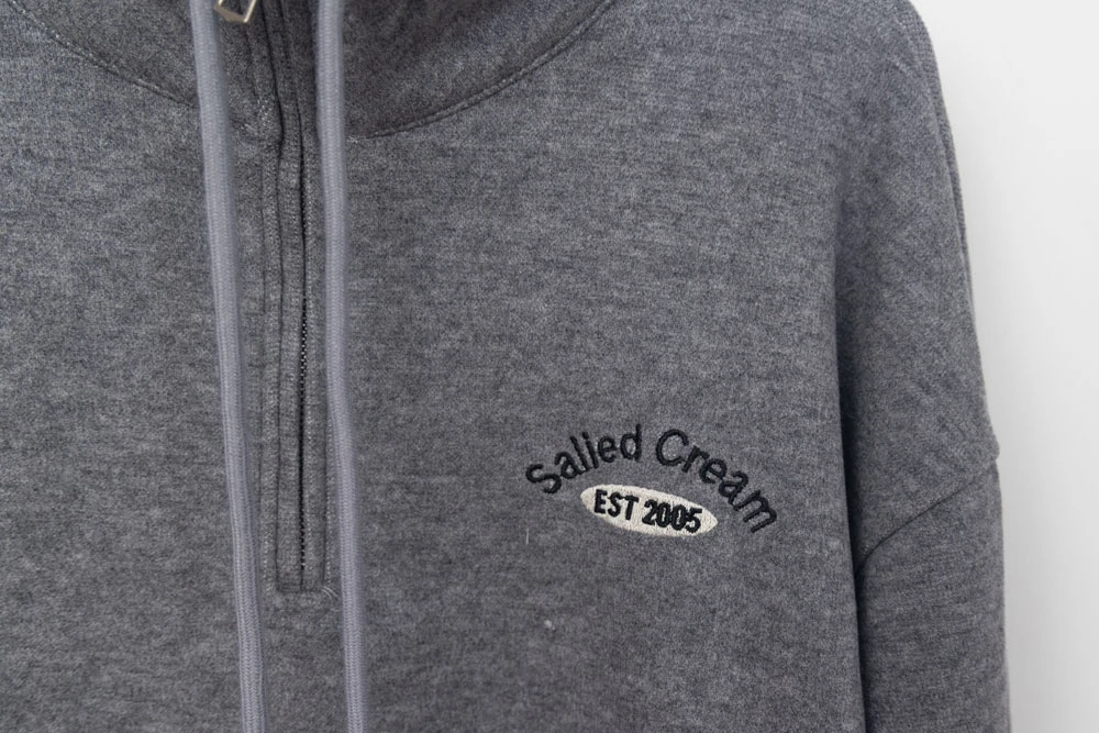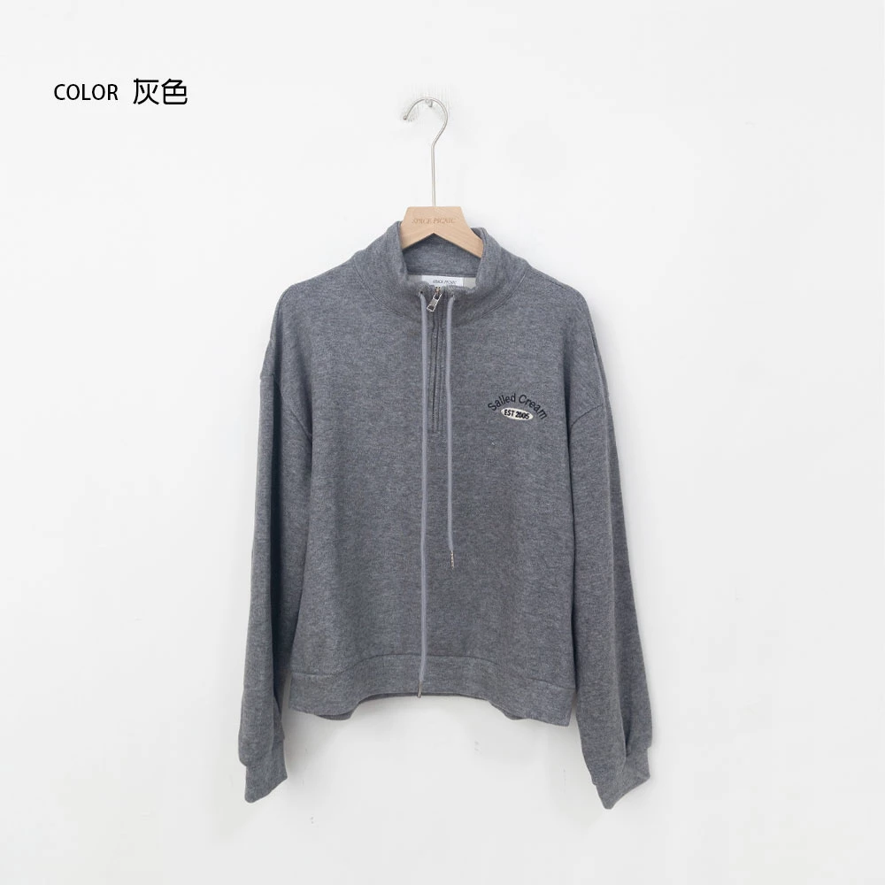 半拉鍊立領繡字磨毛上衣