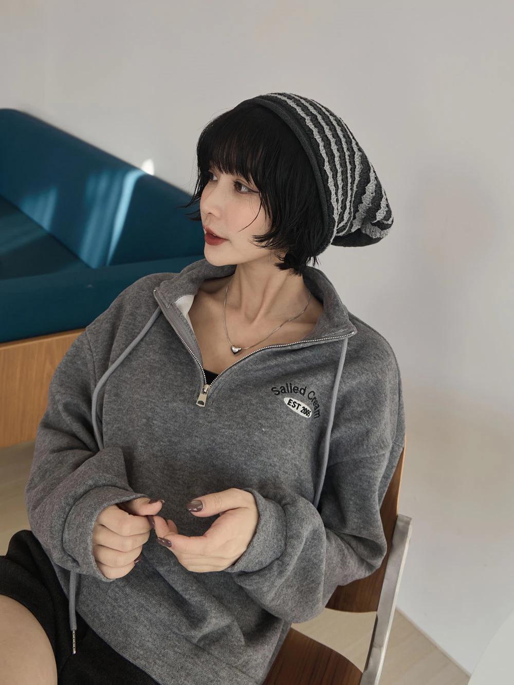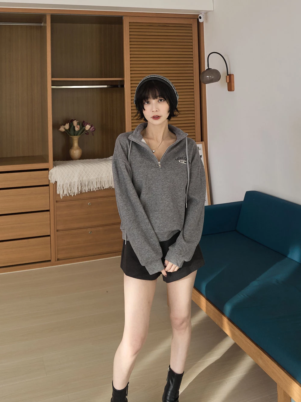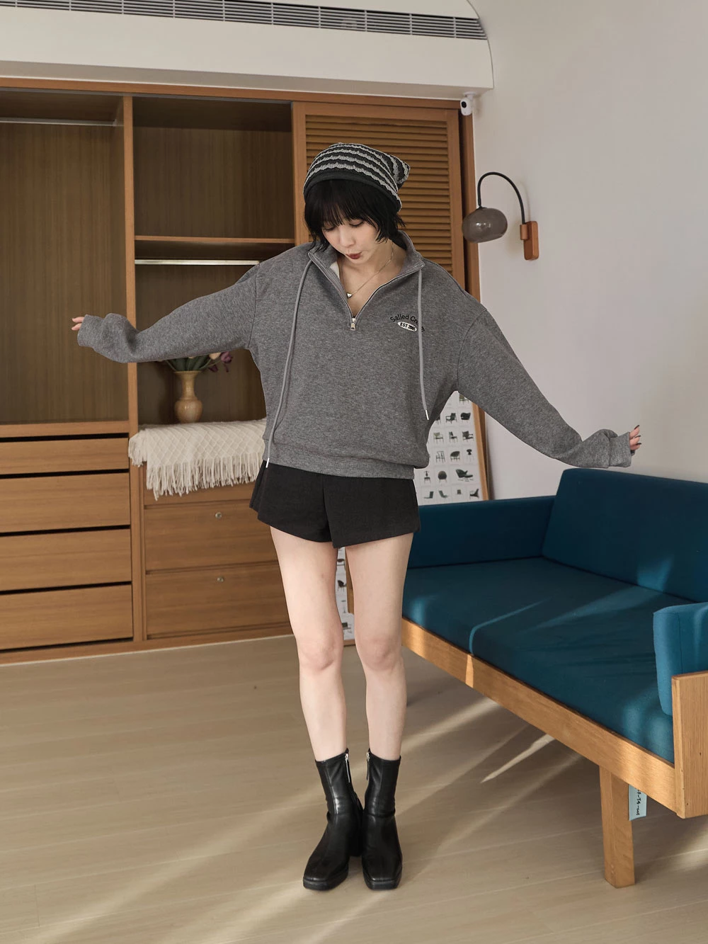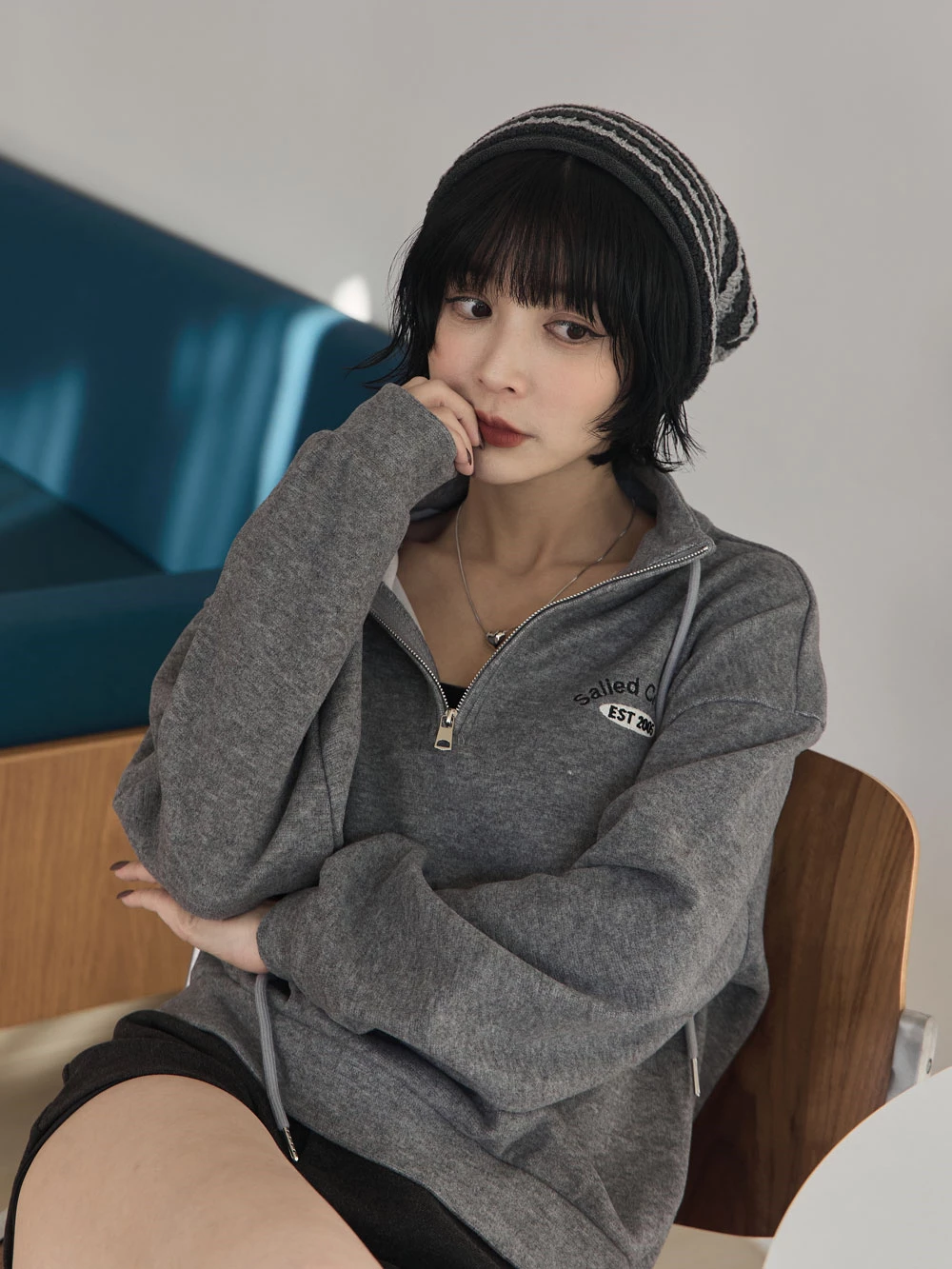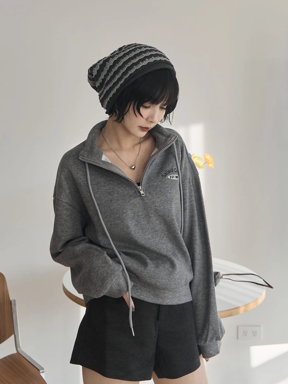 半拉鍊立領繡字磨毛上衣
