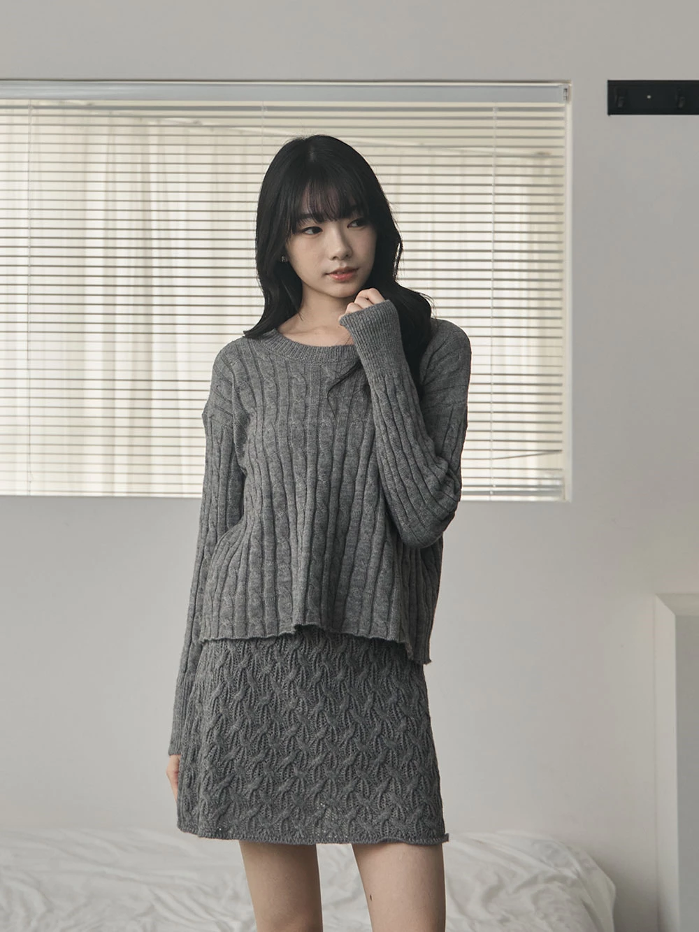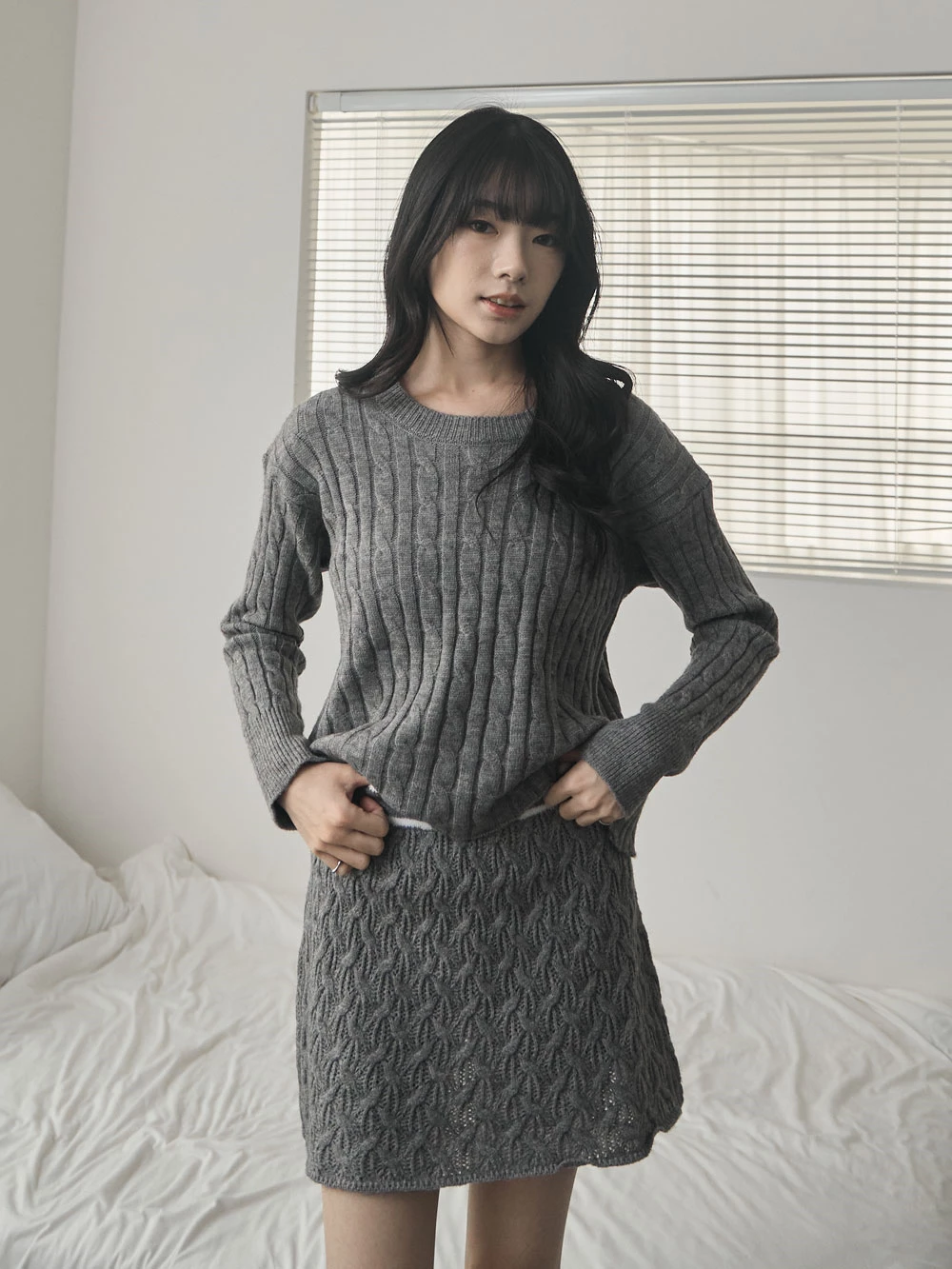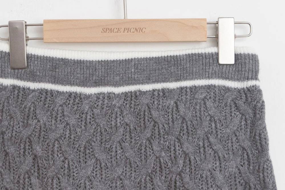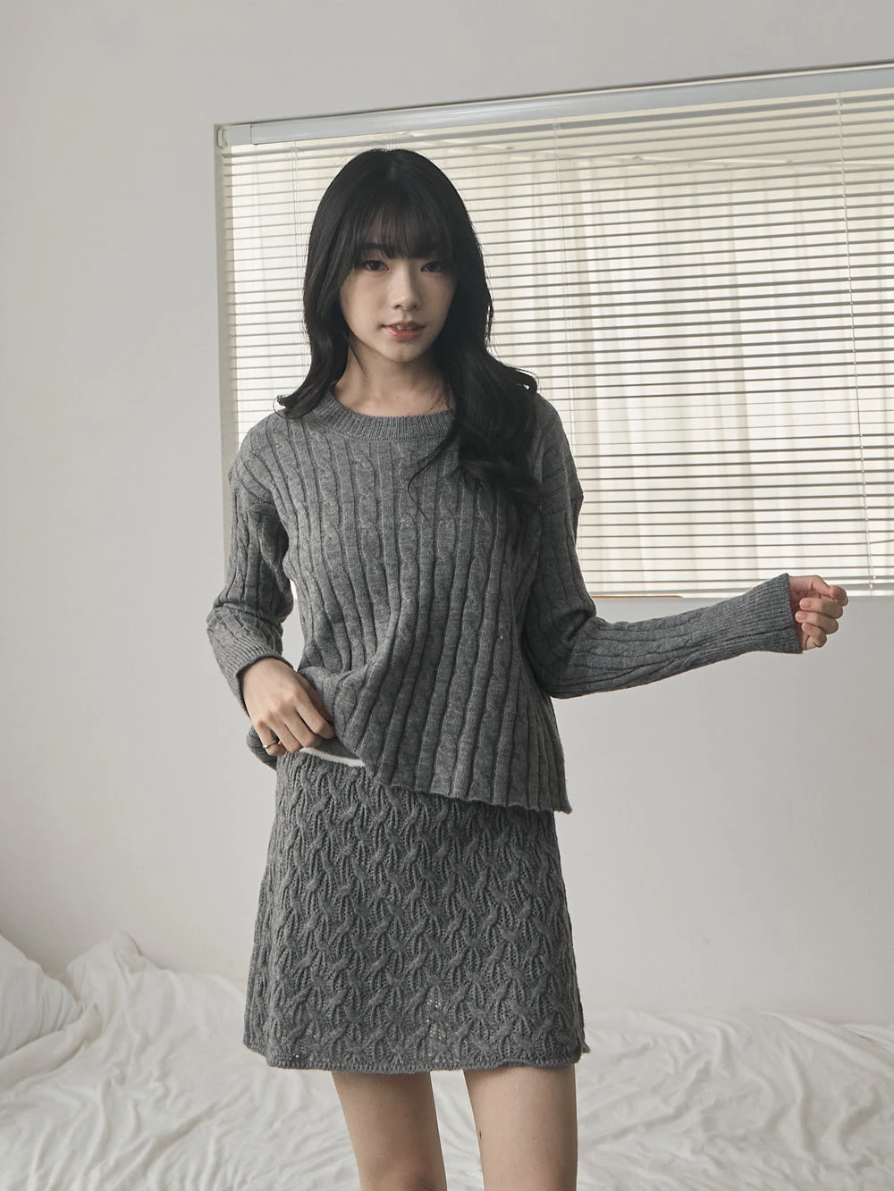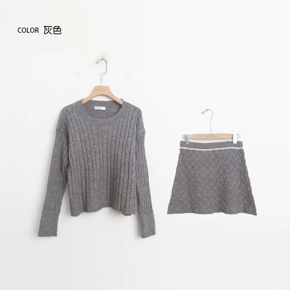 兩件式-坑條針織上衣+縷空短裙