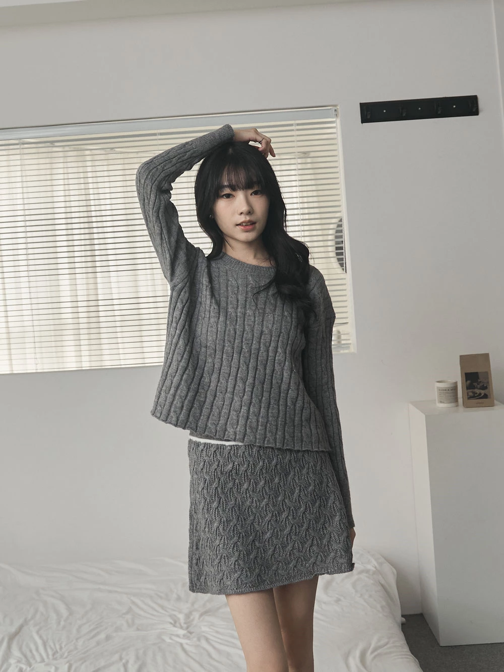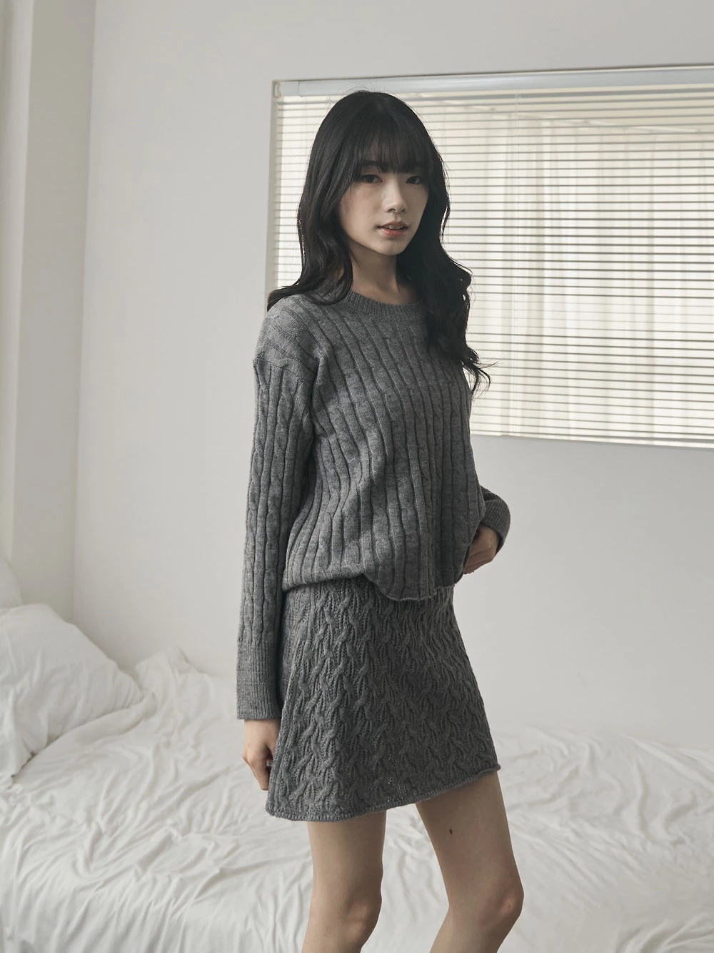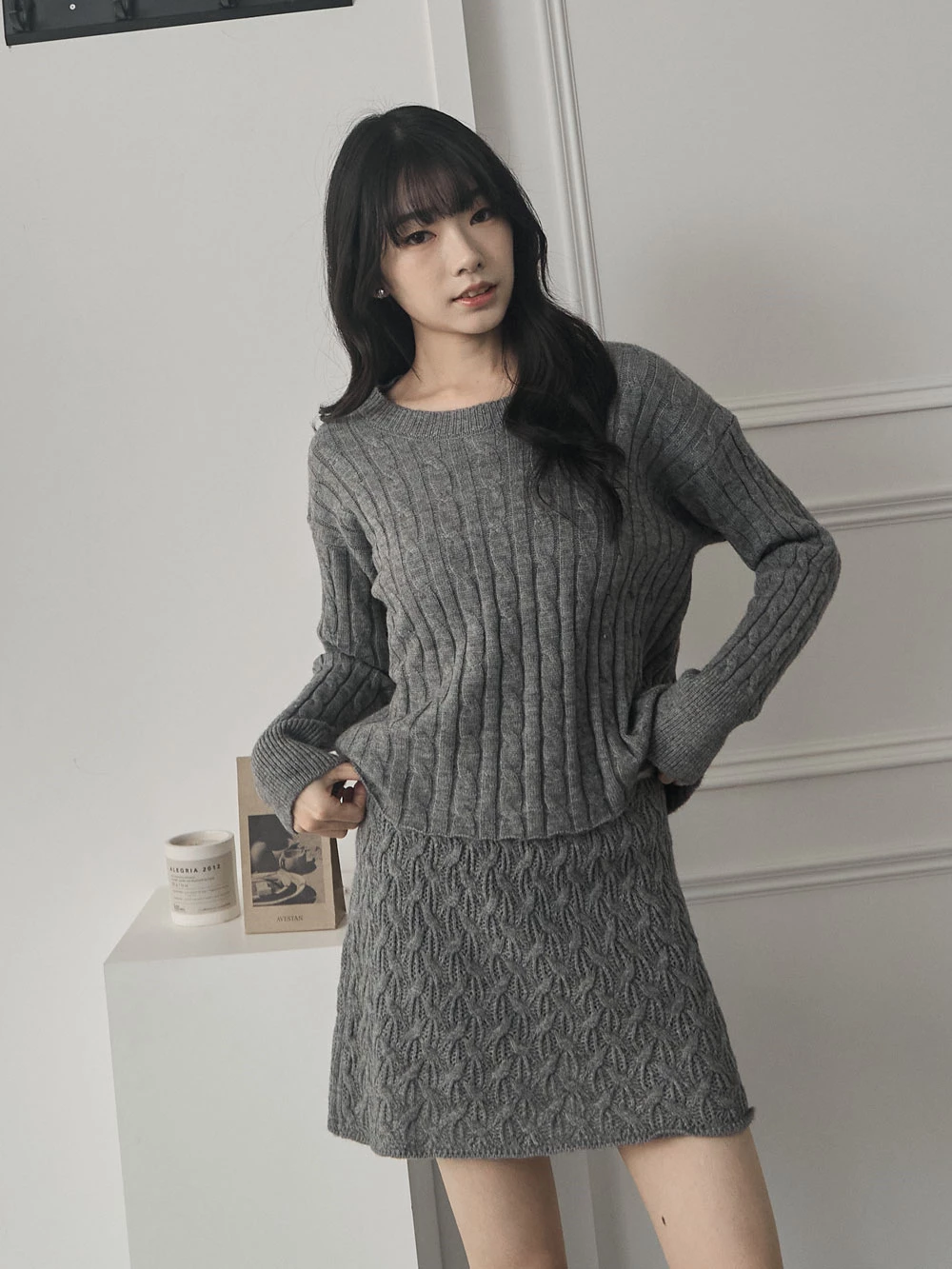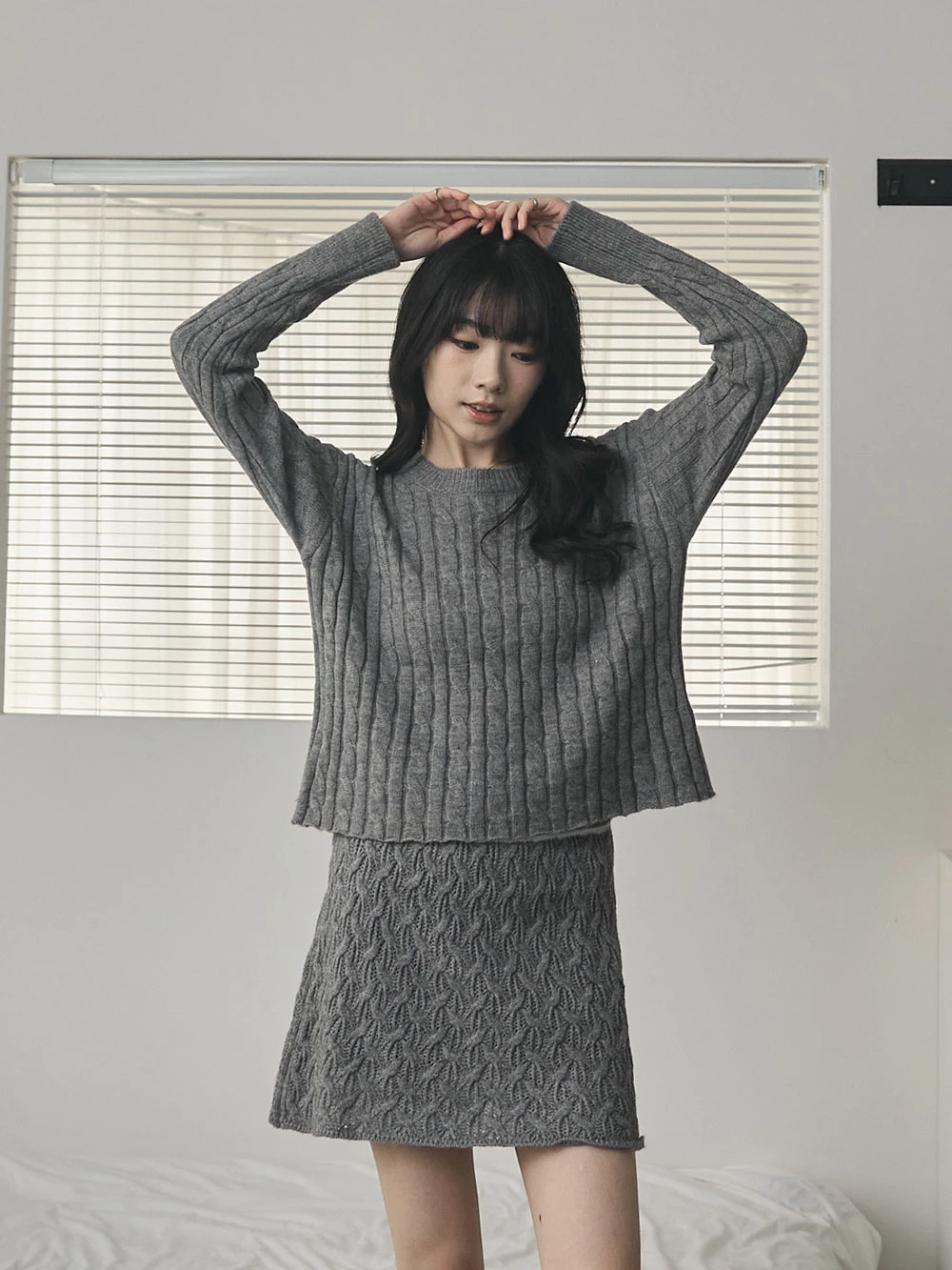 兩件式-坑條針織上衣+縷空短裙