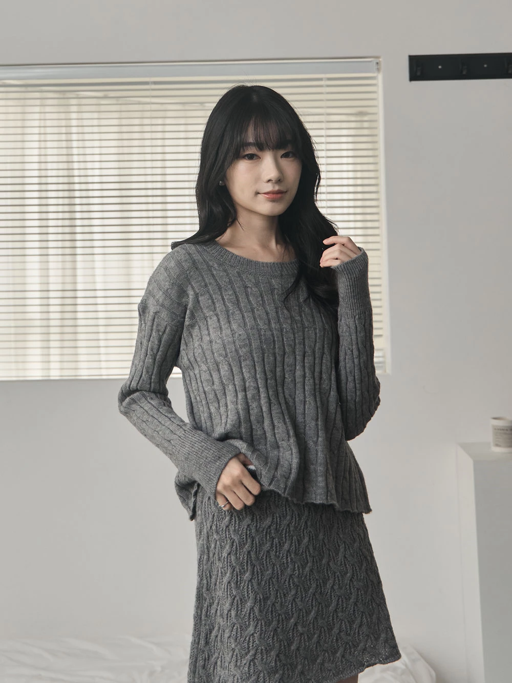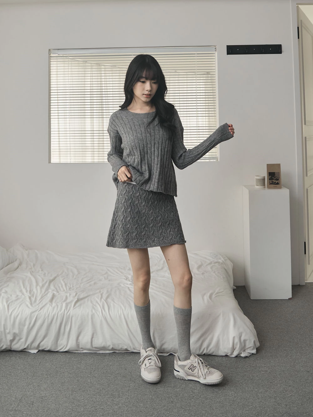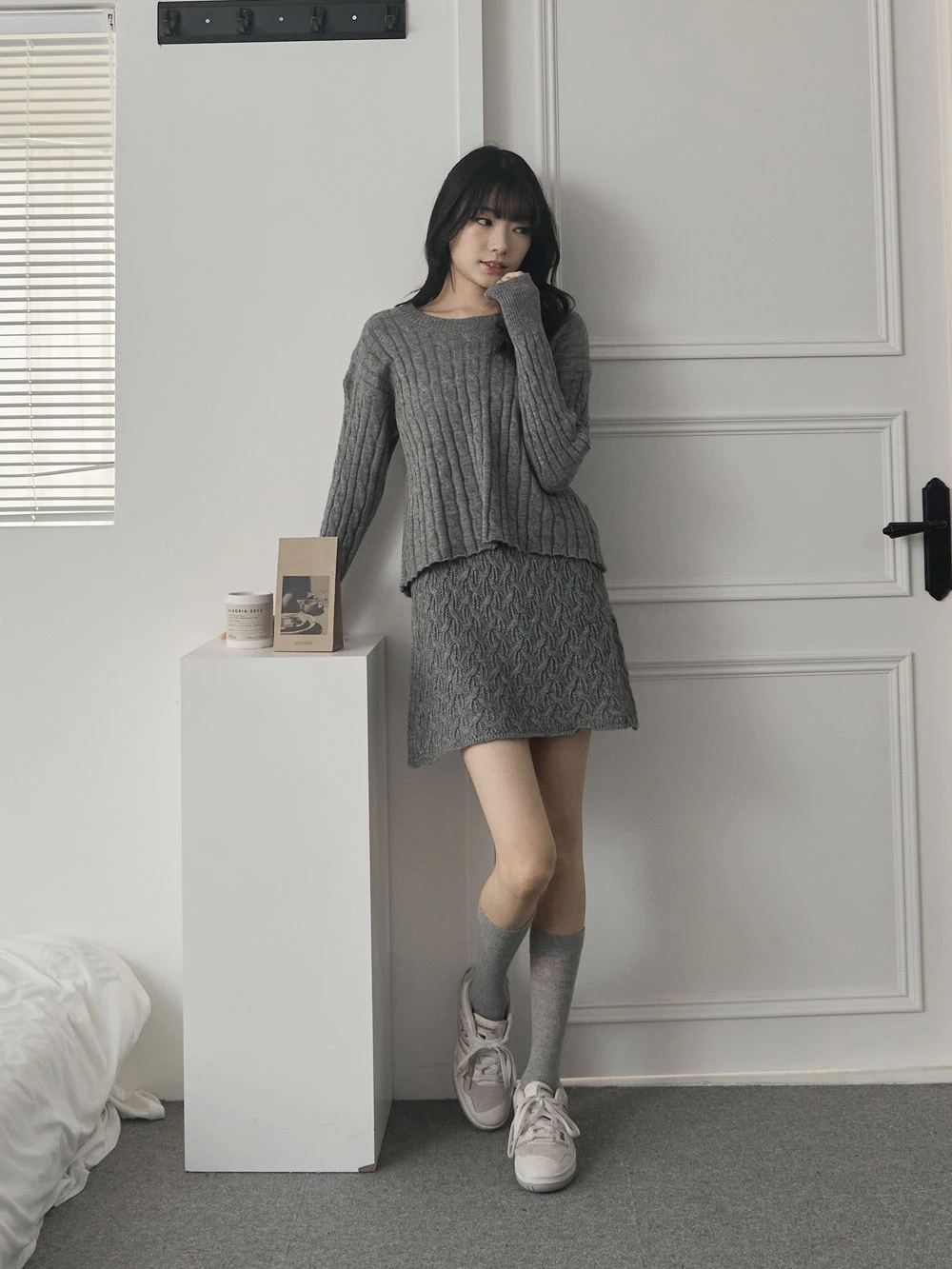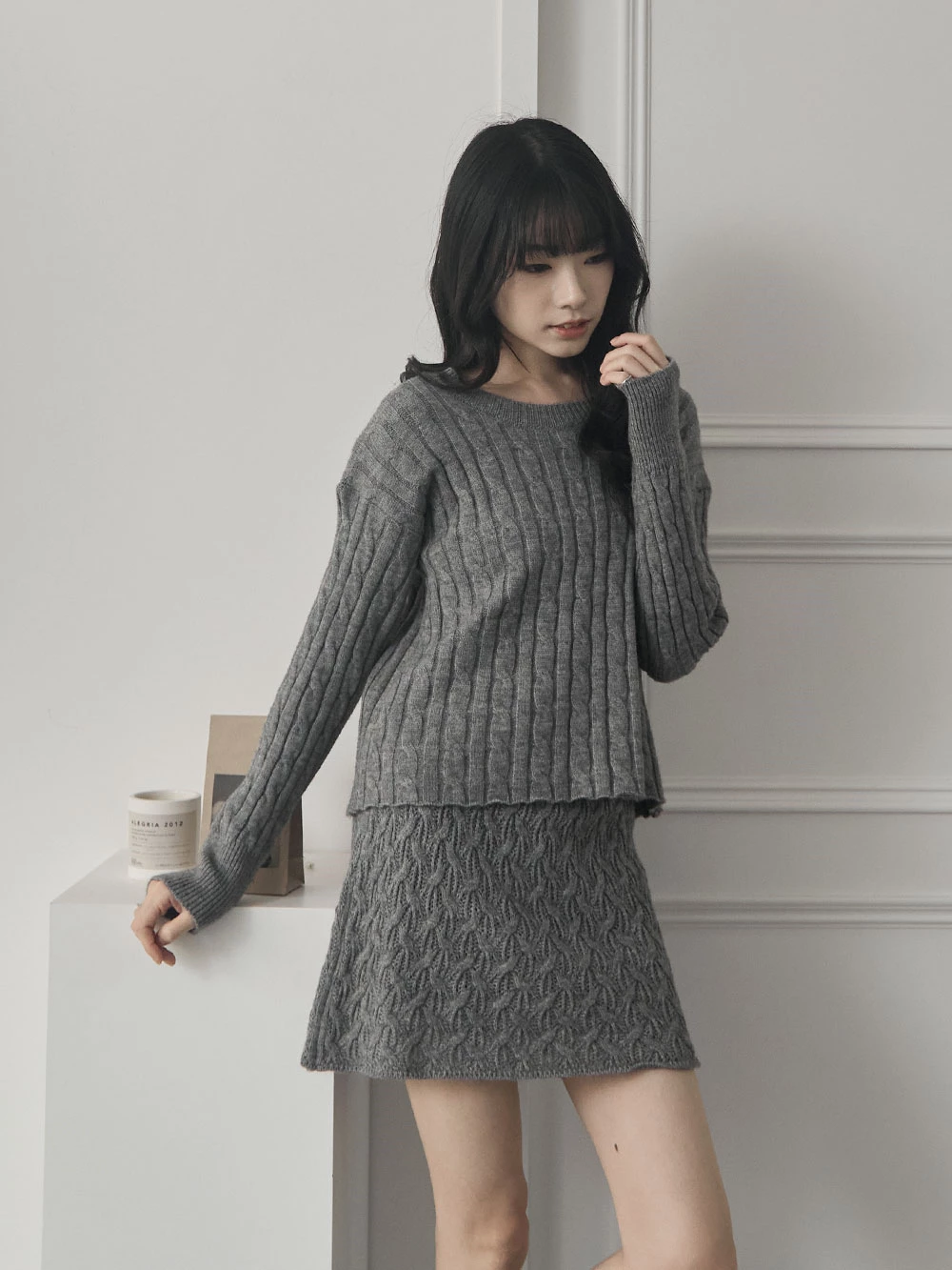 兩件式-坑條針織上衣+縷空短裙