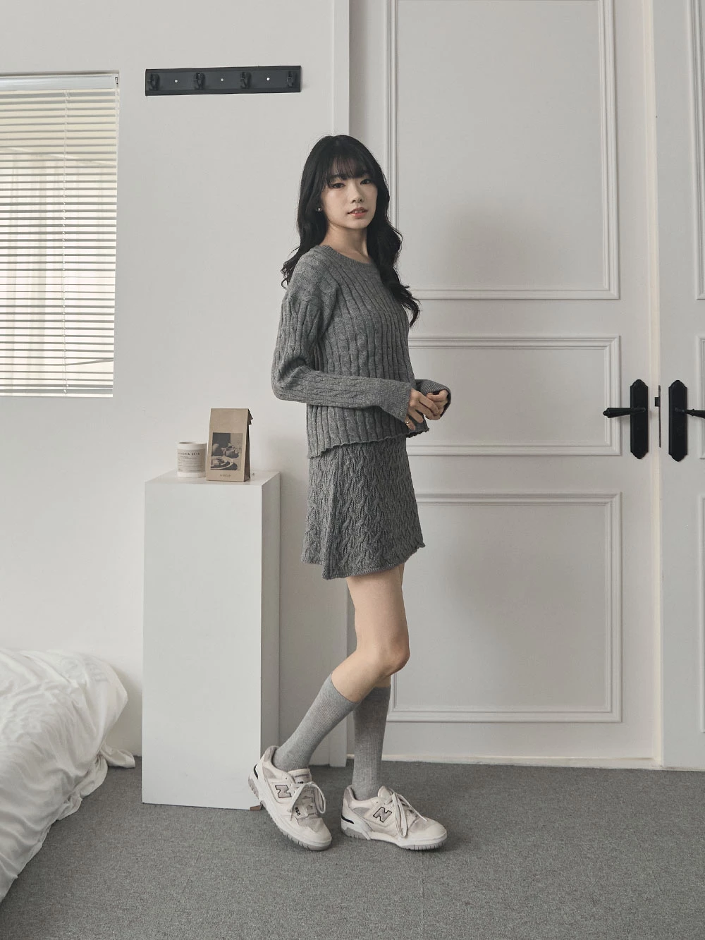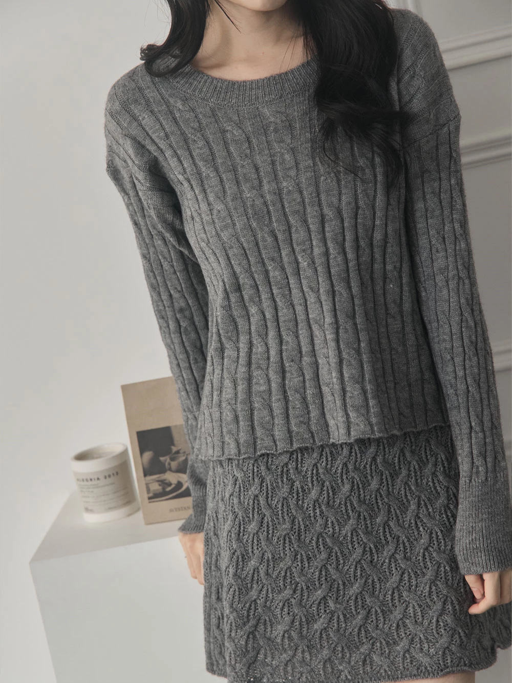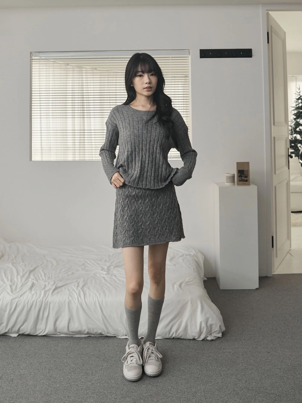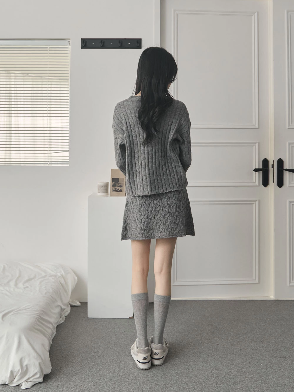 兩件式-坑條針織上衣+縷空短裙