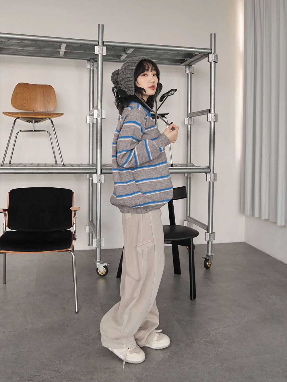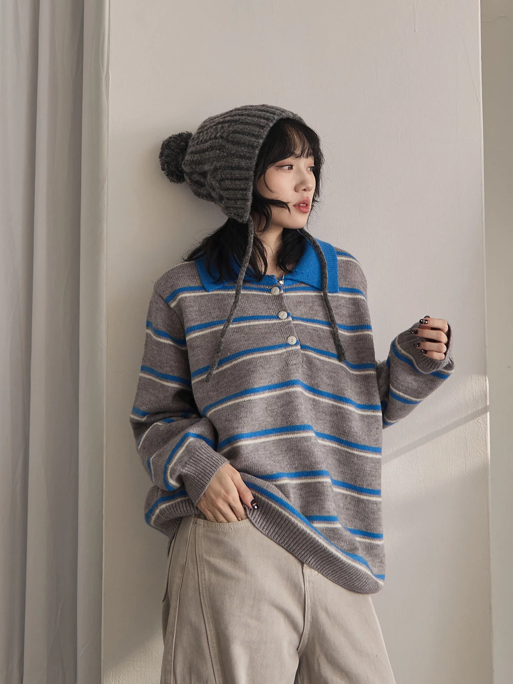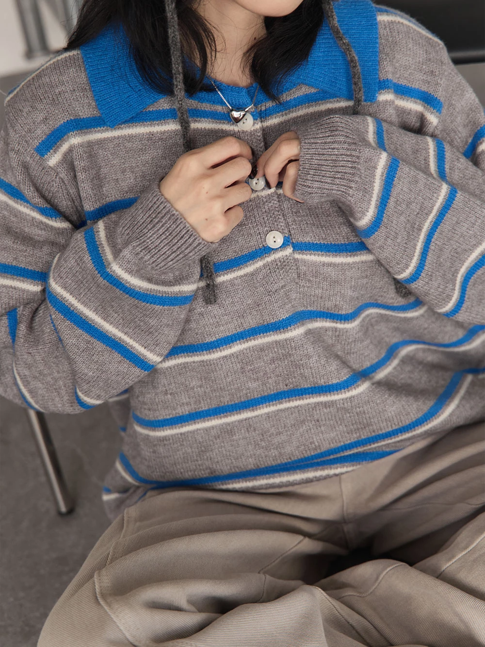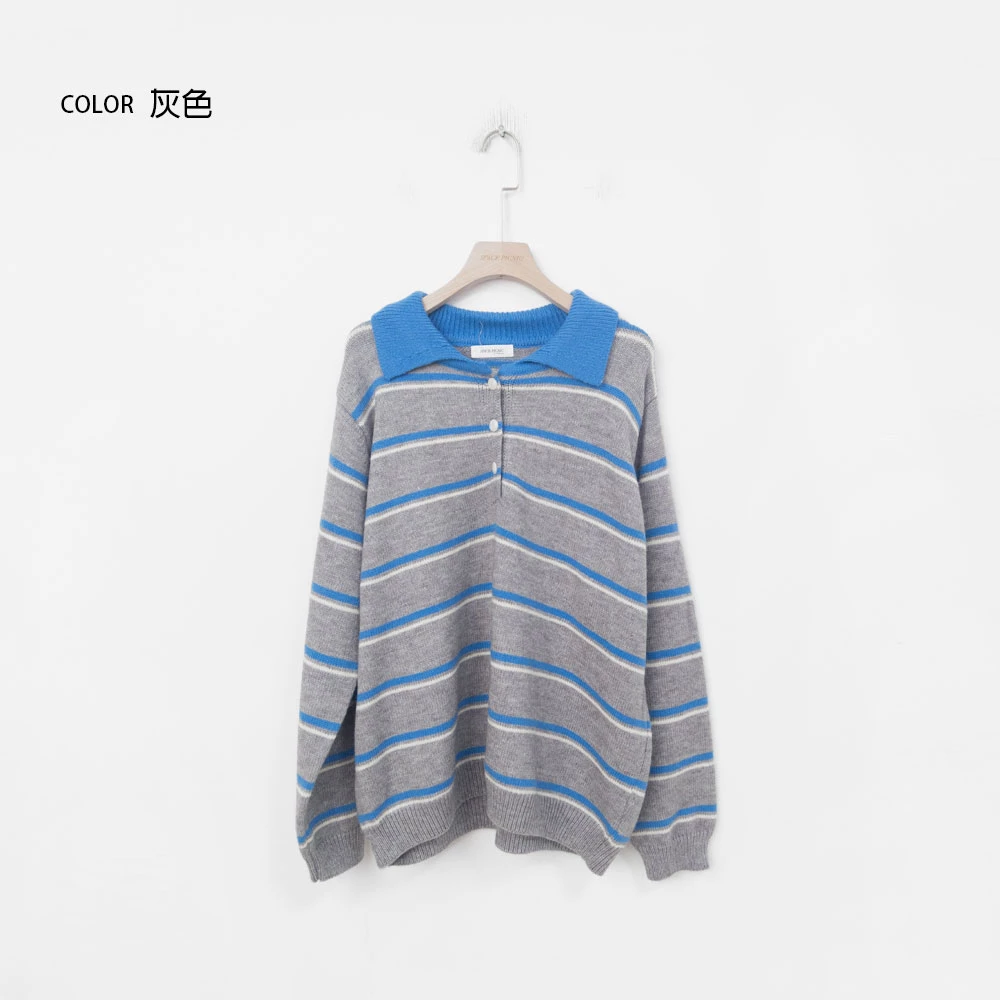 撞色翻領條紋針織上衣