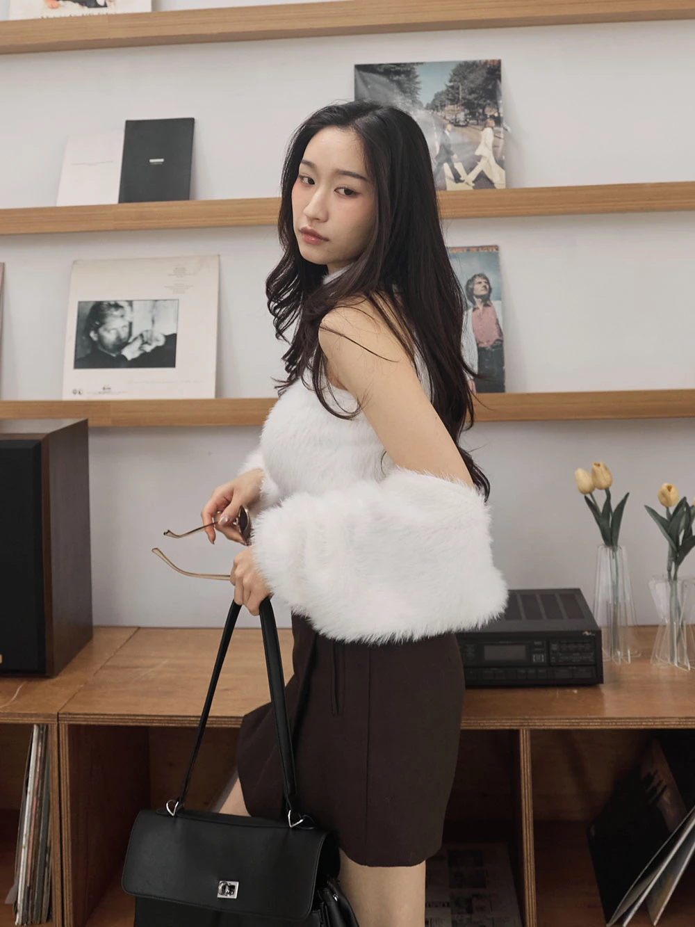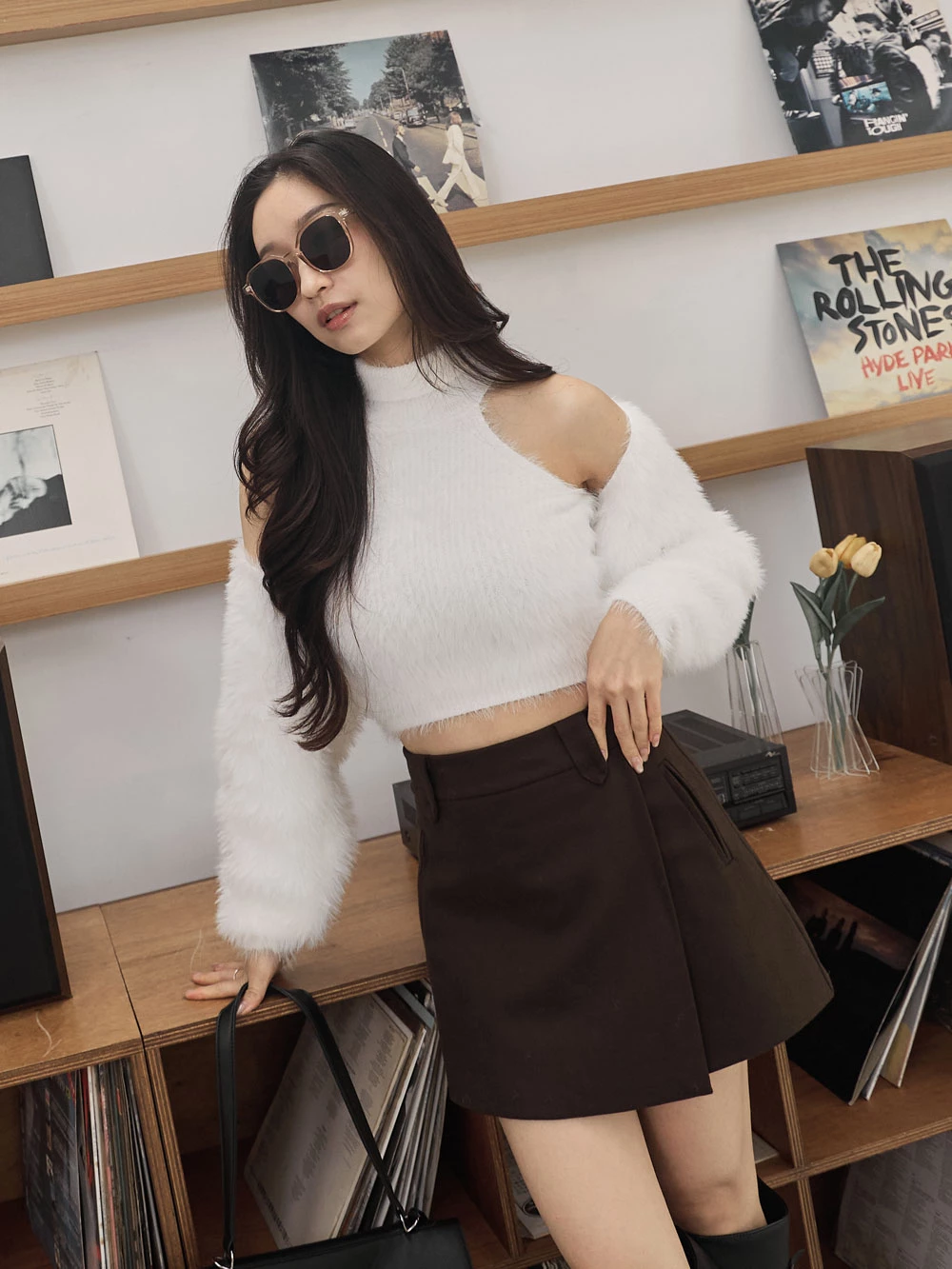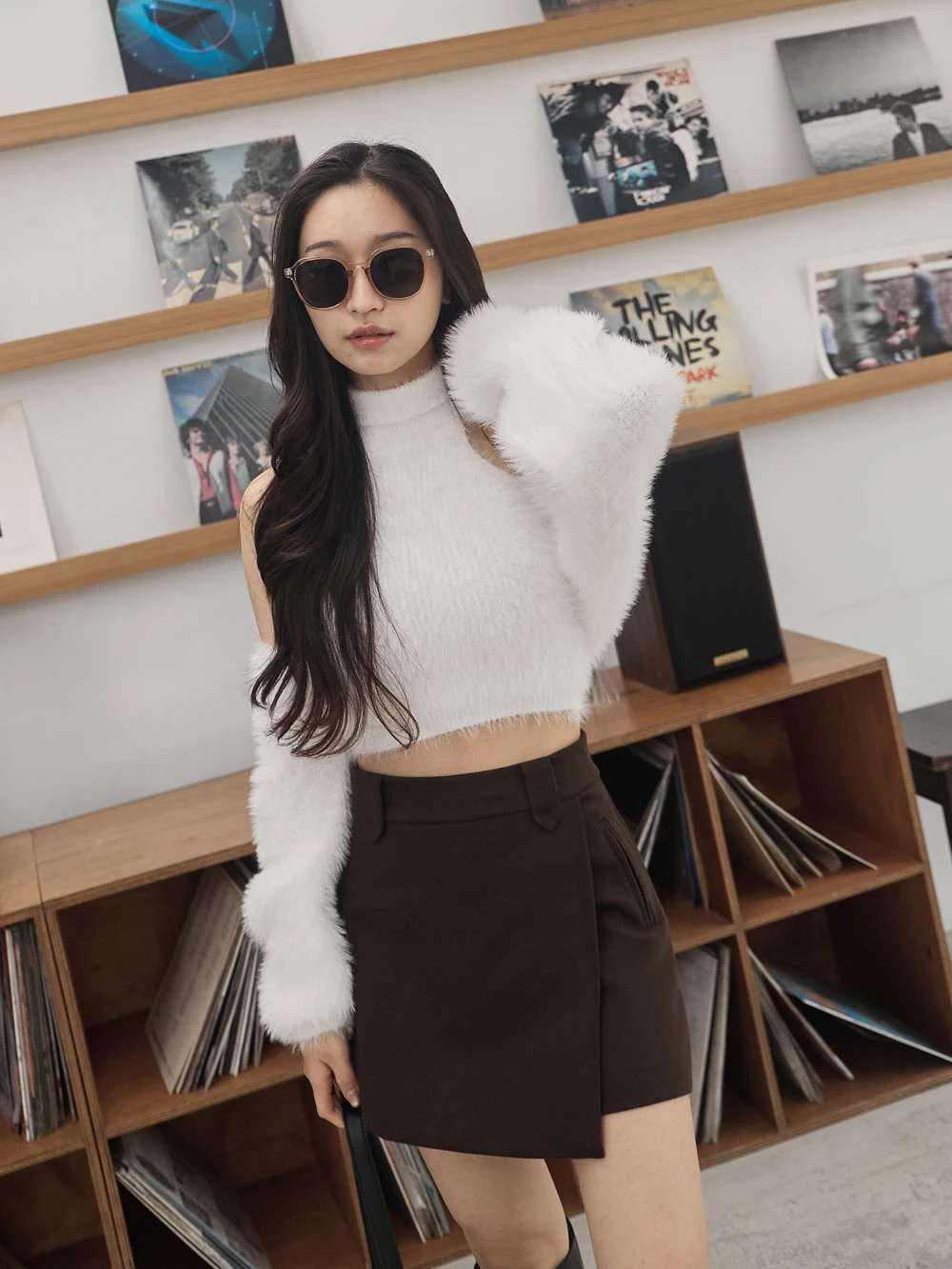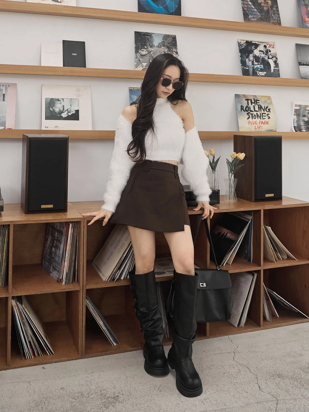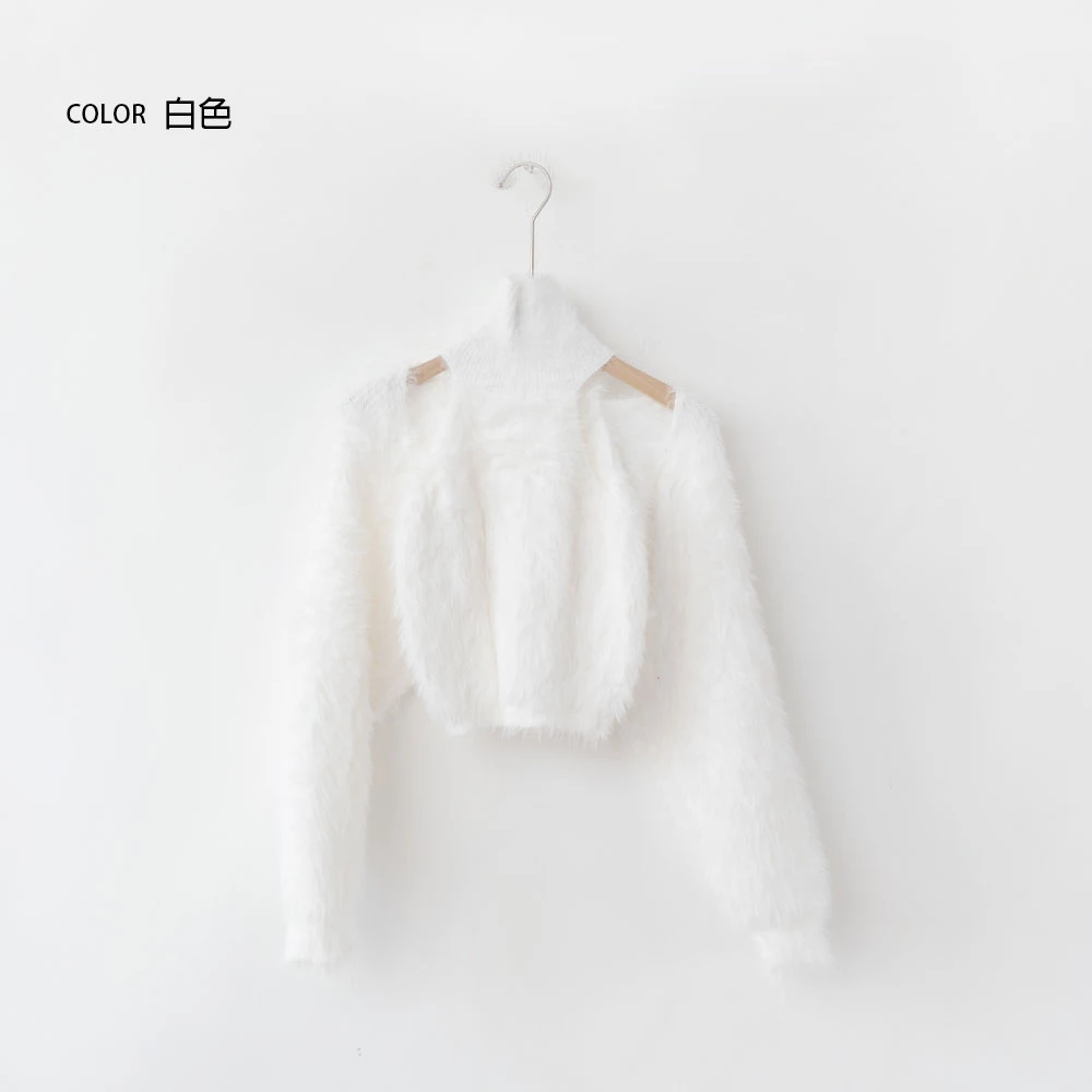 兩件式-高領削肩背心+水貂毛針織外套