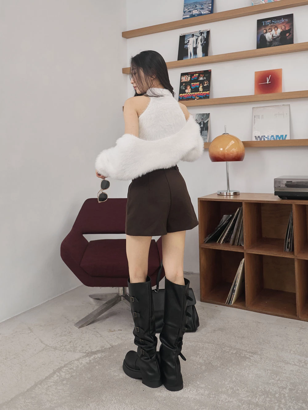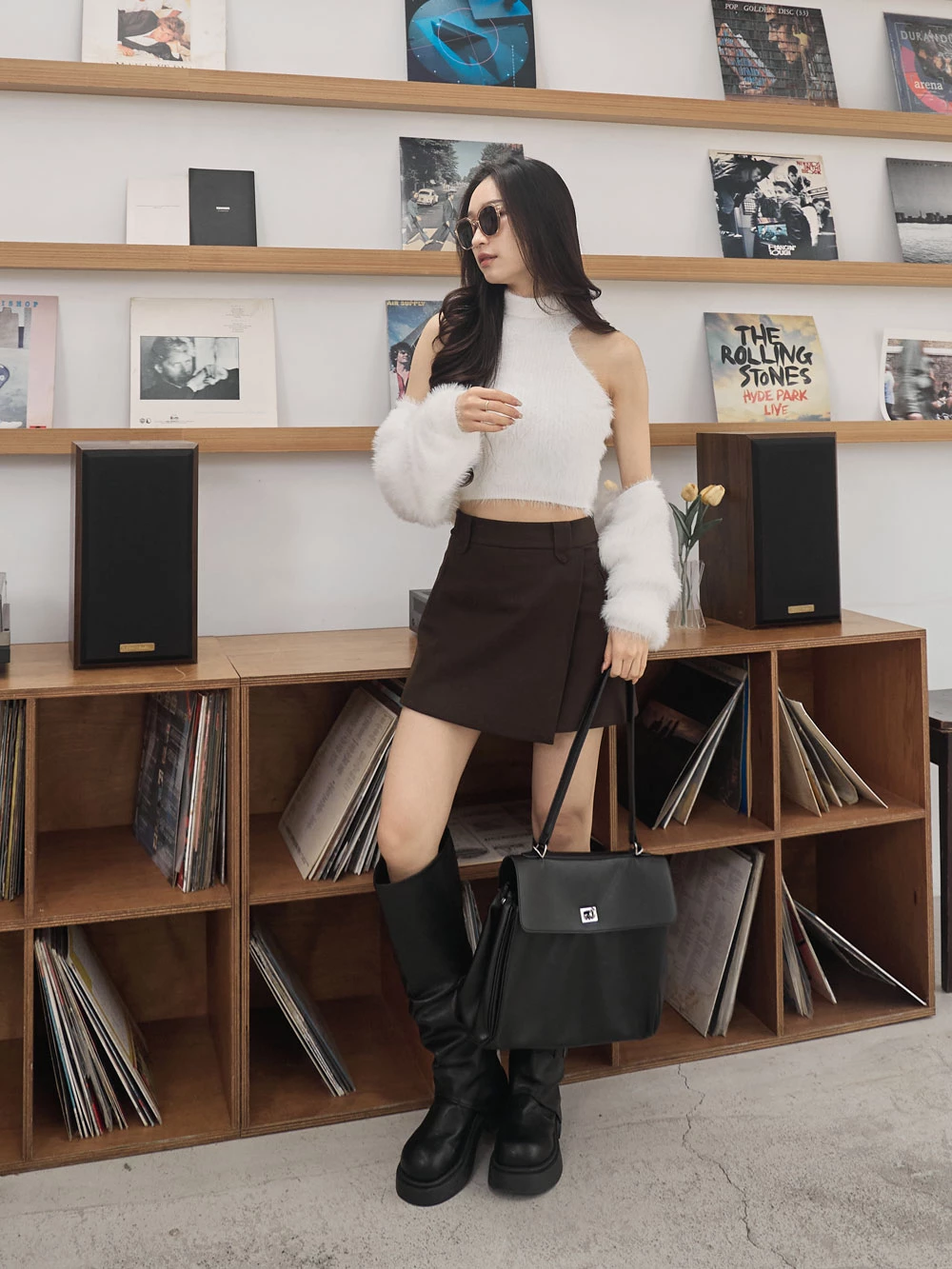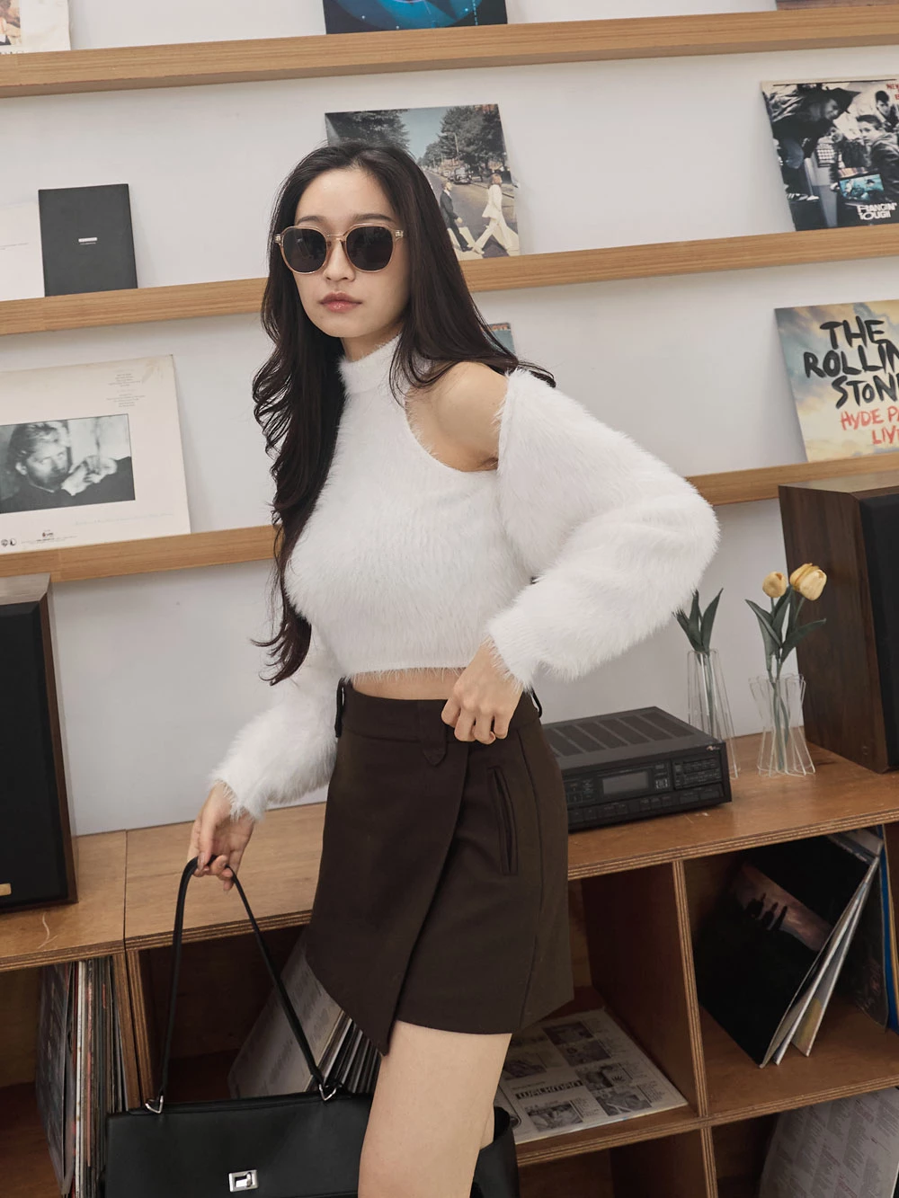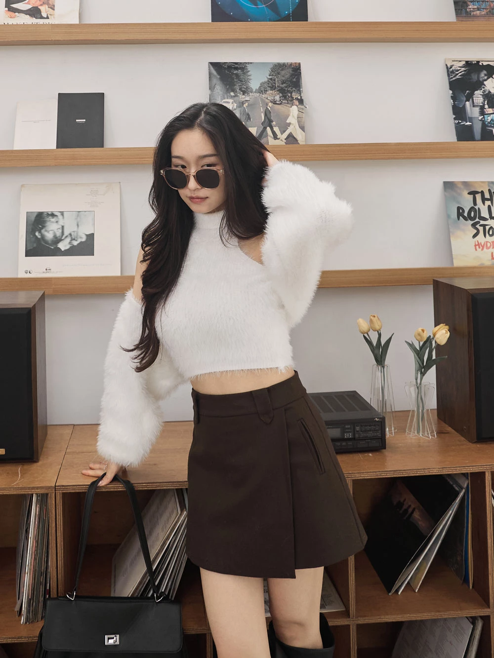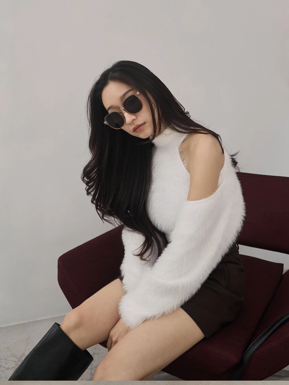 兩件式-高領削肩背心+水貂毛針織外套
