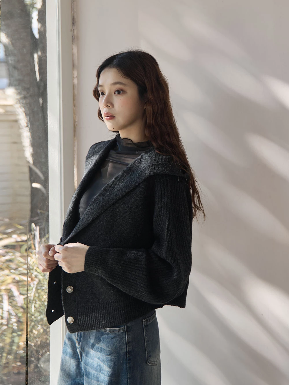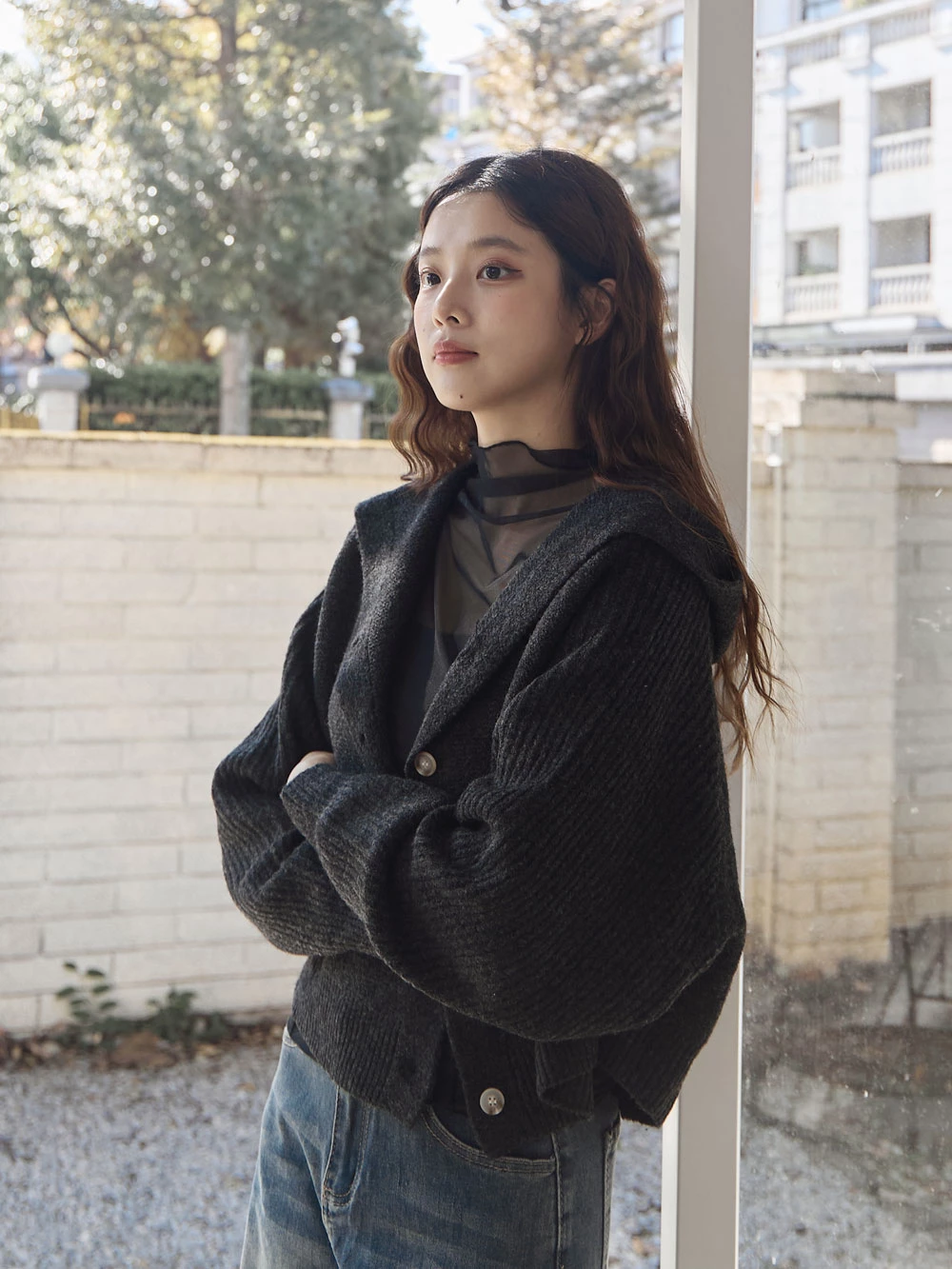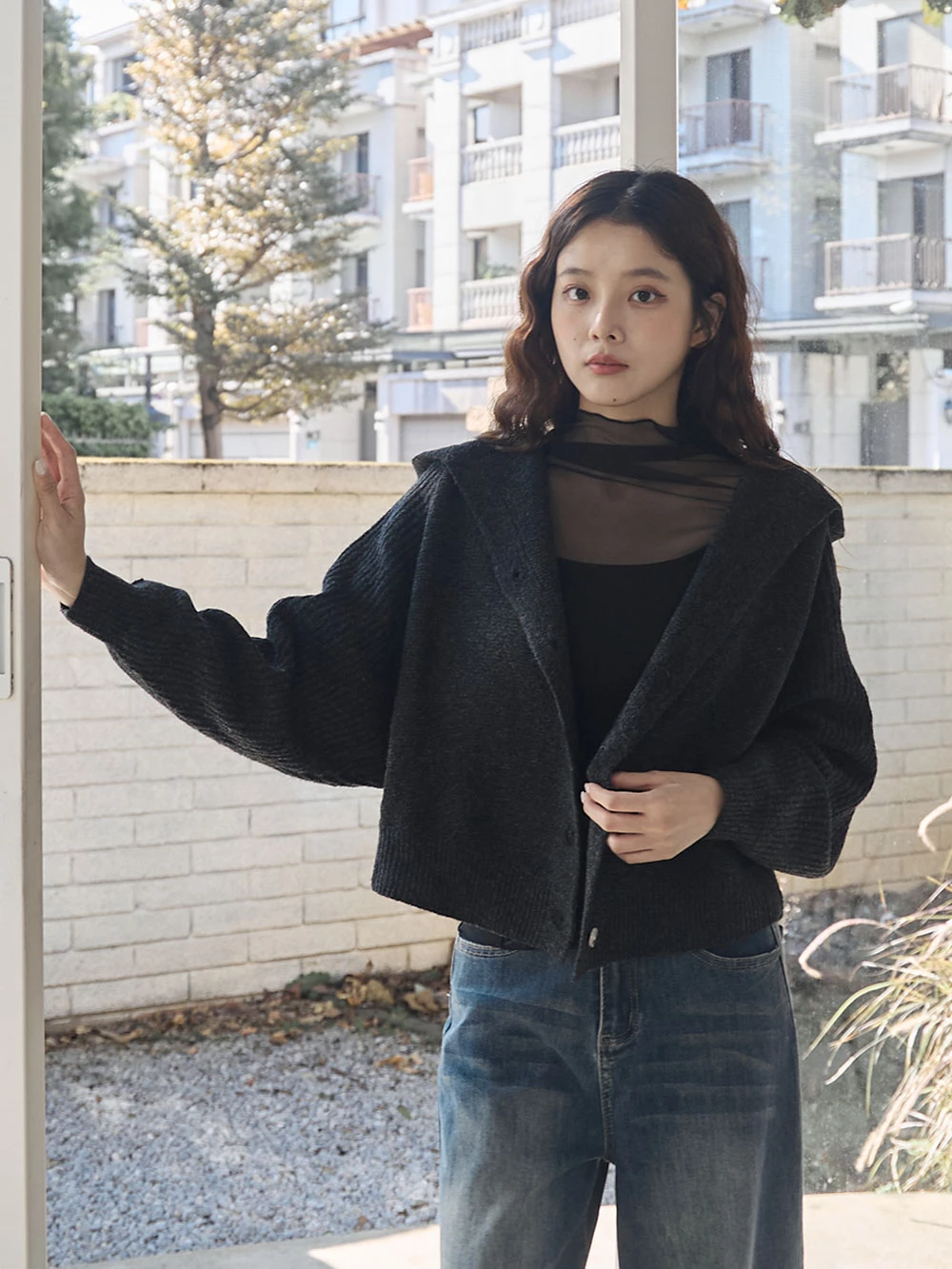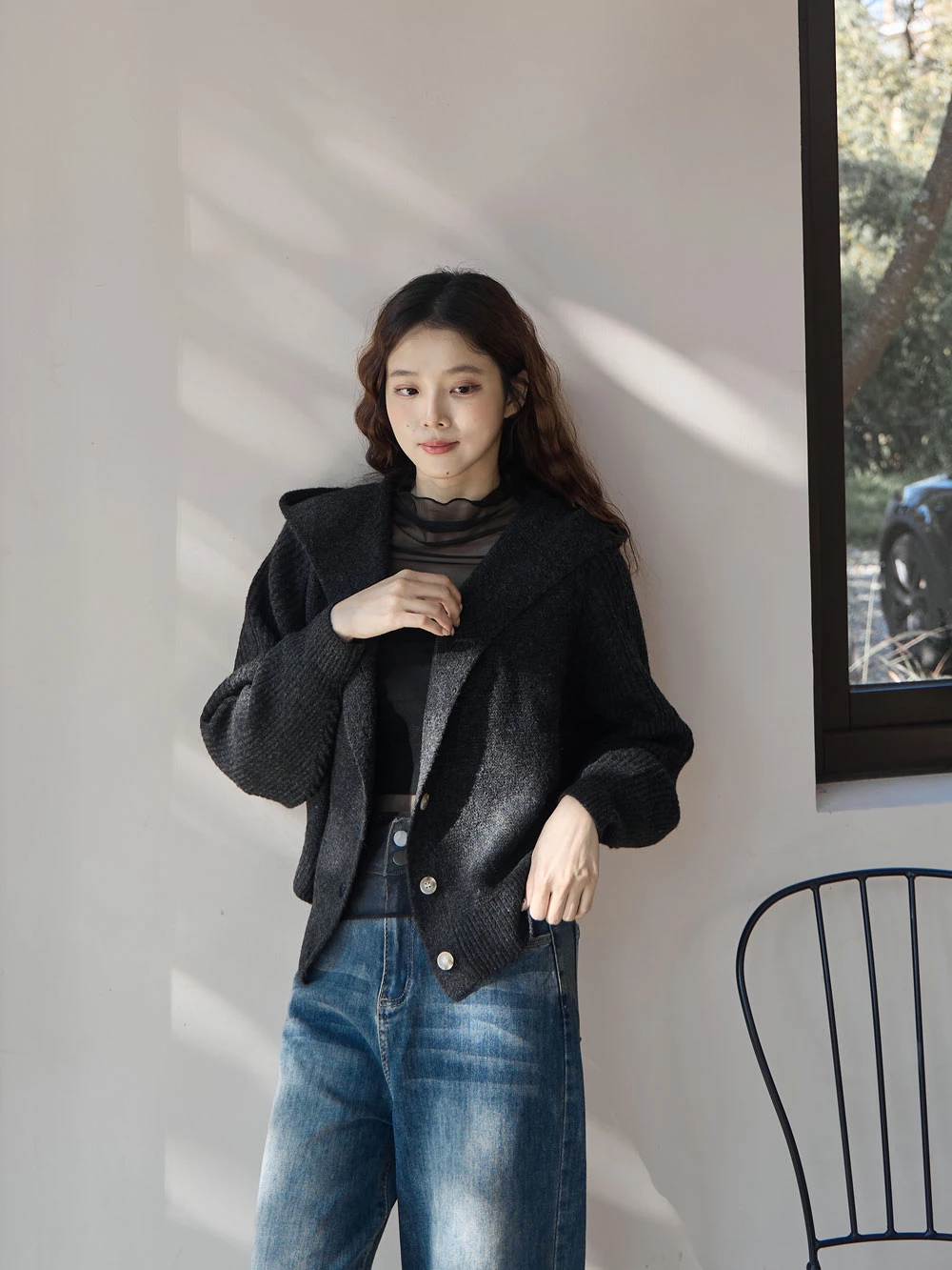 短版澎袖針織連帽外套