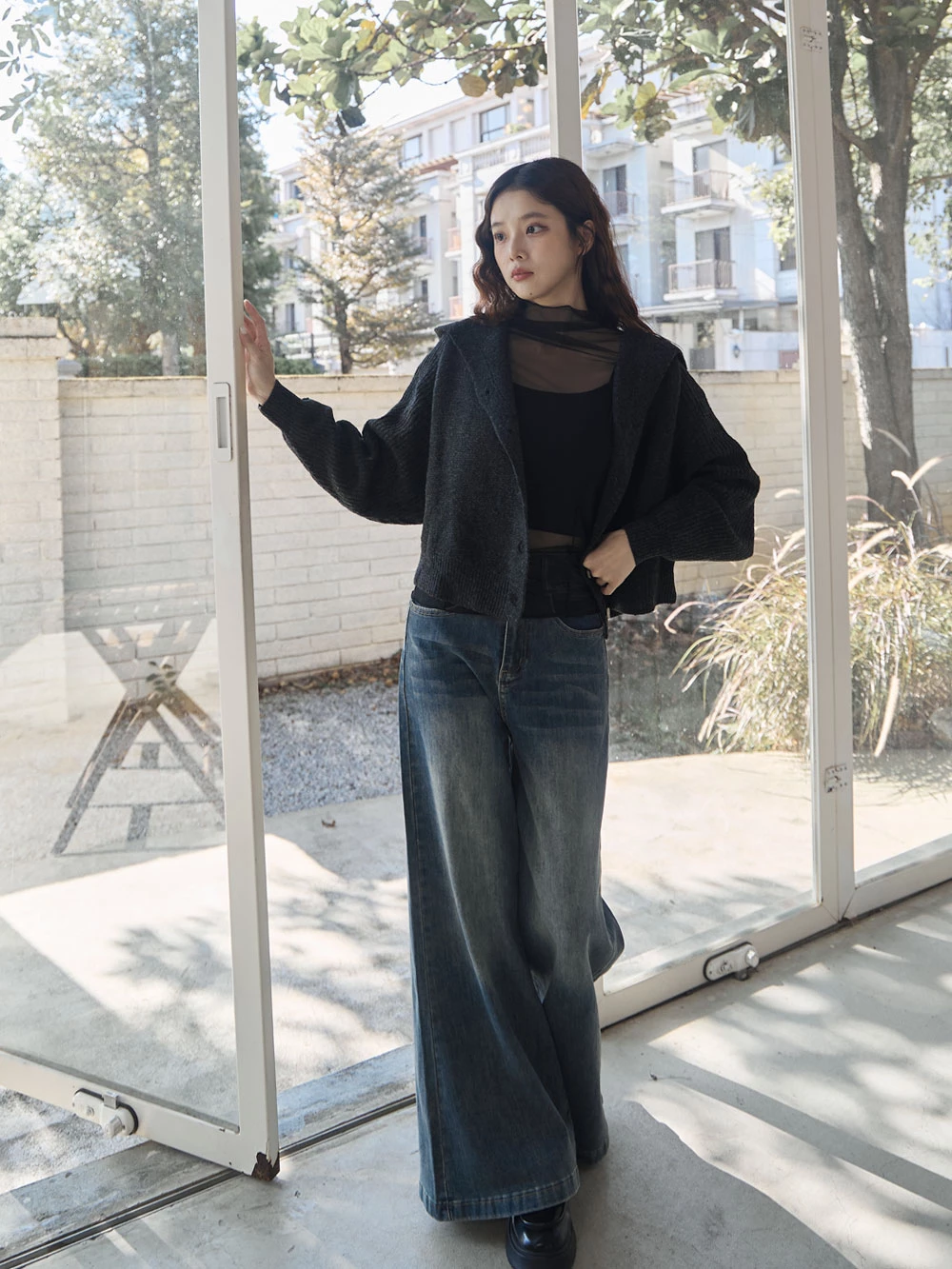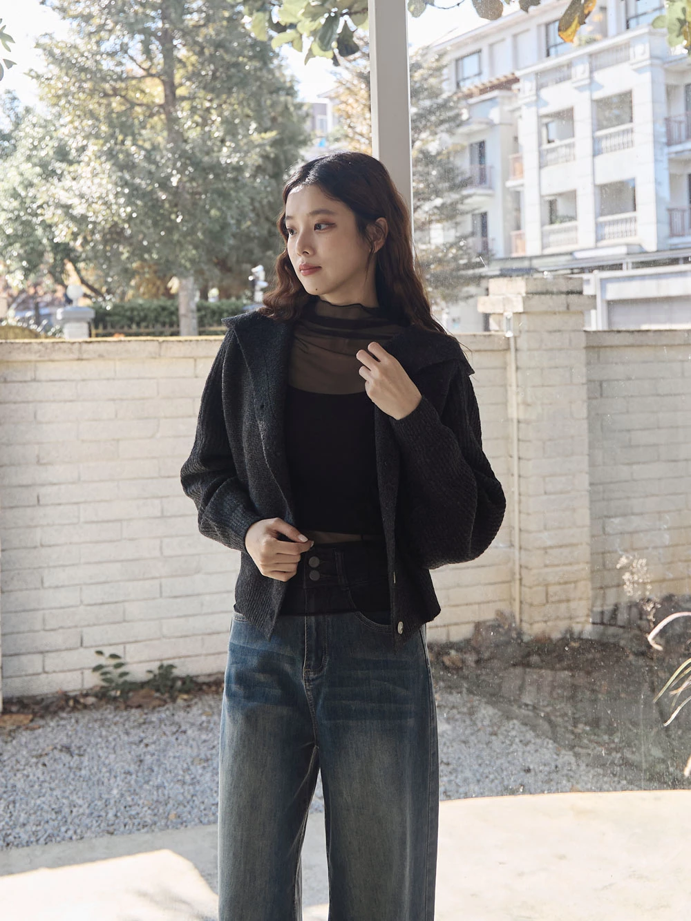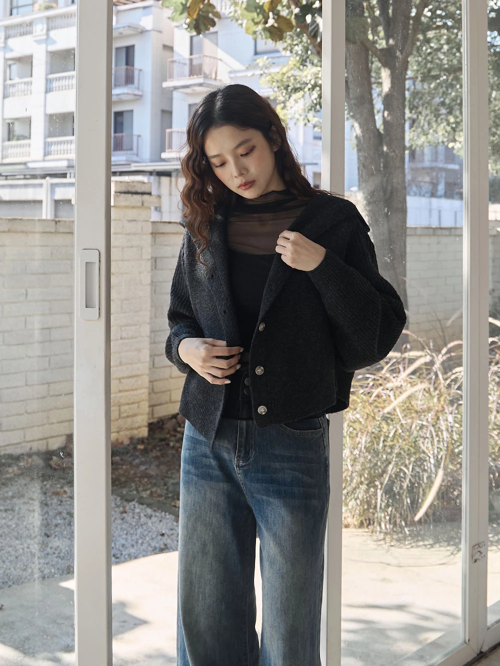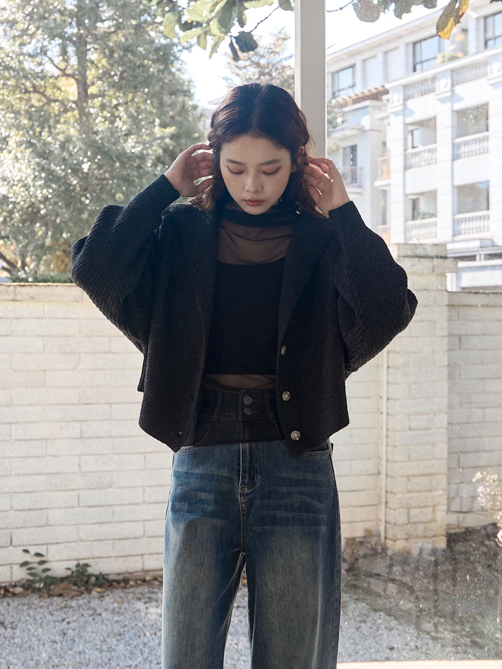 短版澎袖針織連帽外套