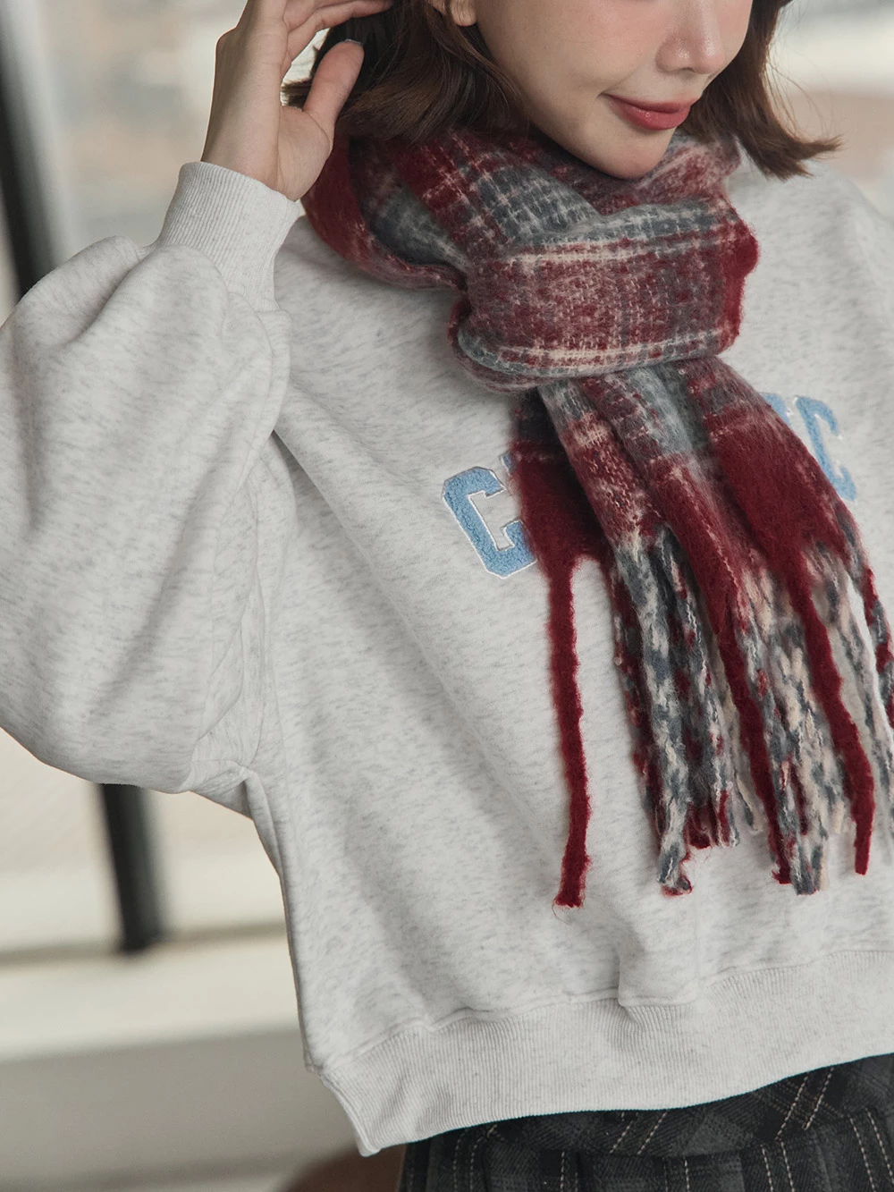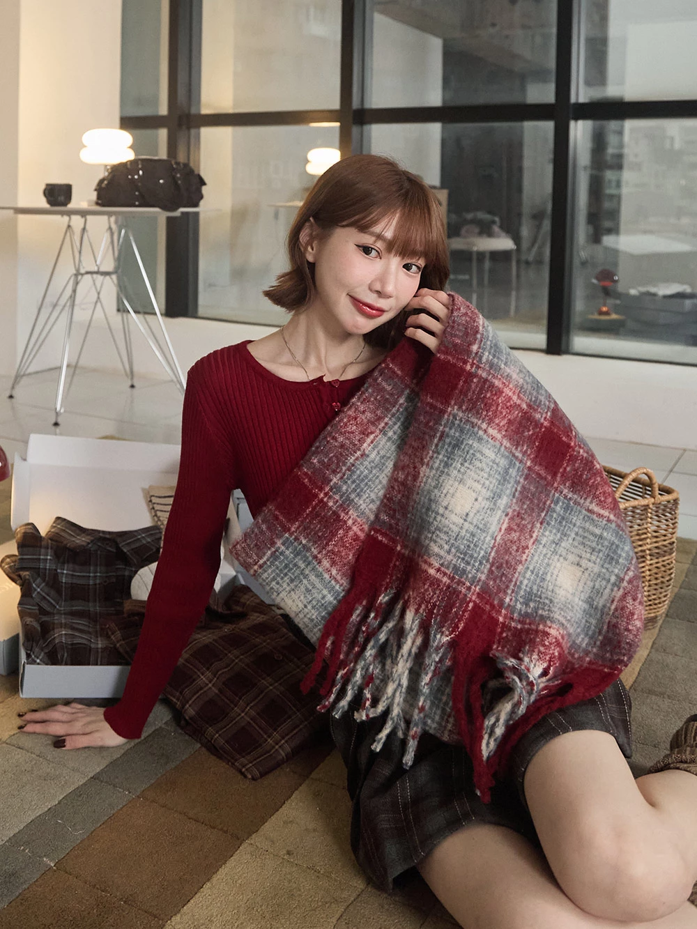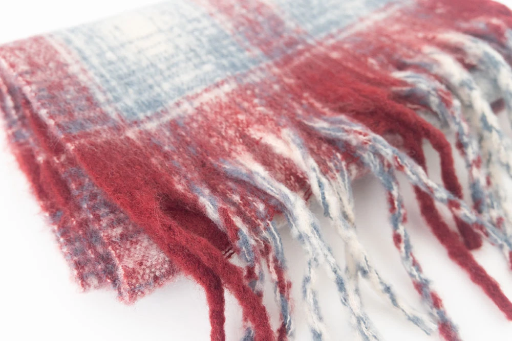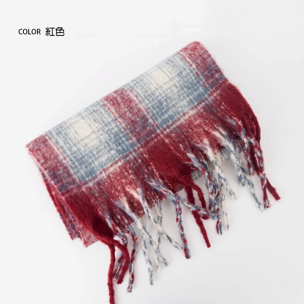 線條格紋針織流蘇圍巾