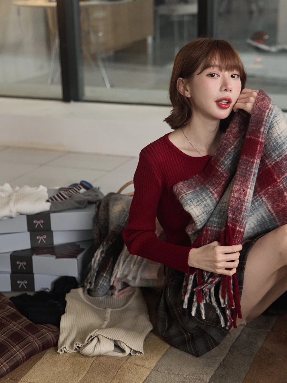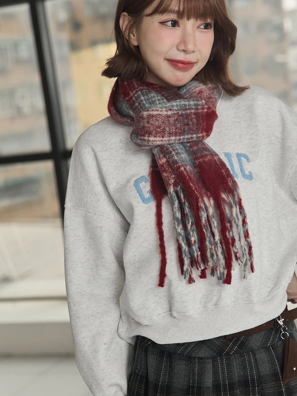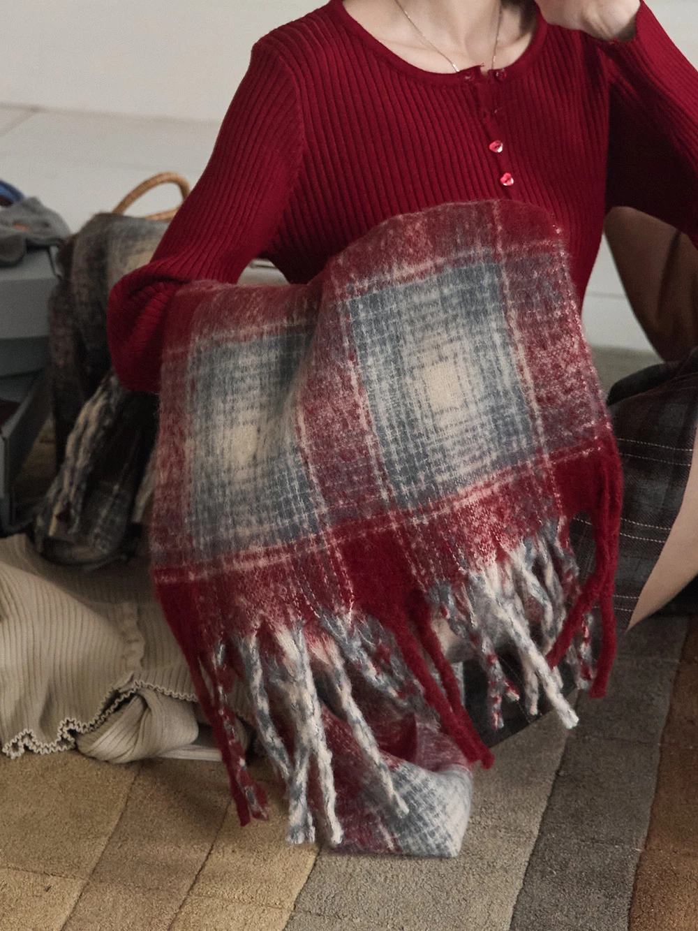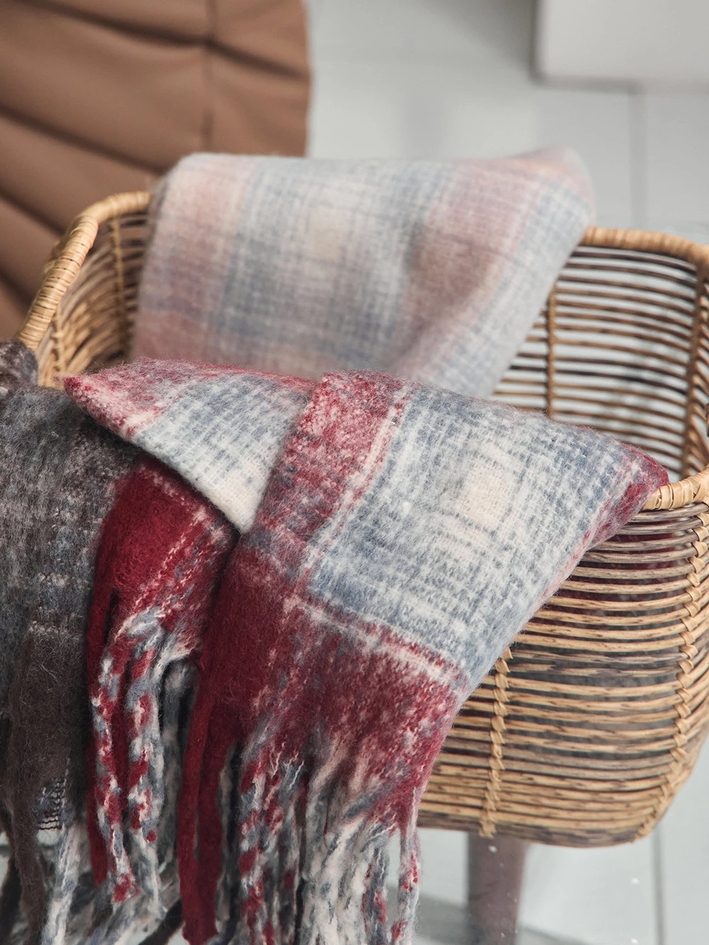 線條格紋針織流蘇圍巾
