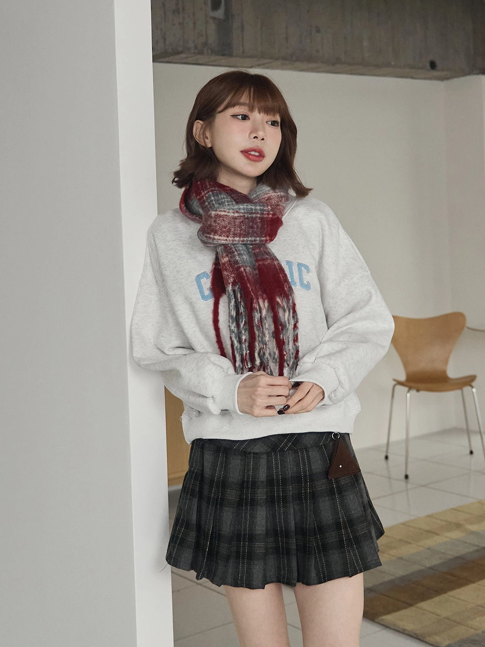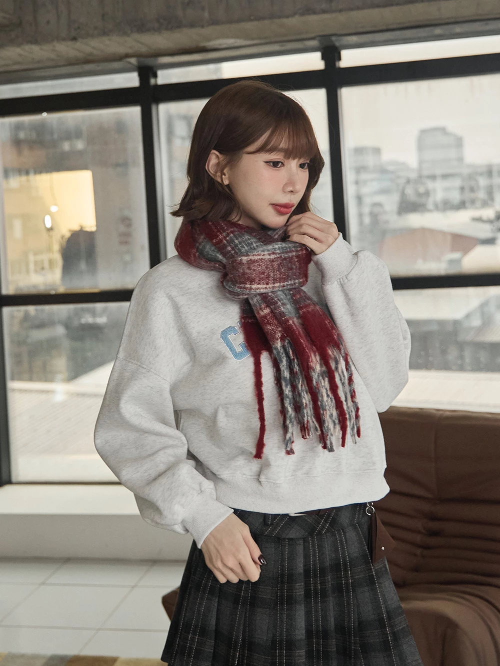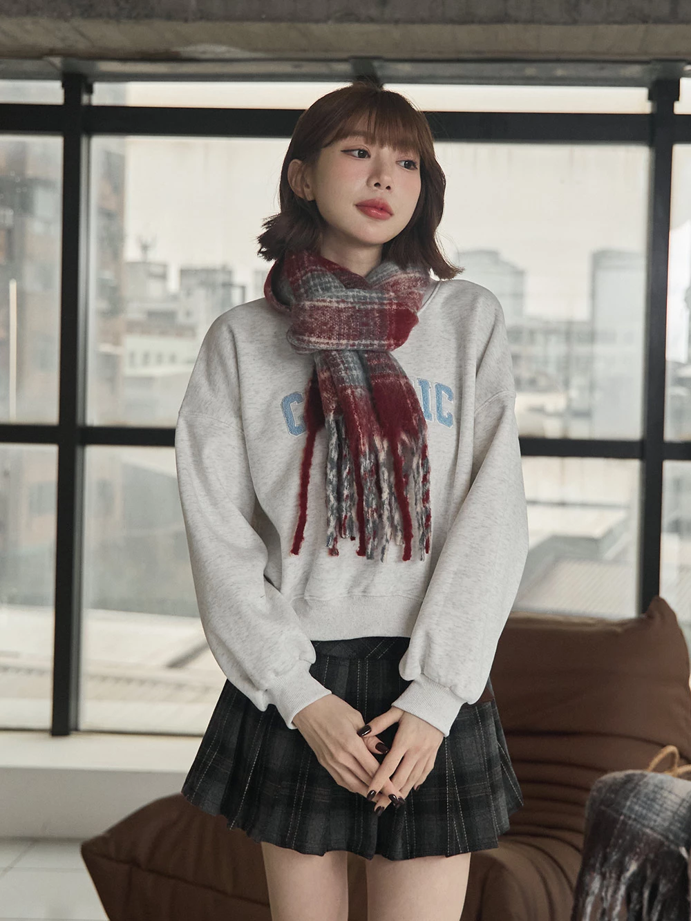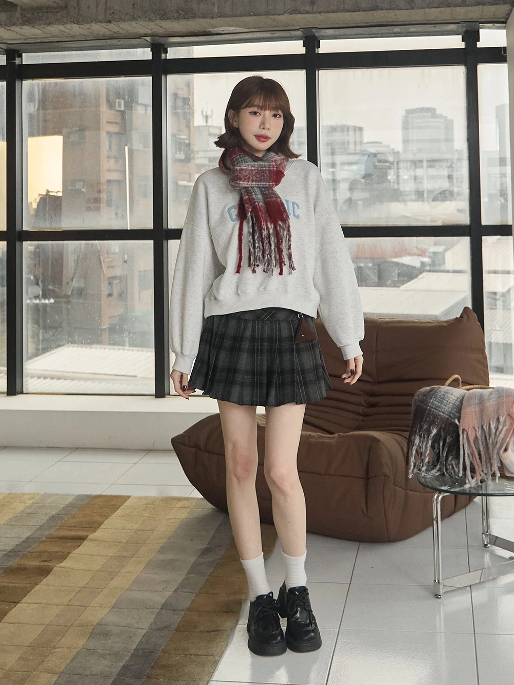 線條格紋針織流蘇圍巾