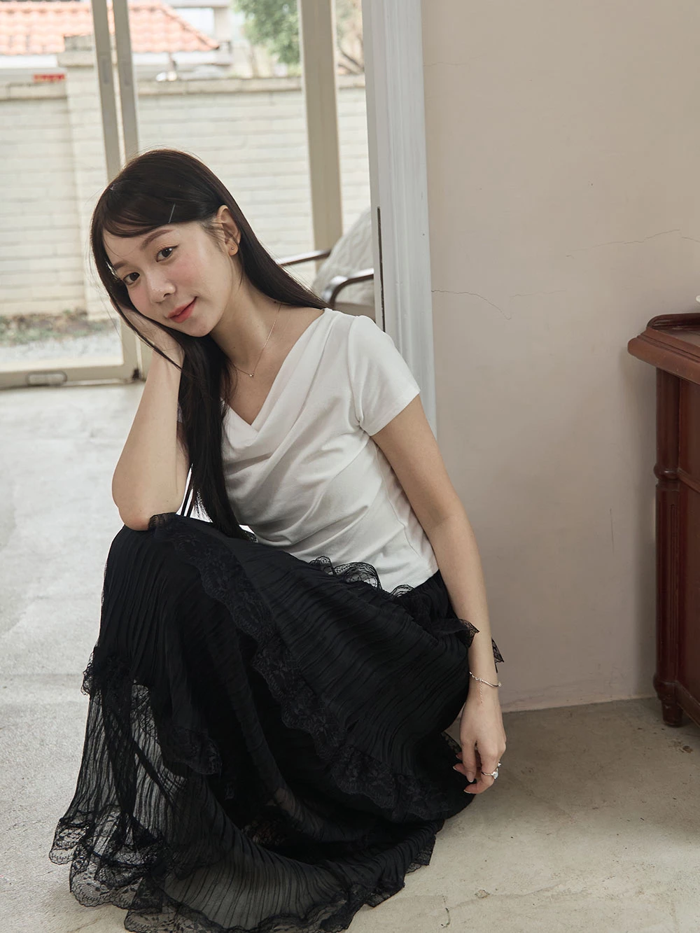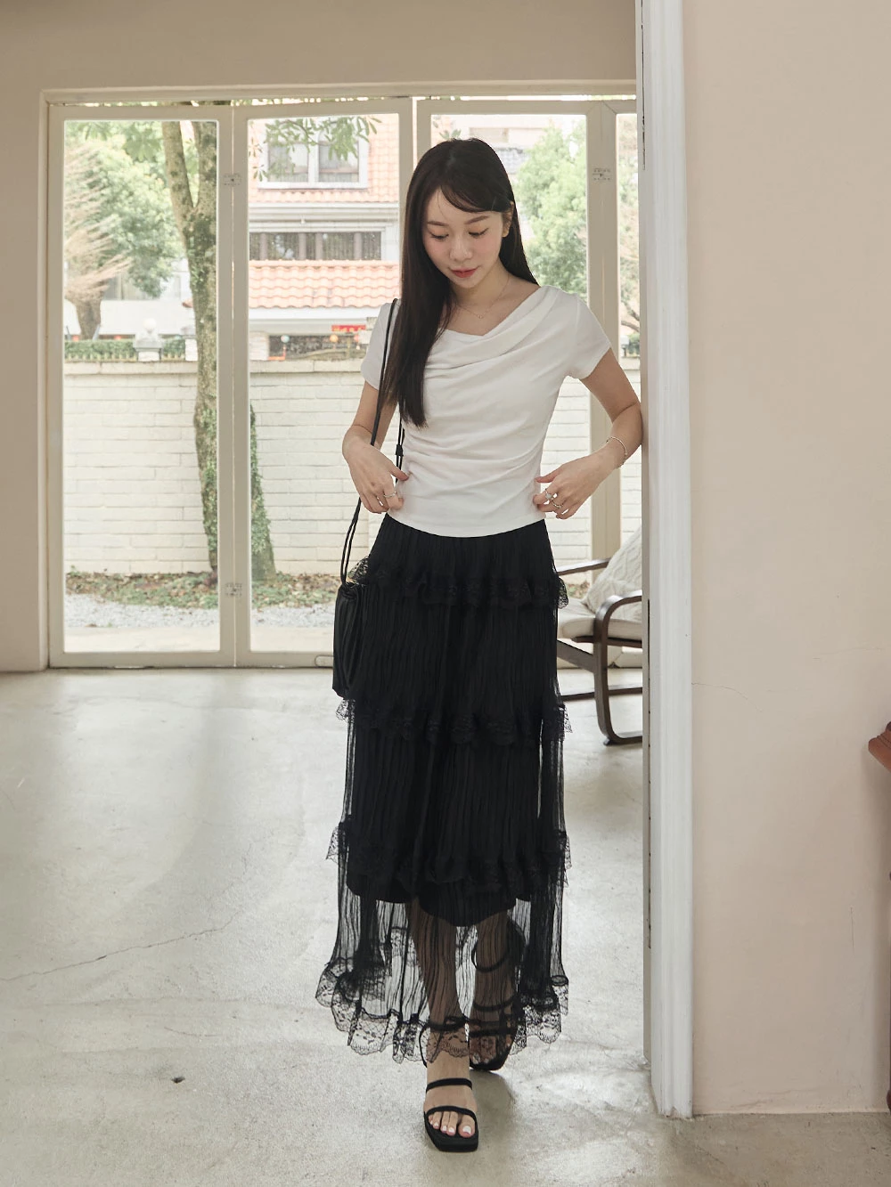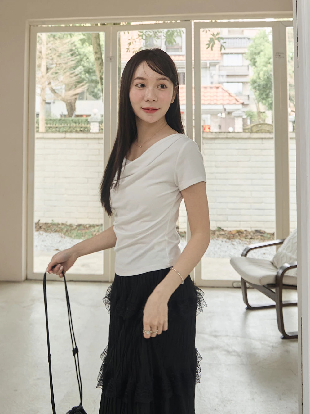 垂領抓皺柔彈短袖上衣 | Space Picnic