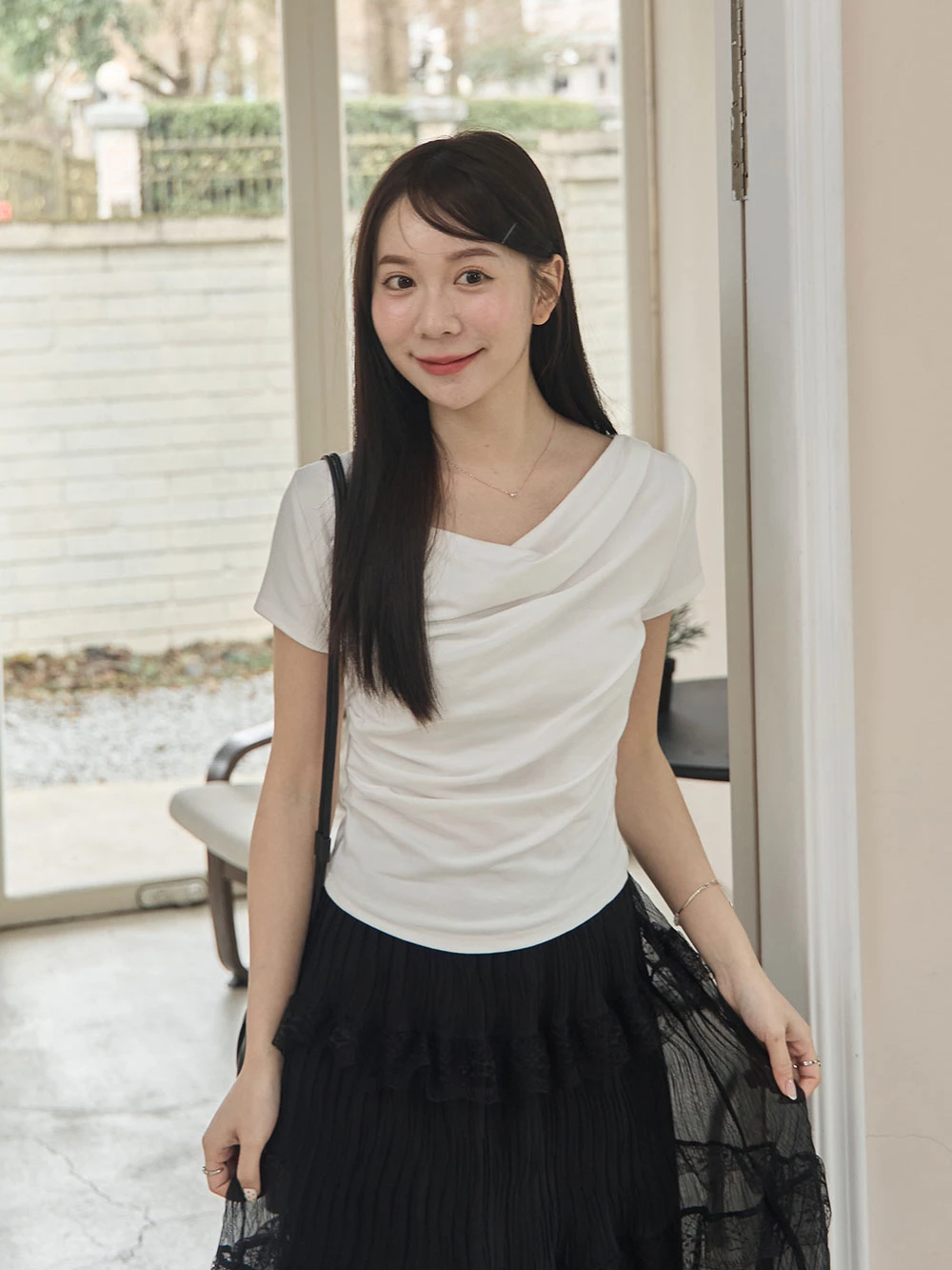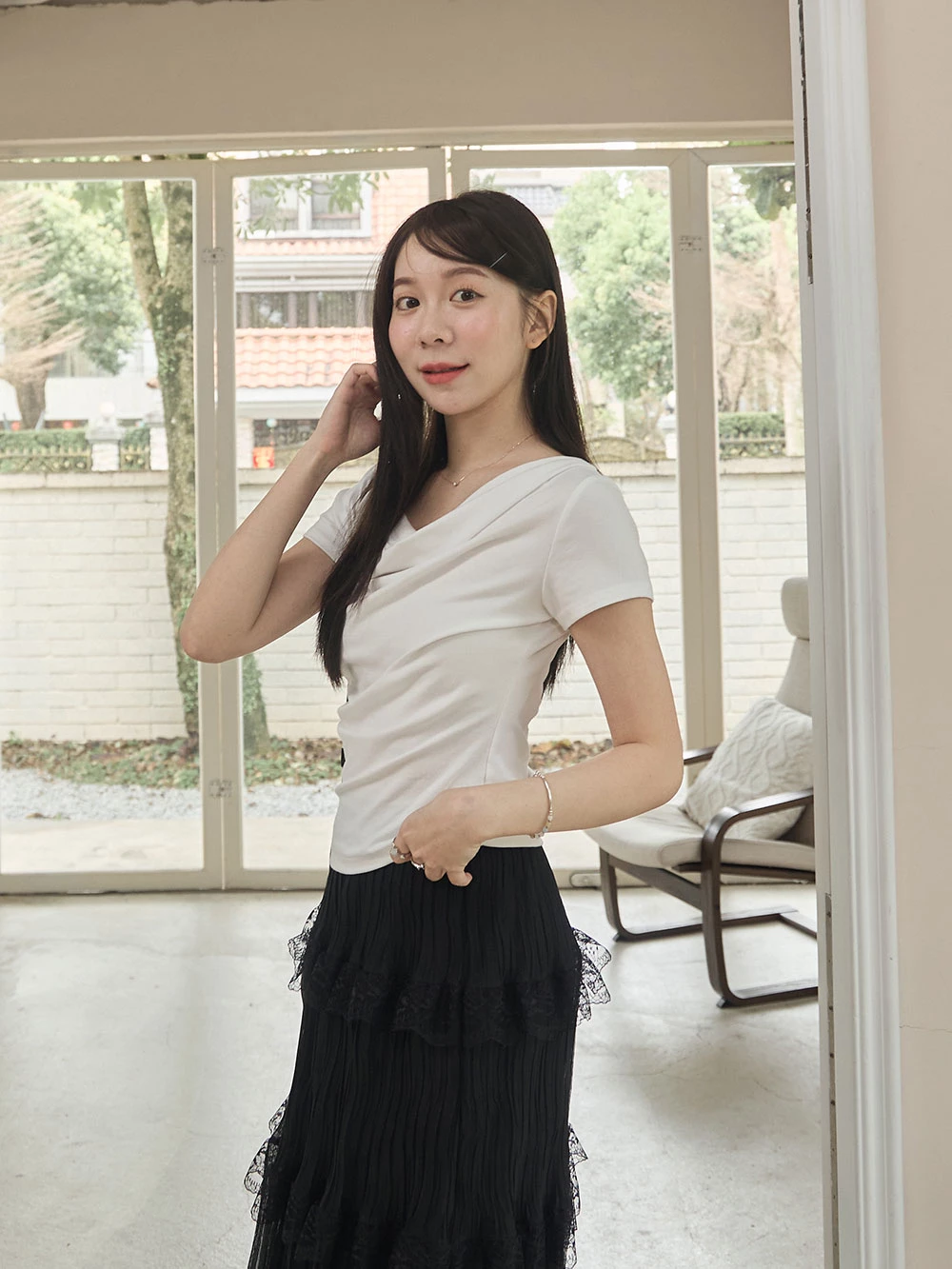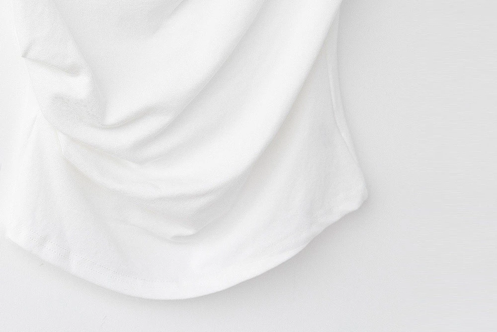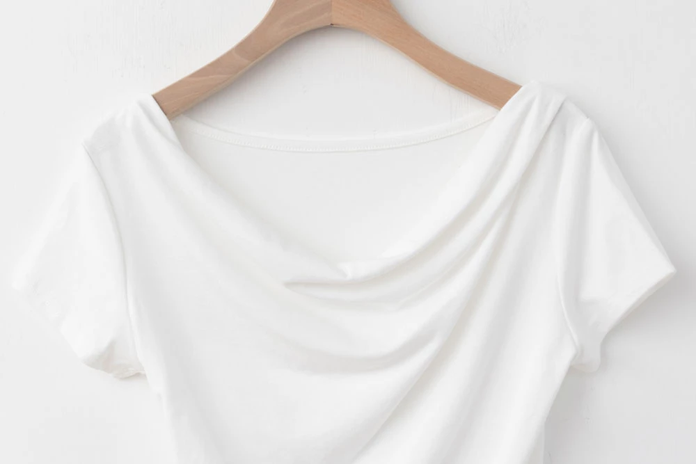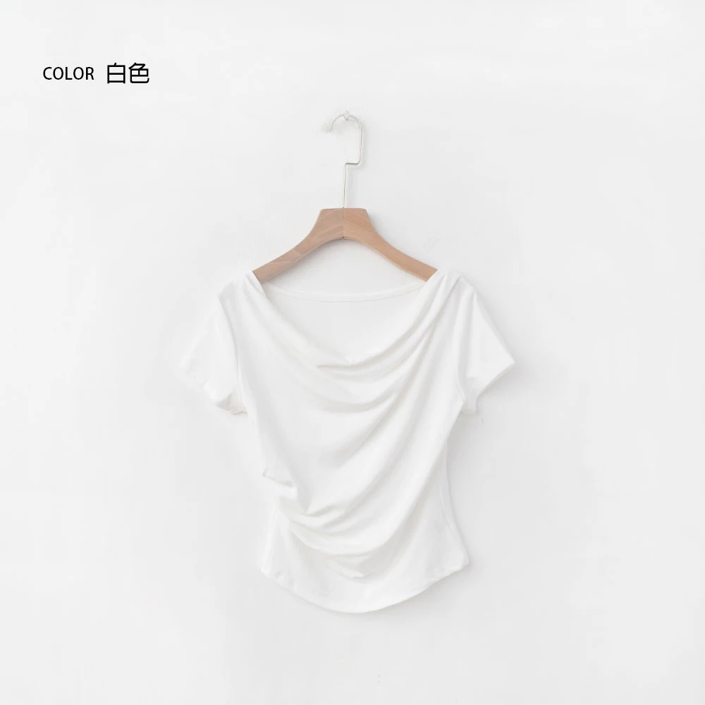 垂領抓皺柔彈短袖上衣