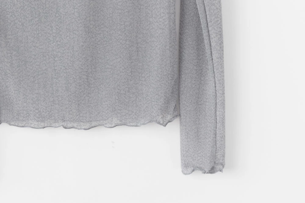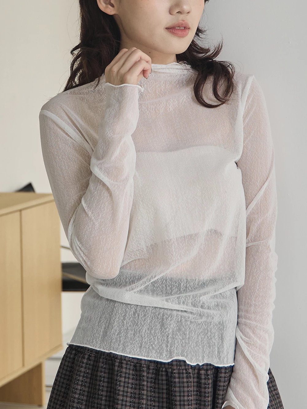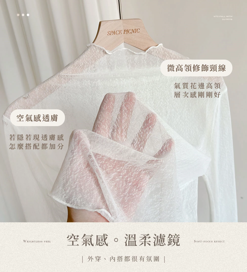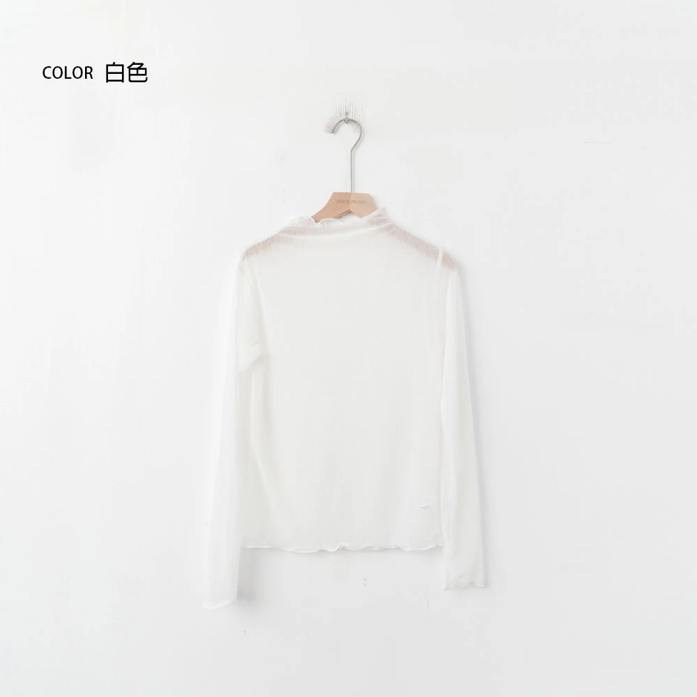 紋理感高領捲邊網紗上衣