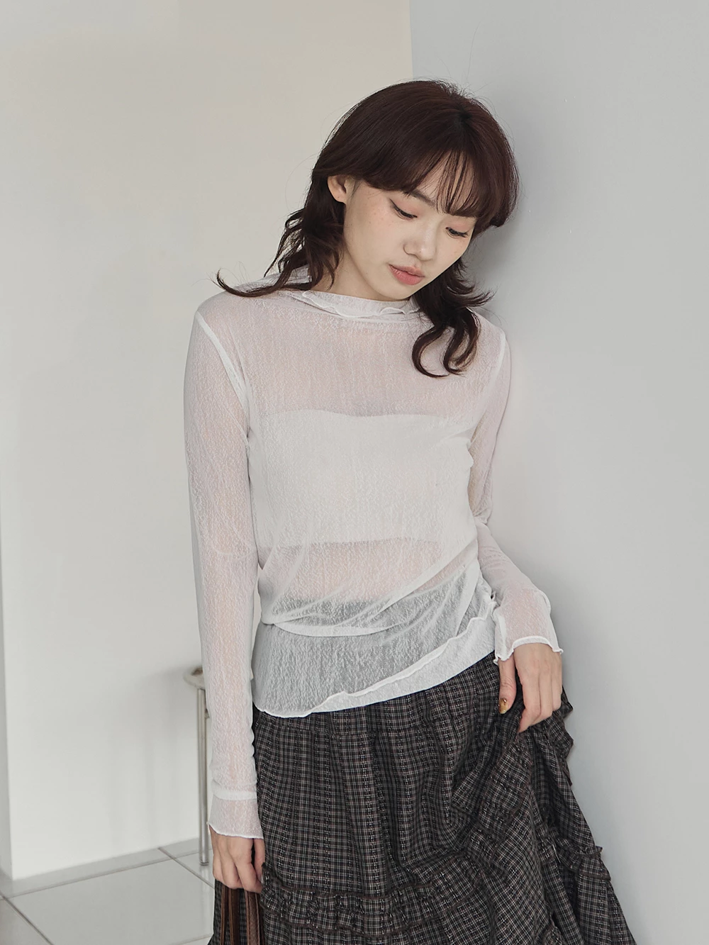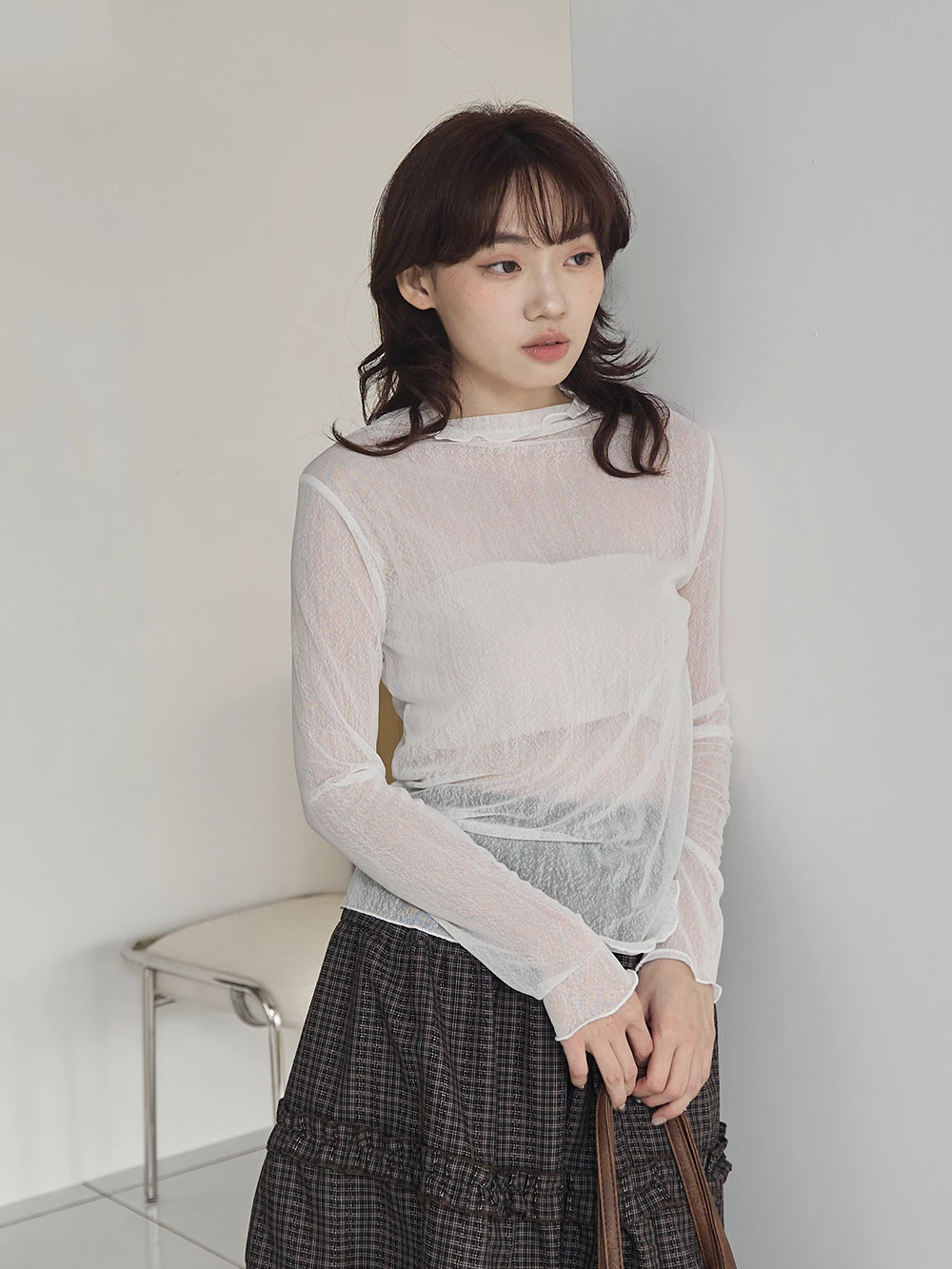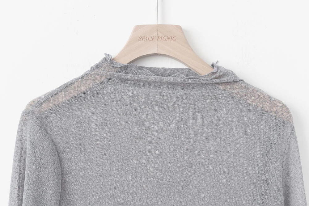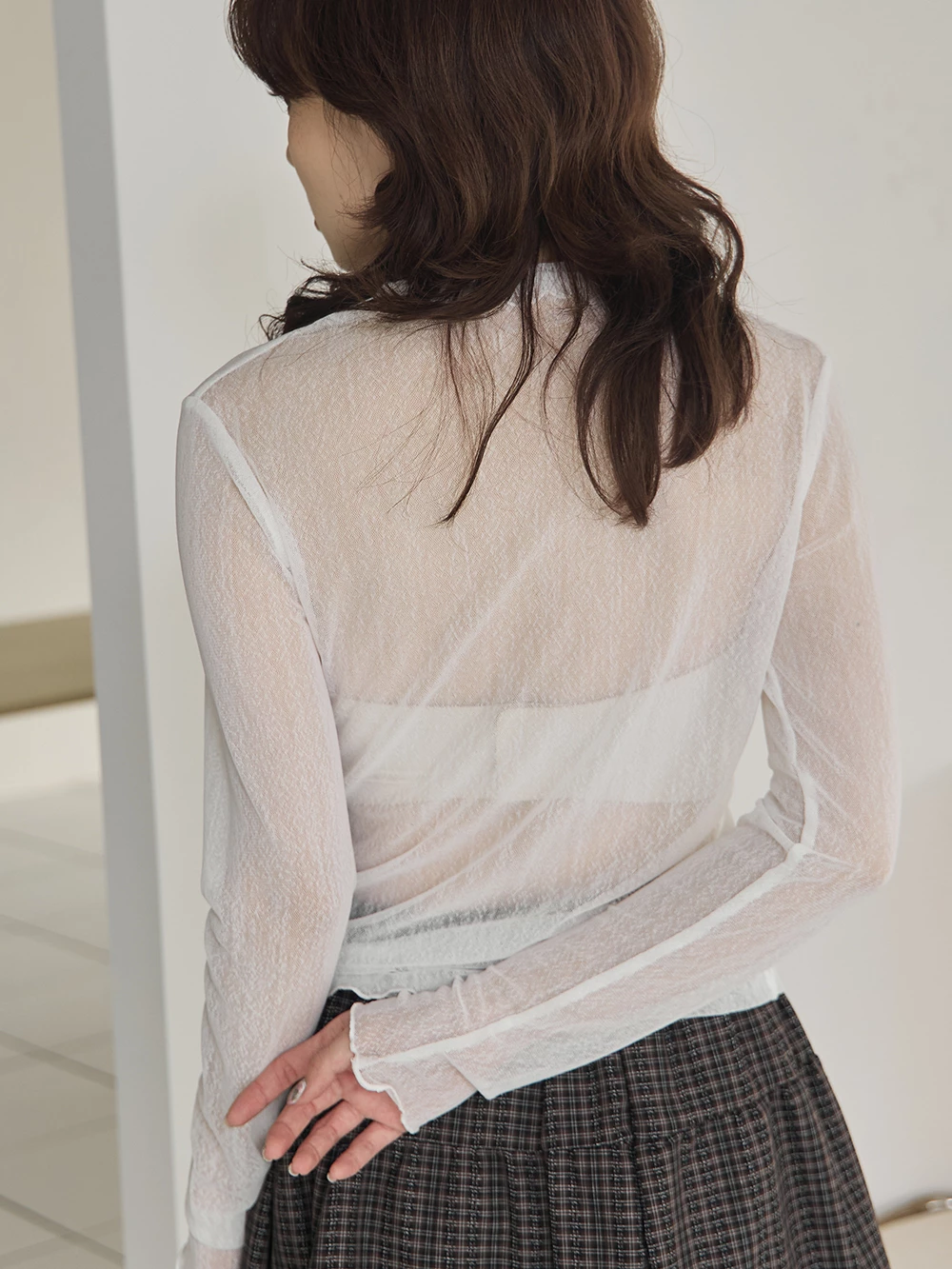 紋理感高領捲邊網紗上衣