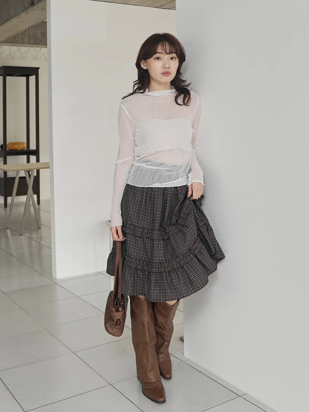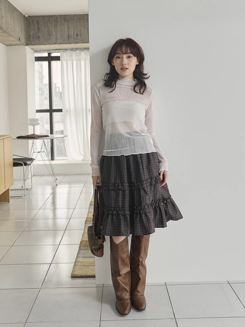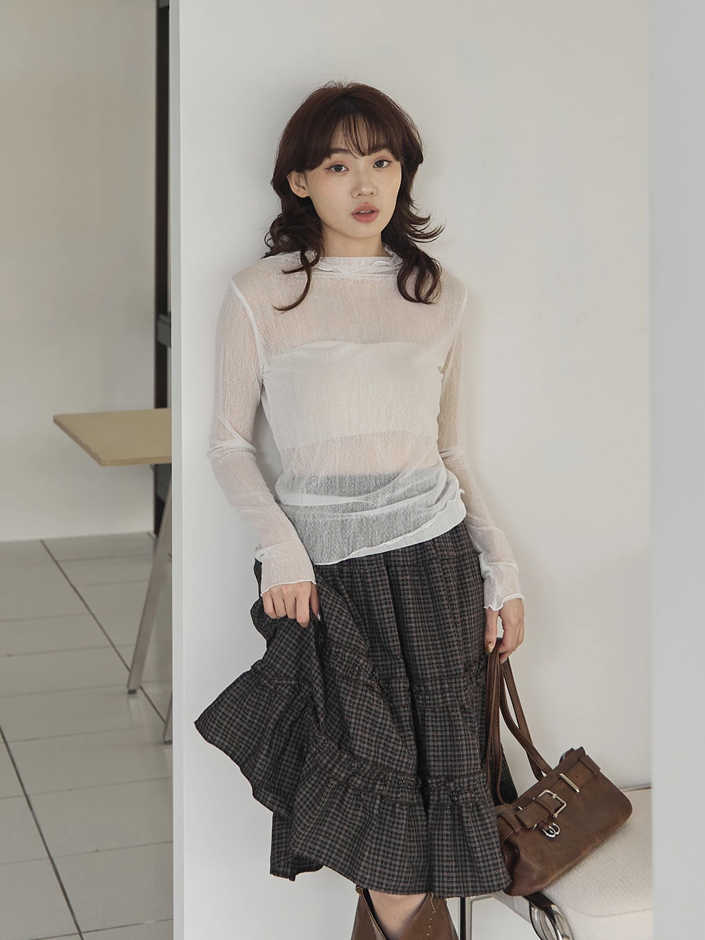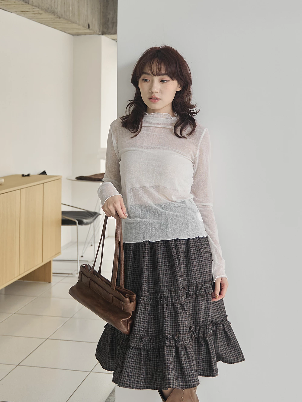 紋理感高領捲邊網紗上衣