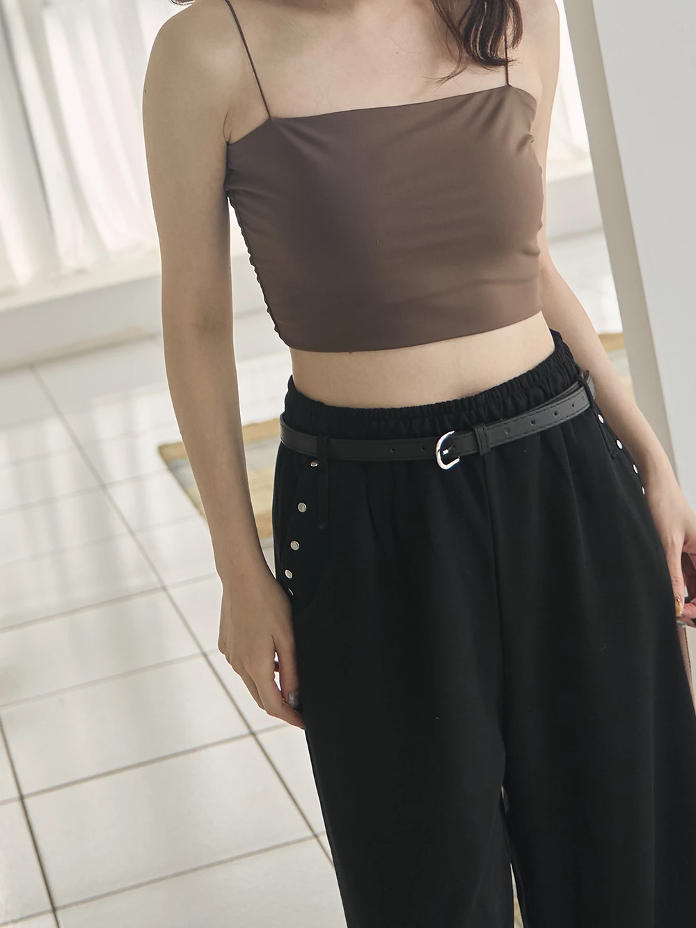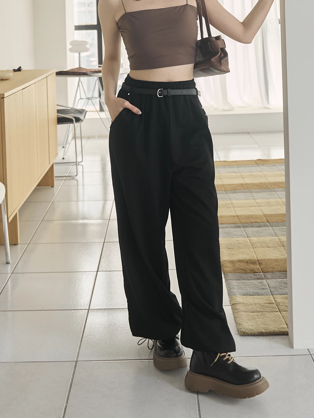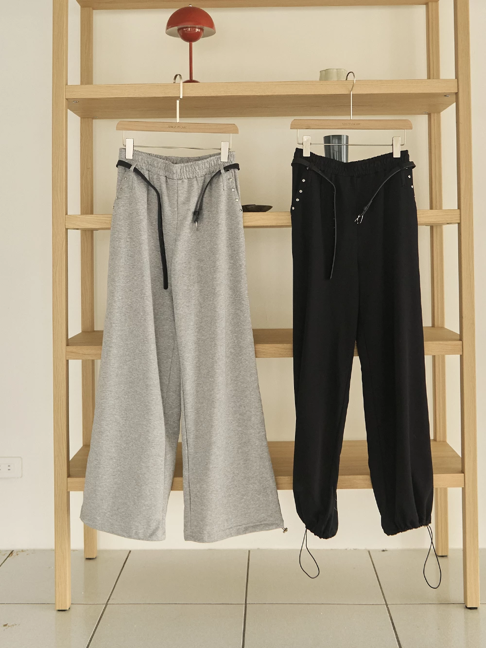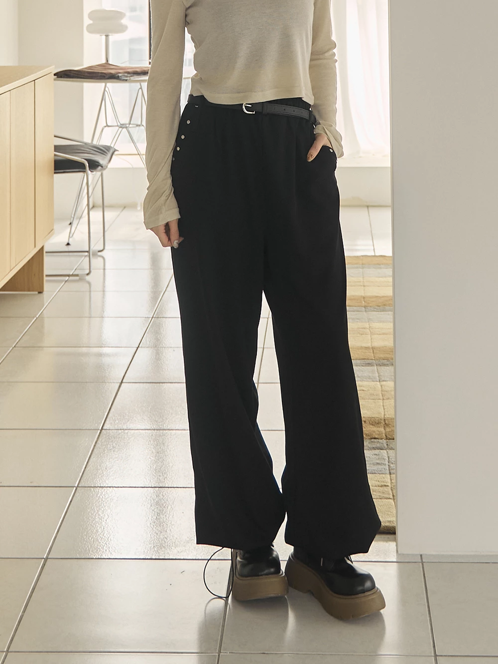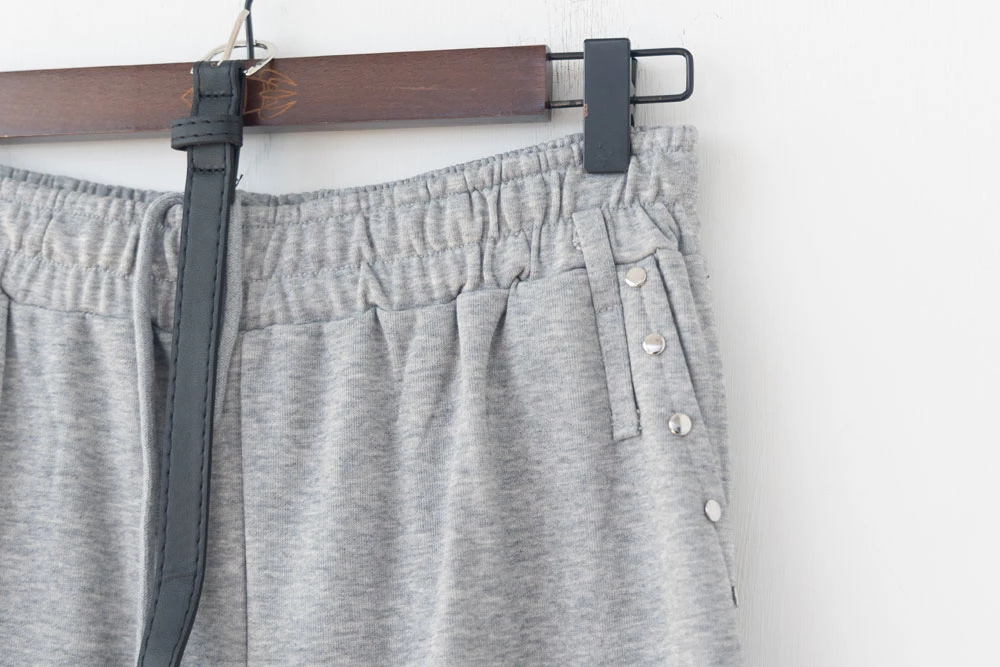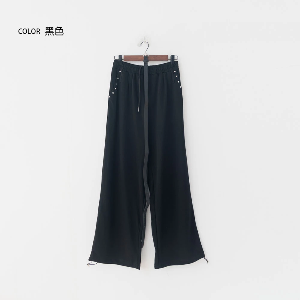 銀釦造型抽繩長褲-附皮帶