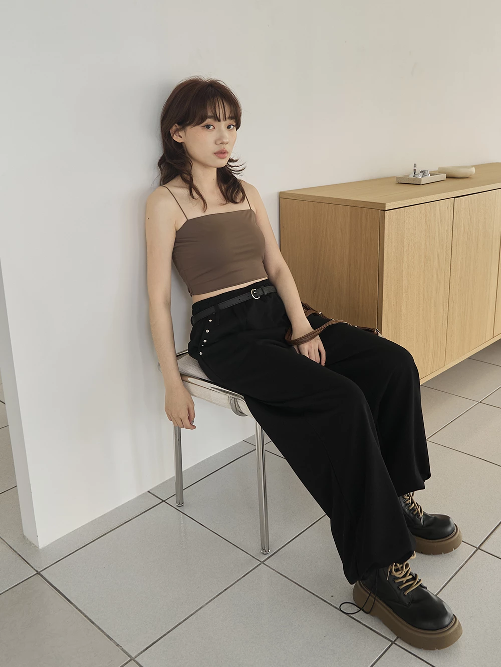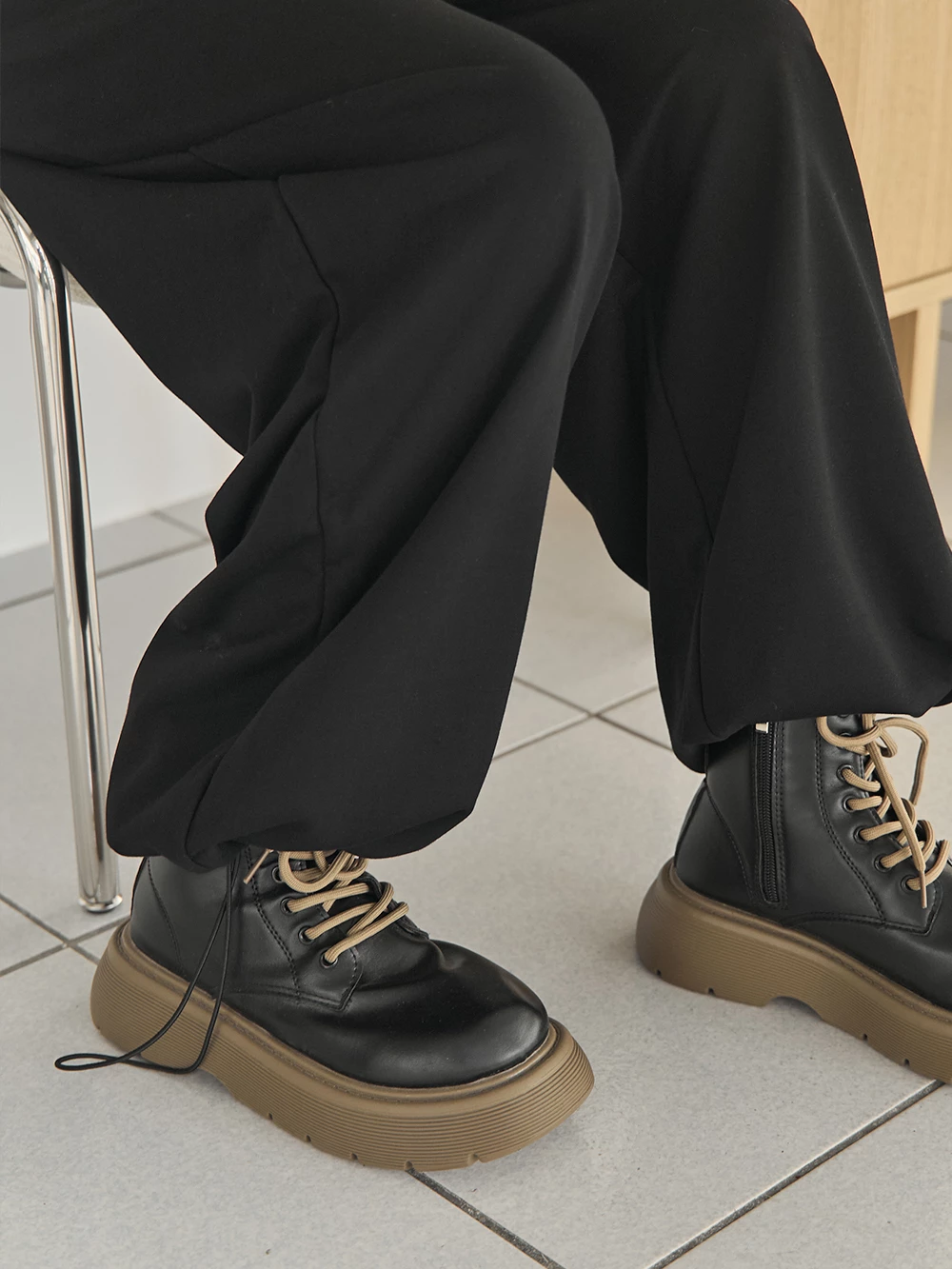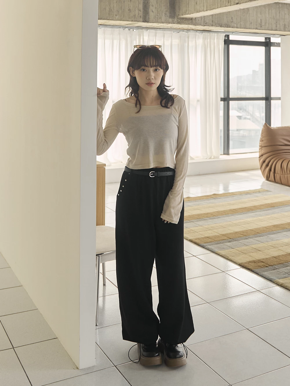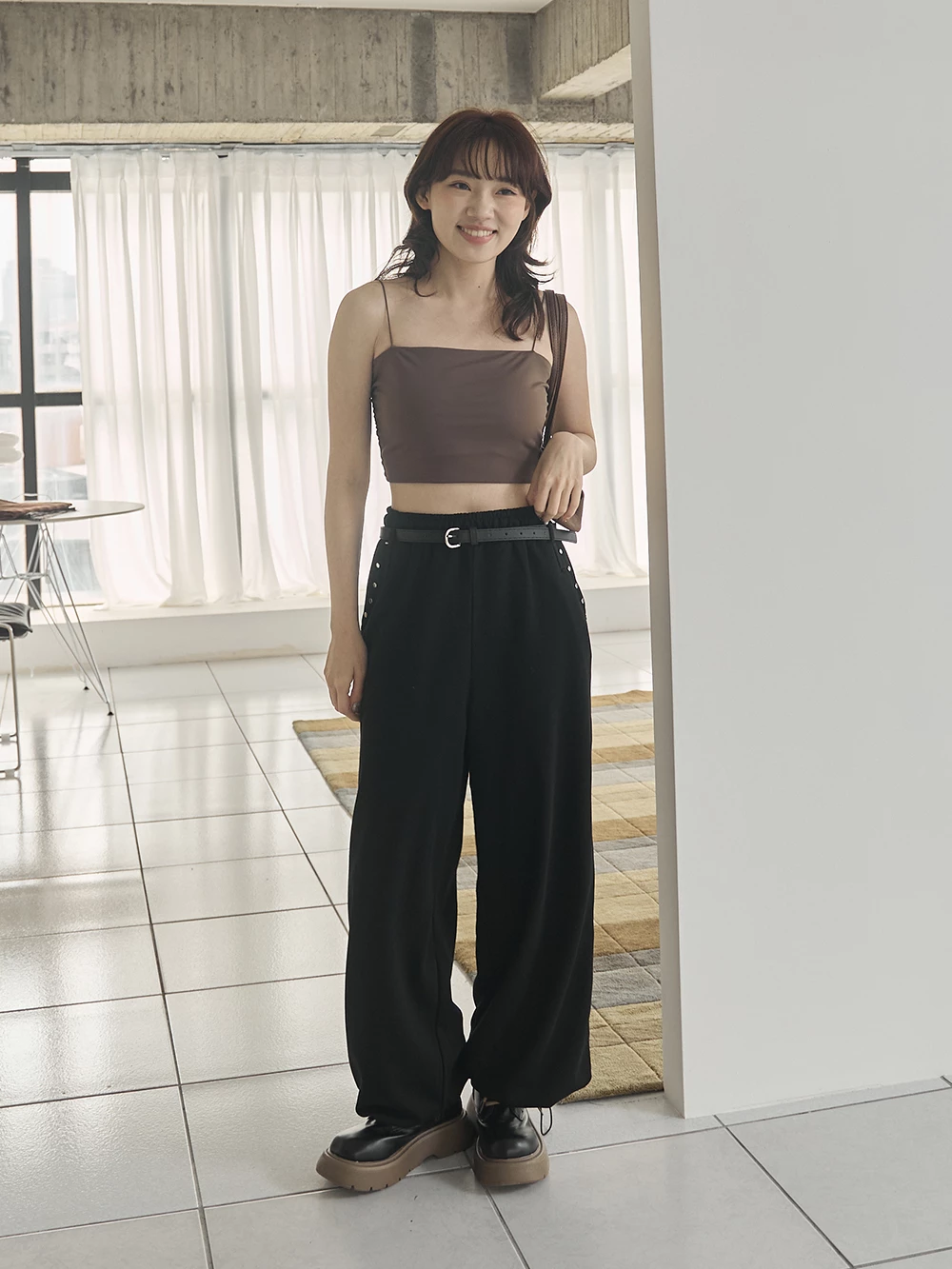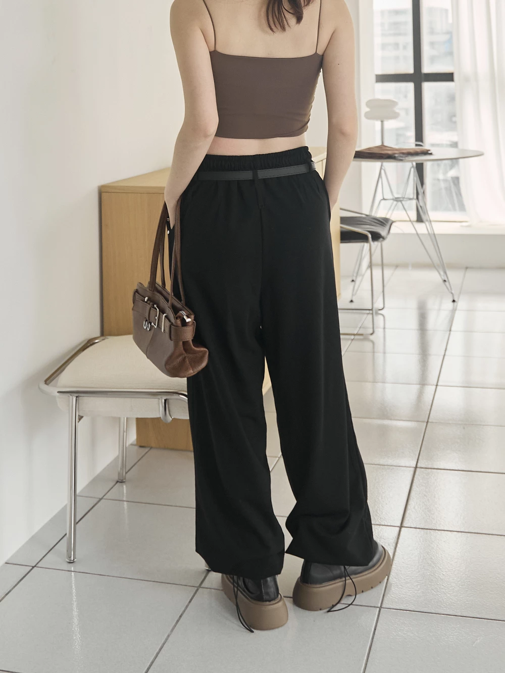 銀釦造型抽繩長褲-附皮帶