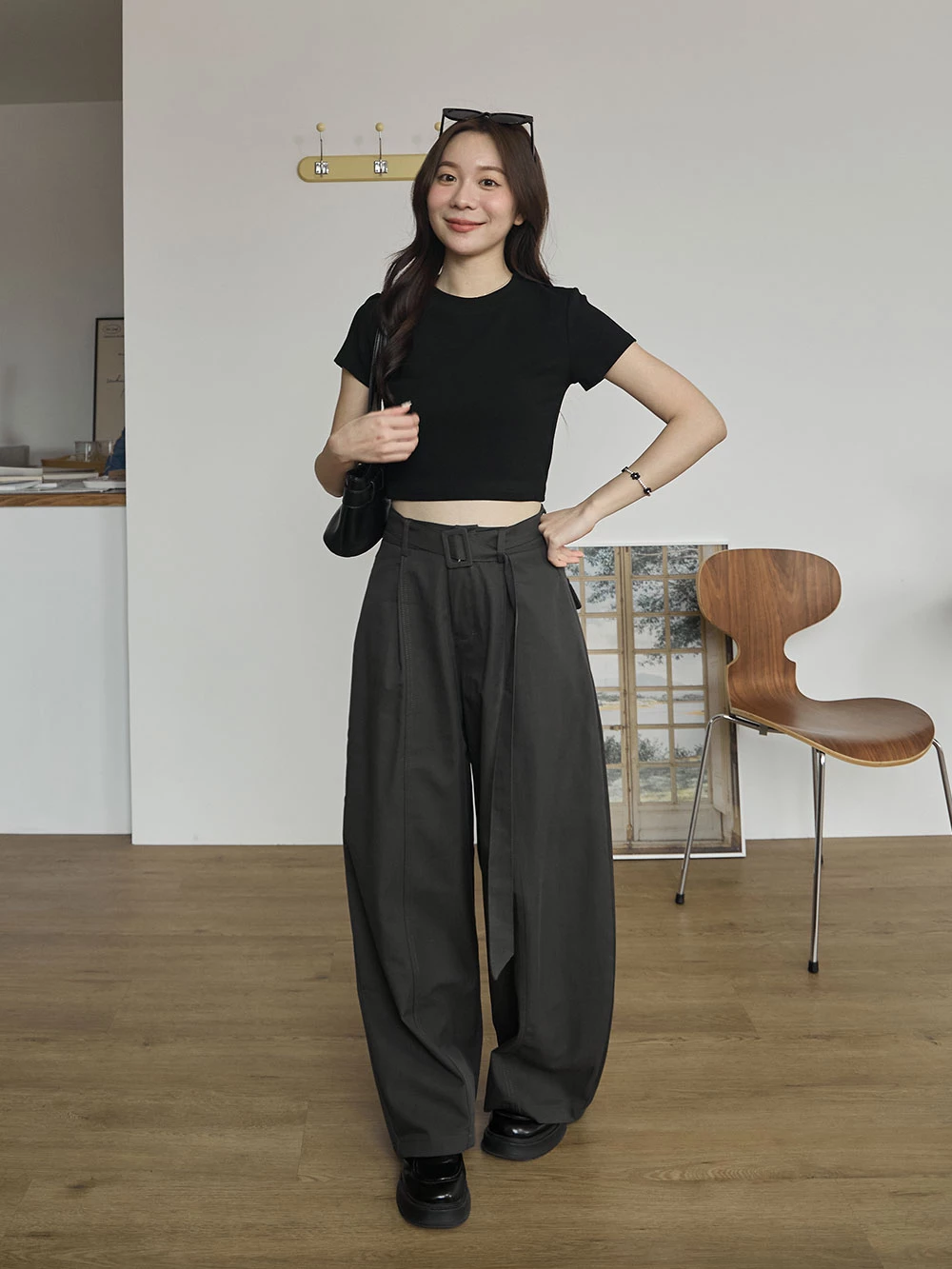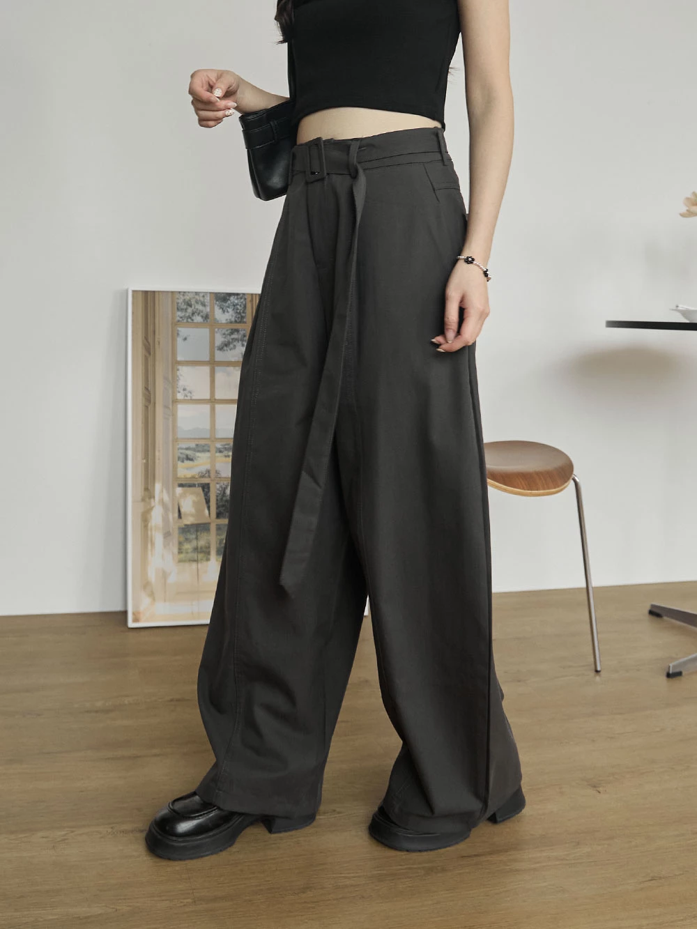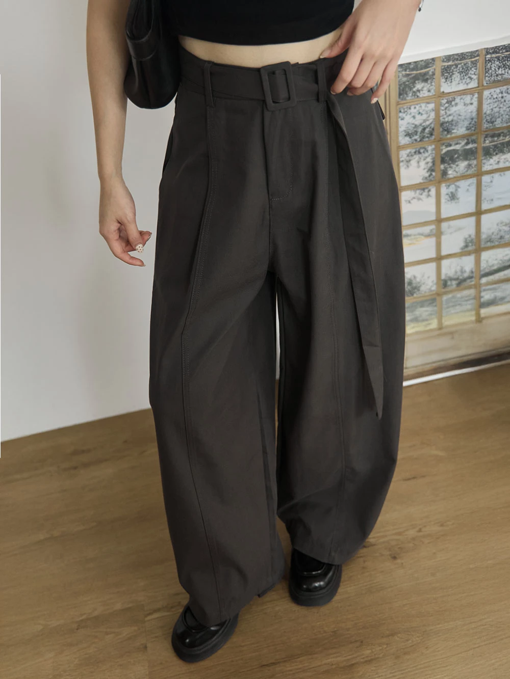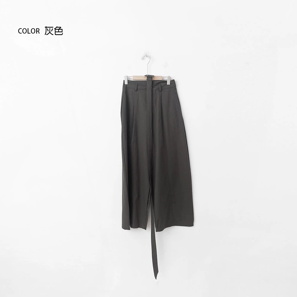 挺料斜紋打摺寬褲-附腰帶