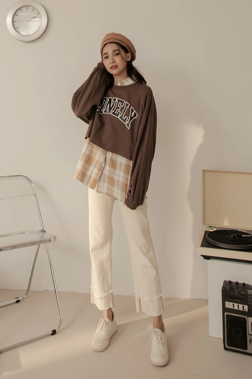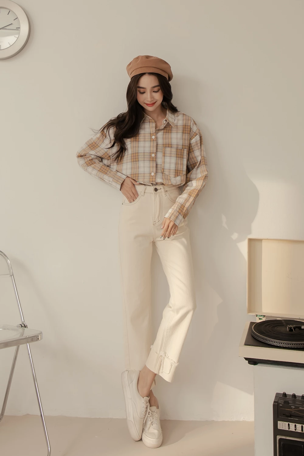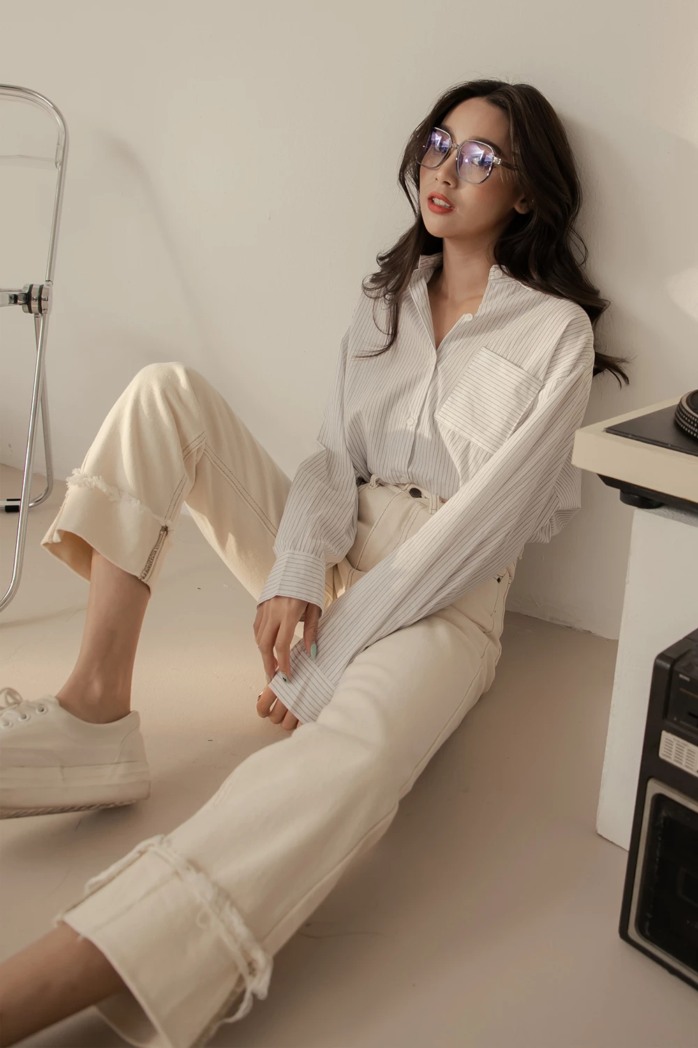 抽鬚反摺牛仔直筒褲