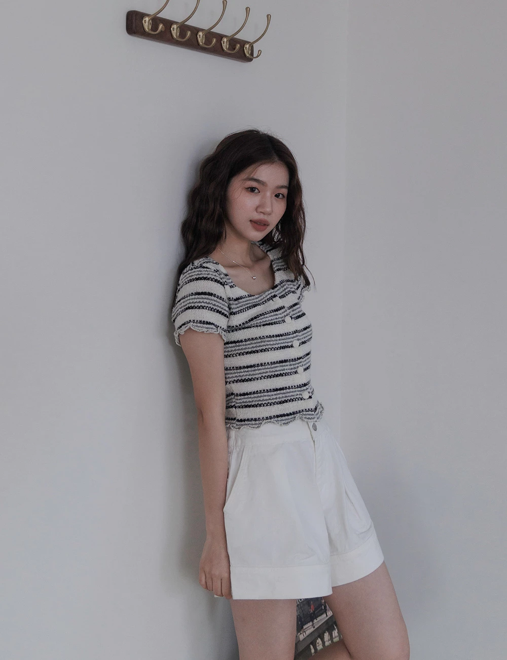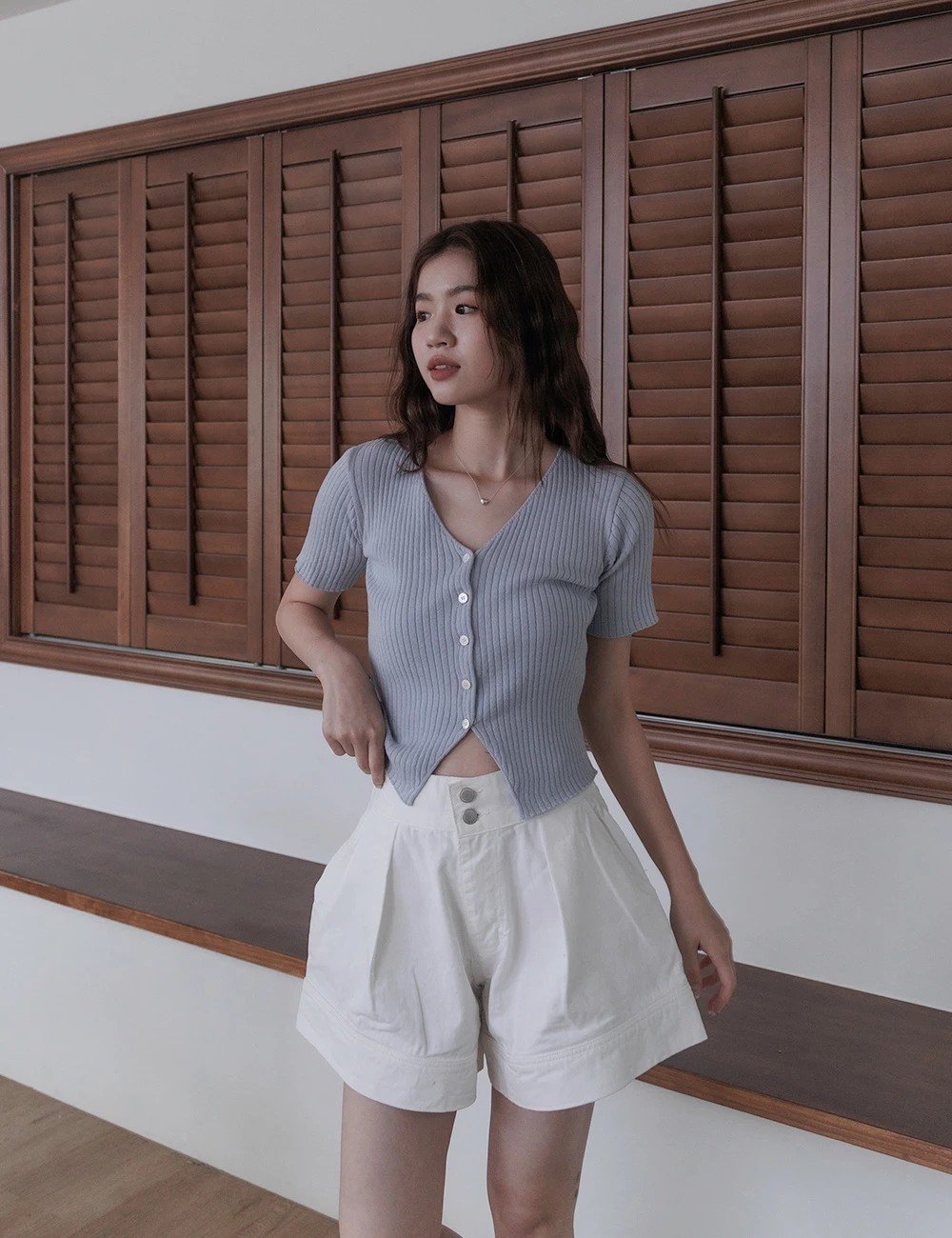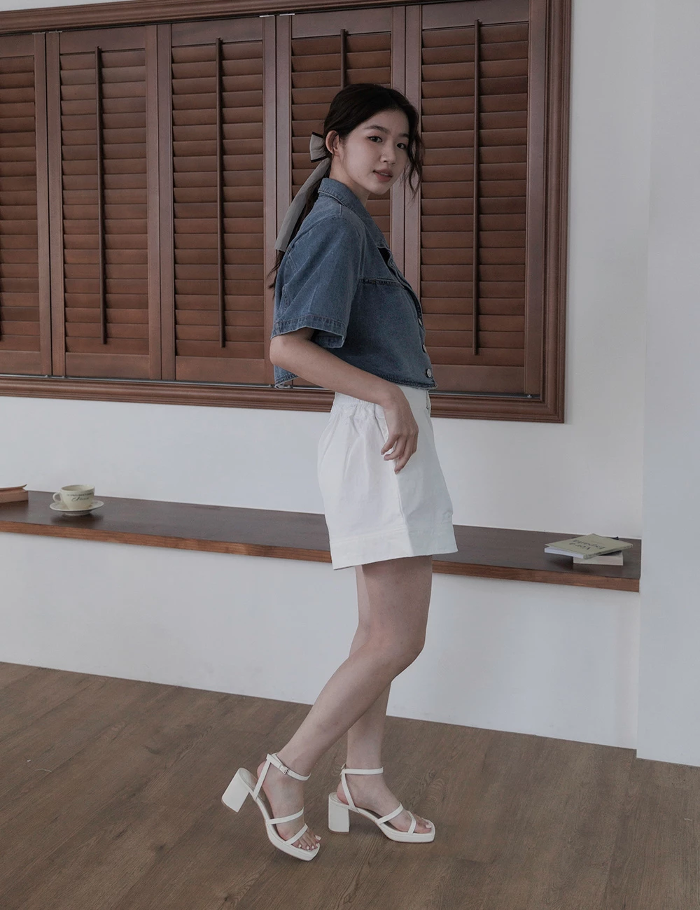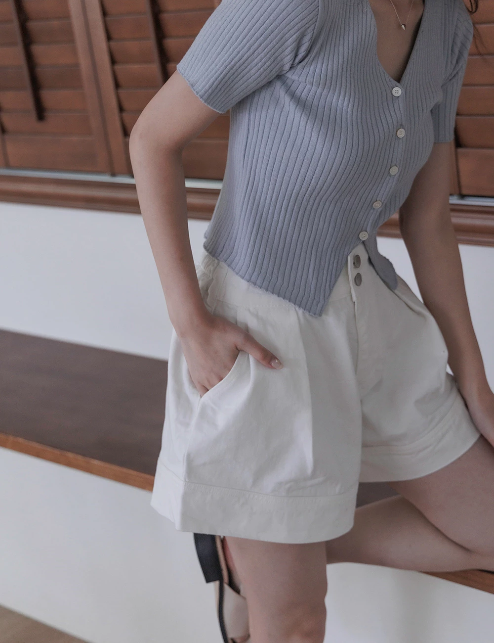 後鬆緊雙釦牛仔短褲